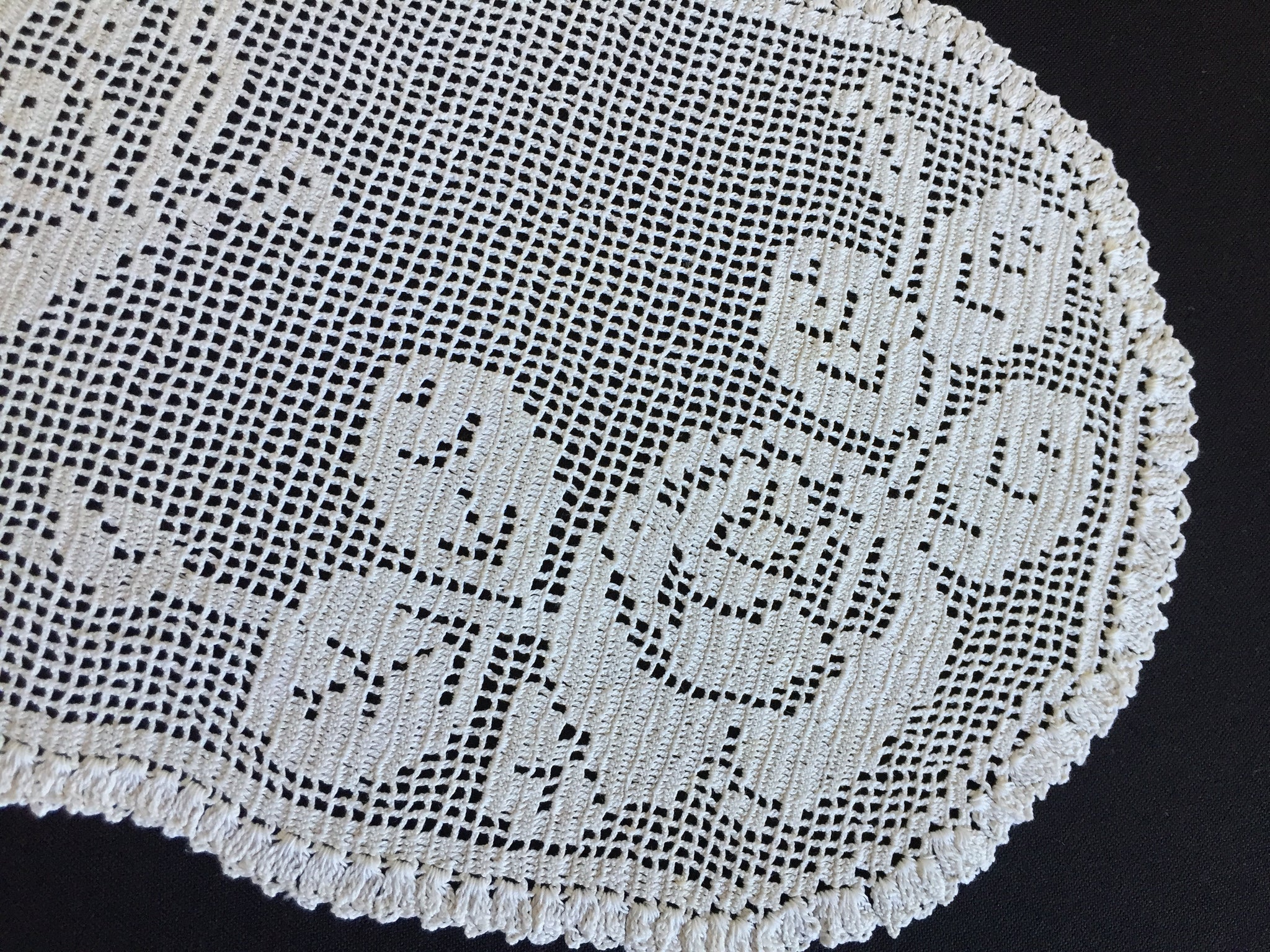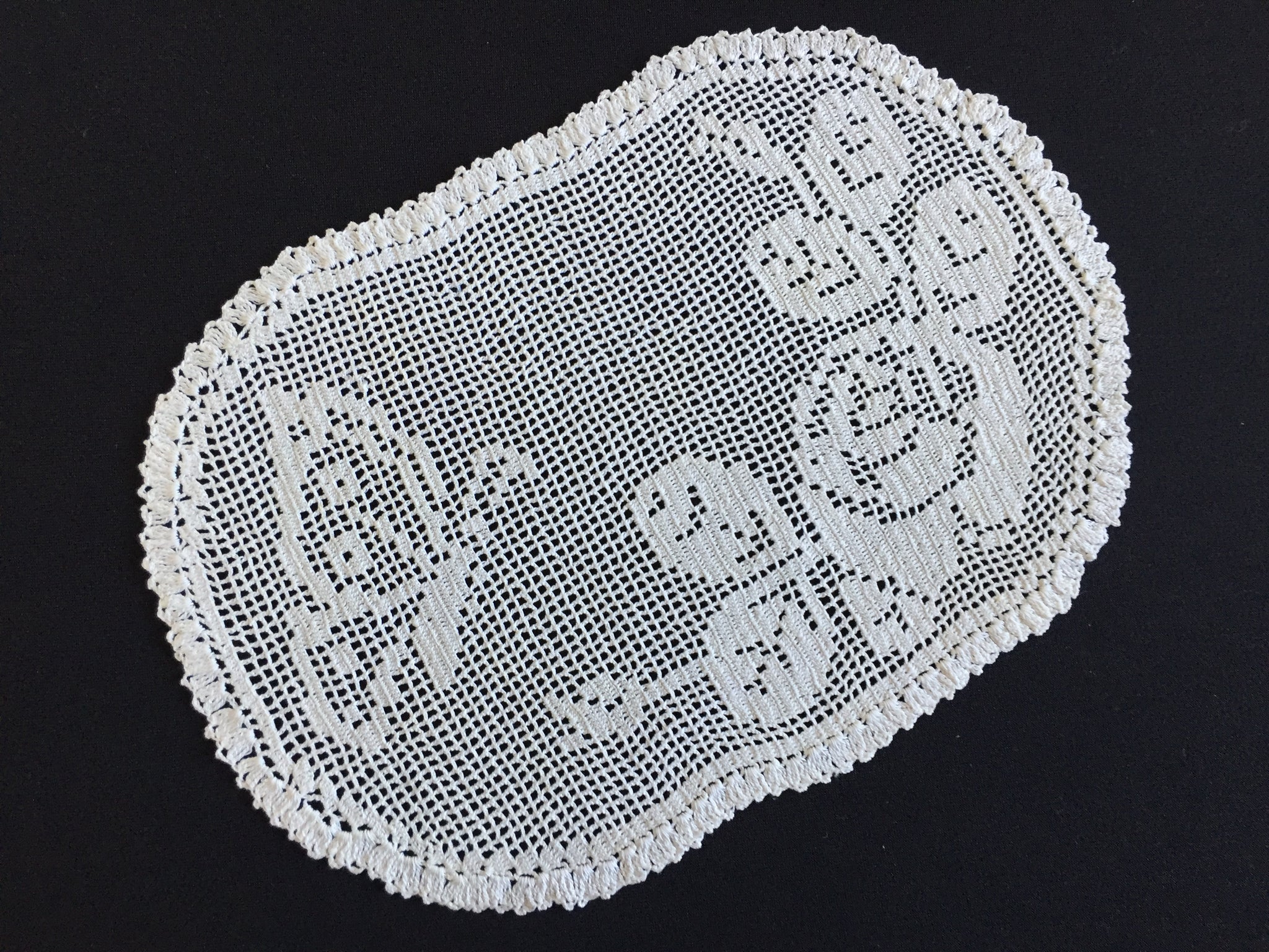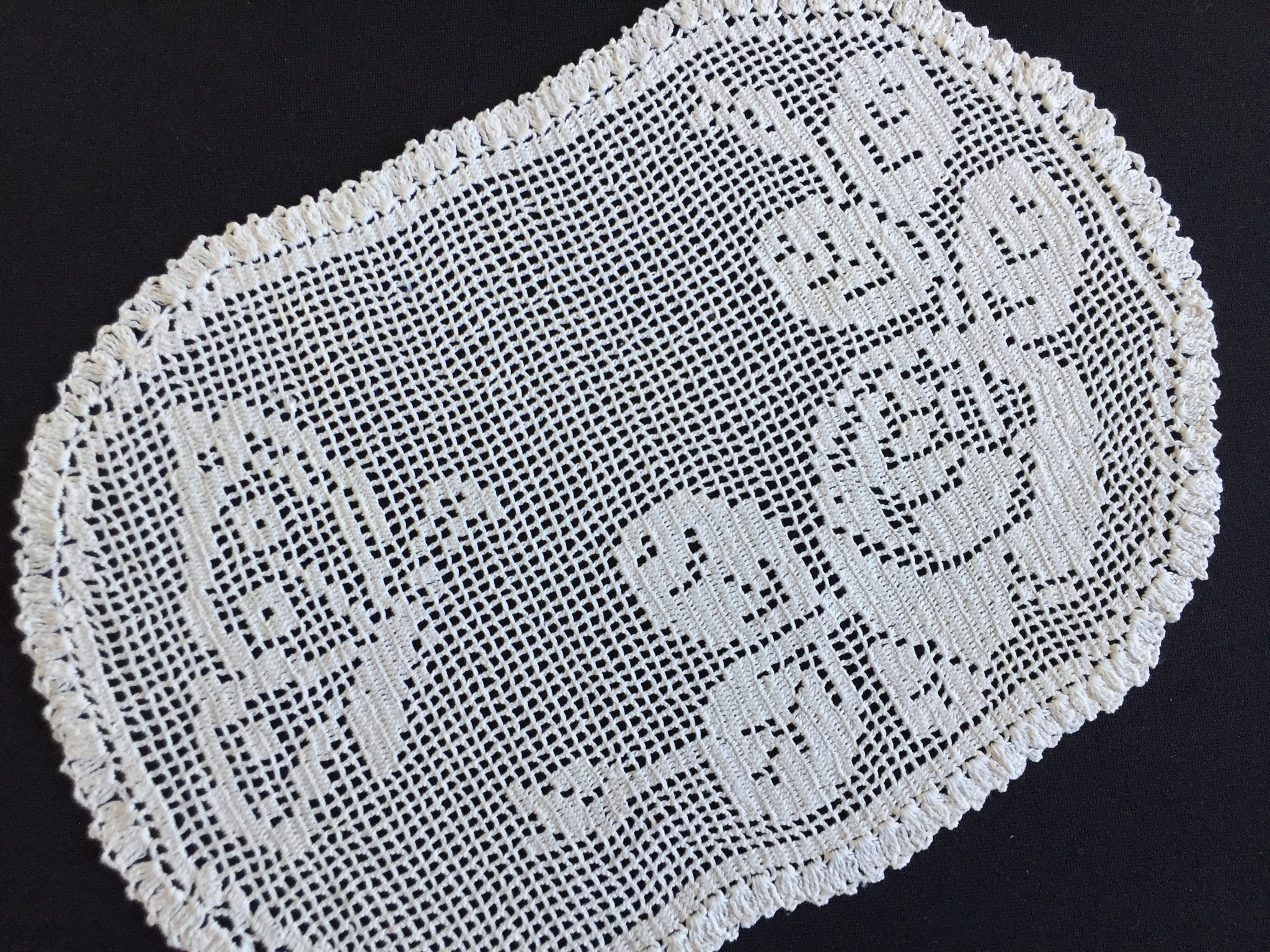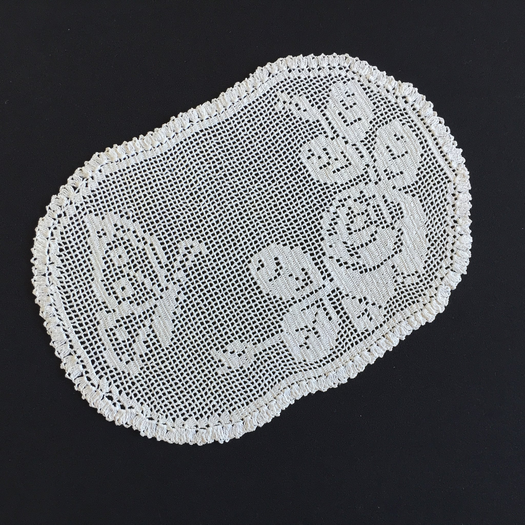 A treasured piece of Edwardian craftsmanship, this 23 x 17cm filet crochet doily showcases exquisite rose and butterfly motifs worked in fine white cotton. Originally designed to protect silver sandwich trays during formal gatherings, it embodies the refined practicality of early 1900s entertaining. Each hand-stitched detail reveals the precision and artistry of period needlework—a skill increasingly rare today. Perfect for collectors seeking documented heirloom pieces, decorators embracing cottagecore aesthetics, or makers exploring slow stitching and upcycling. The gentle imperfections speak to its authentic vintage heritage, adding character and narrative. Investing in such handmade textiles is inherently sustainable: enduring quality crafted with care, ready for a new chapter of appreciation and use.