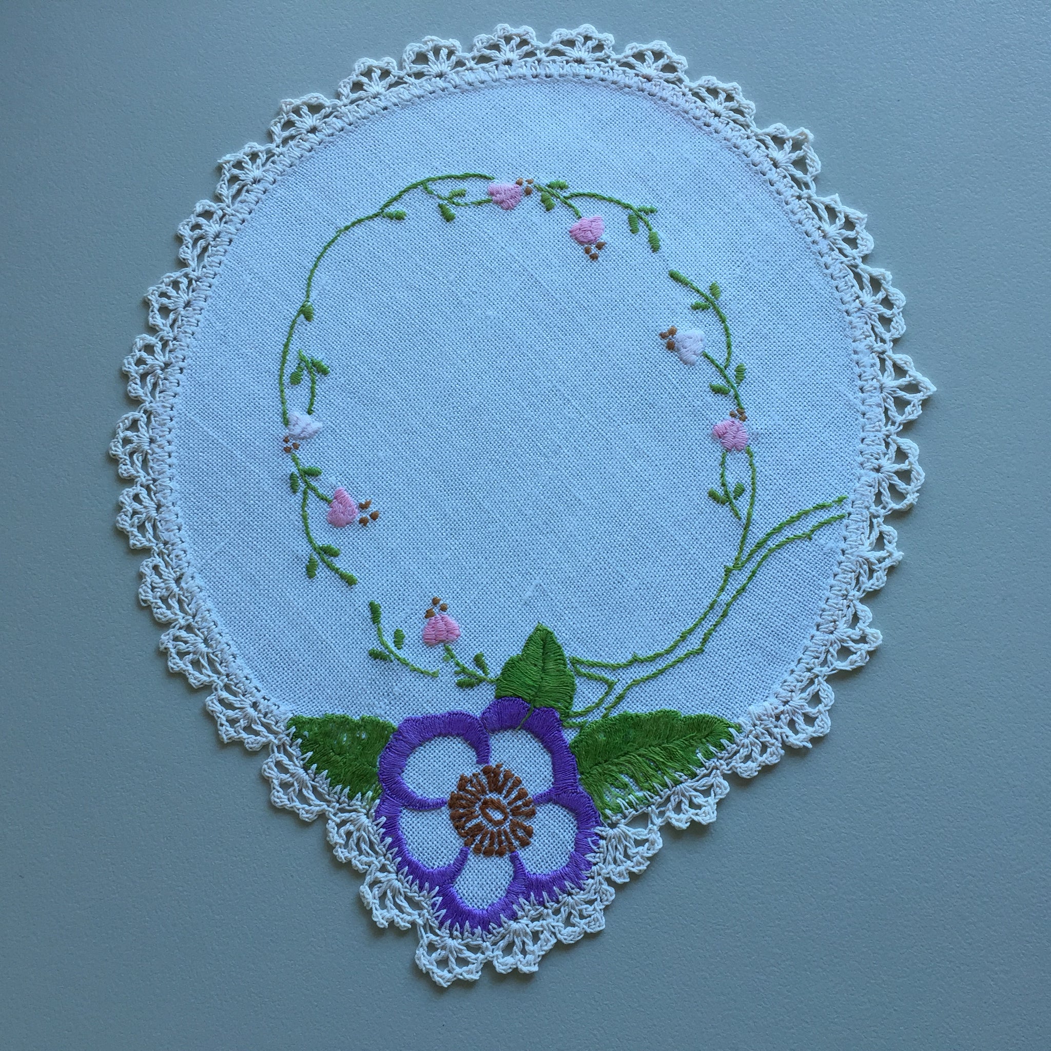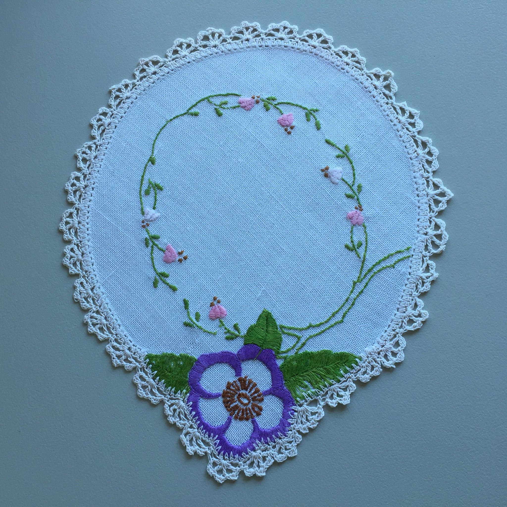 Vintage Hand Embroidered Linen Doily with Crochet Lace Edge