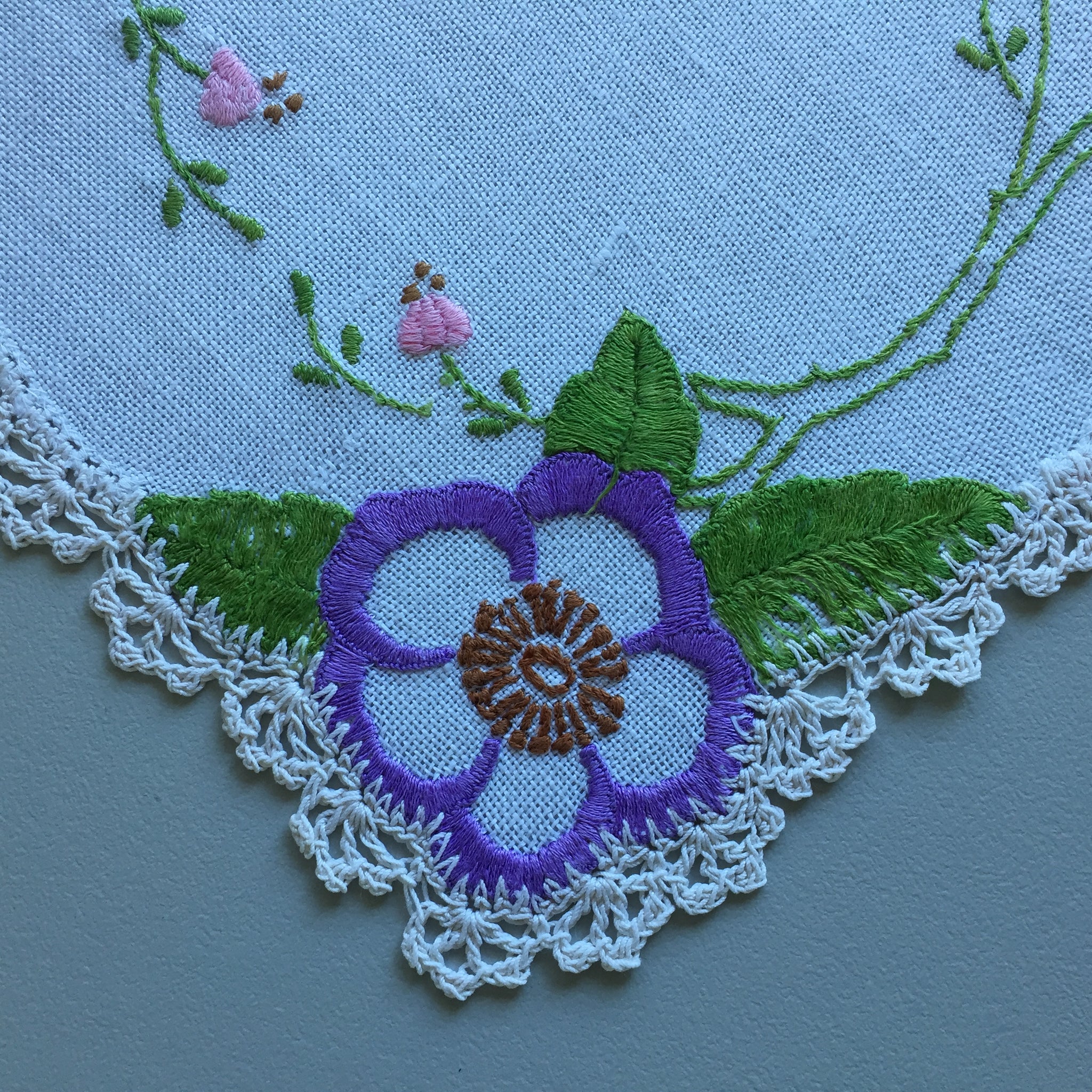 Genuine vintage doily with hand-embroidered purple flower on natural linen, finished with a delicate crocheted ecru cotton edge. Approximately 20 x 24 cm. Part of Australia's cherished "glory box" tradition from the 1930s–1950s, these handmade pieces are now rare treasures. Perfect for collectors, cottagecore décor, or slow stitching projects. Very good condition, clean and ready to be loved again.