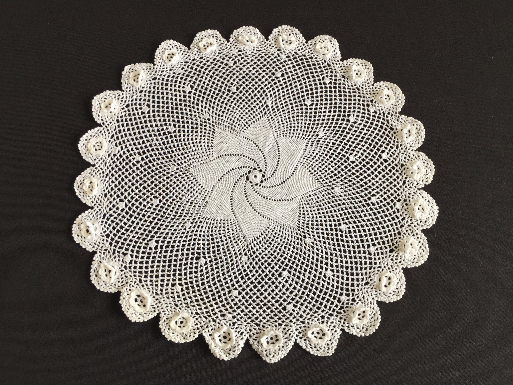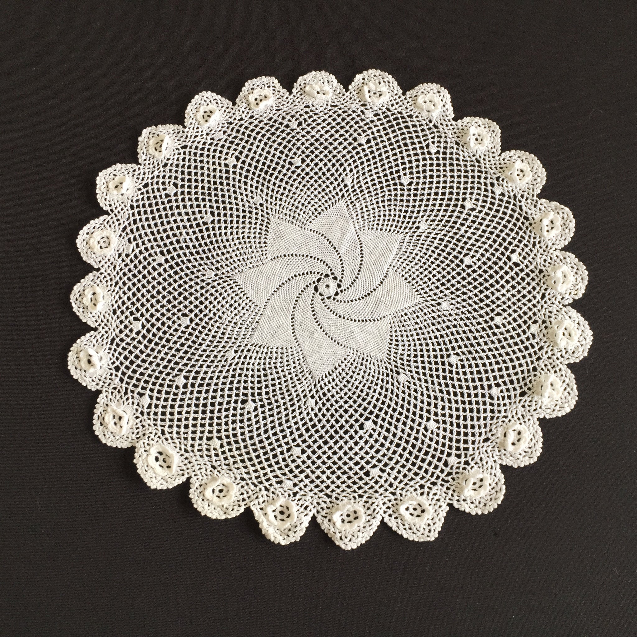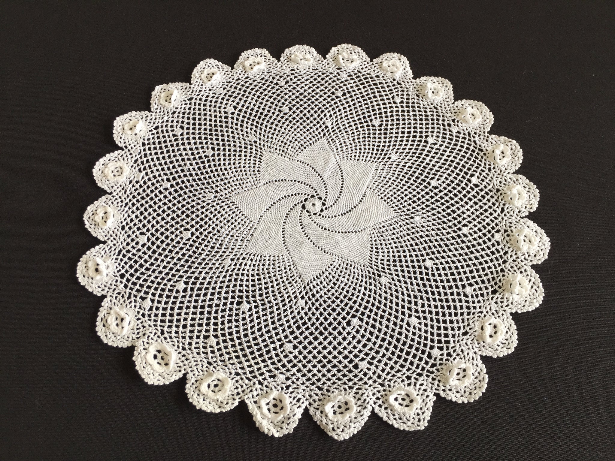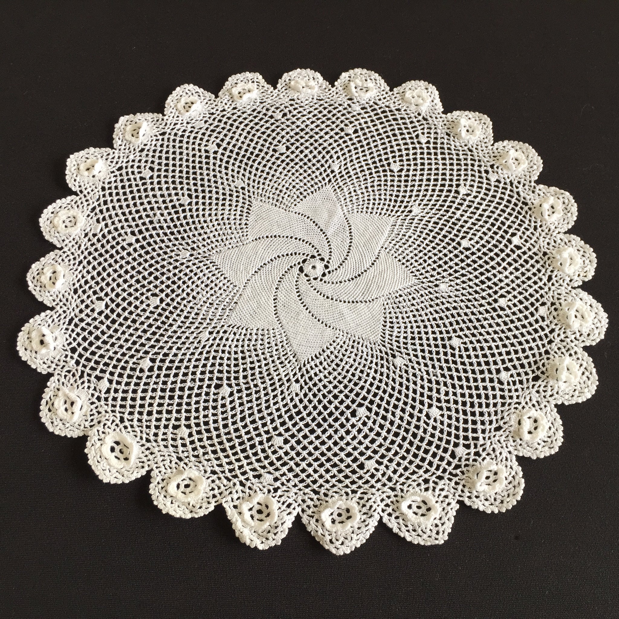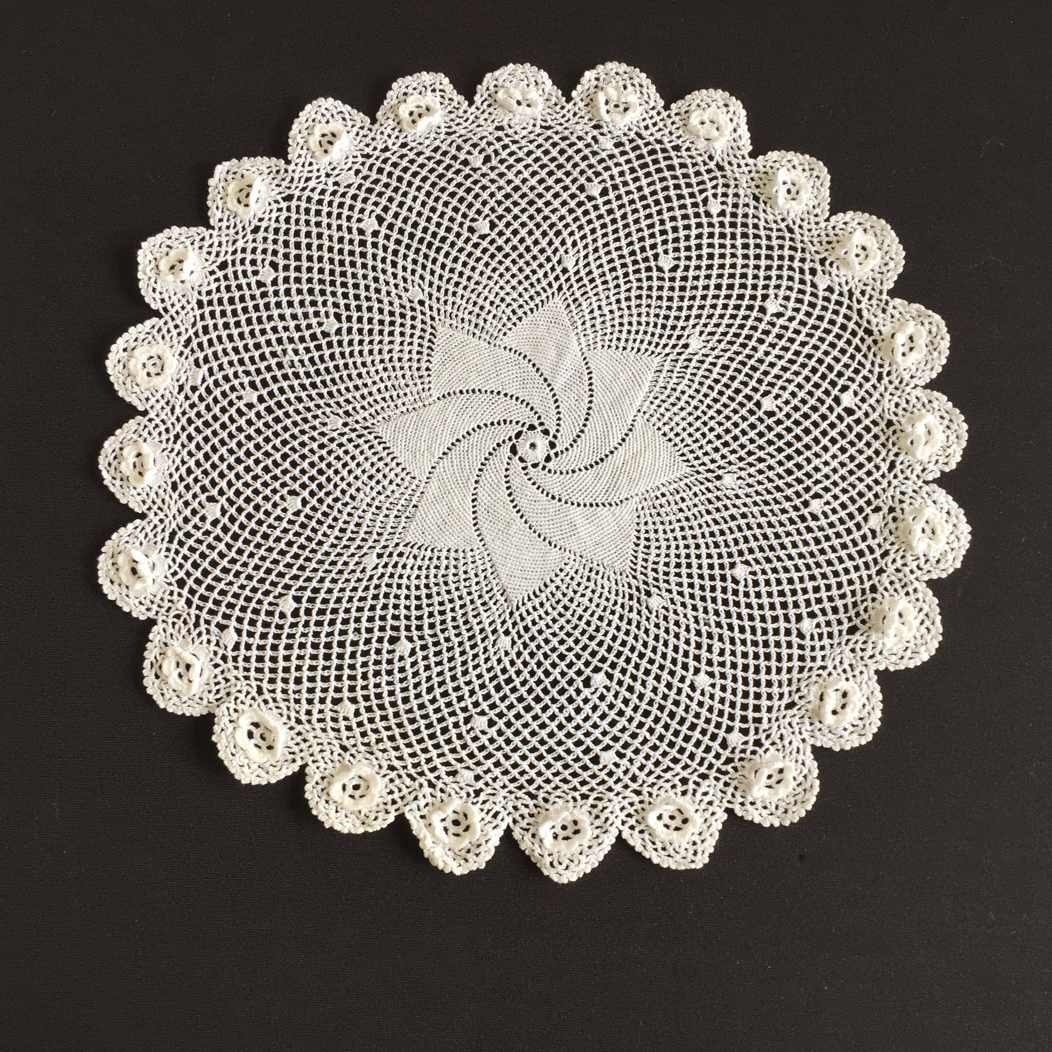 Vintage White Cotton Crochet Lace Doily with Pinwheel & Irish 3D Roses Pattern