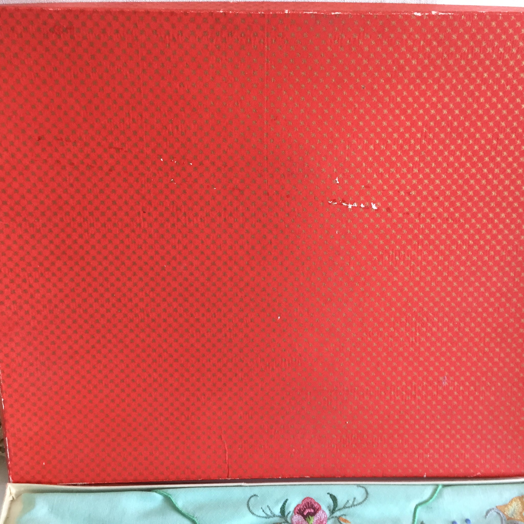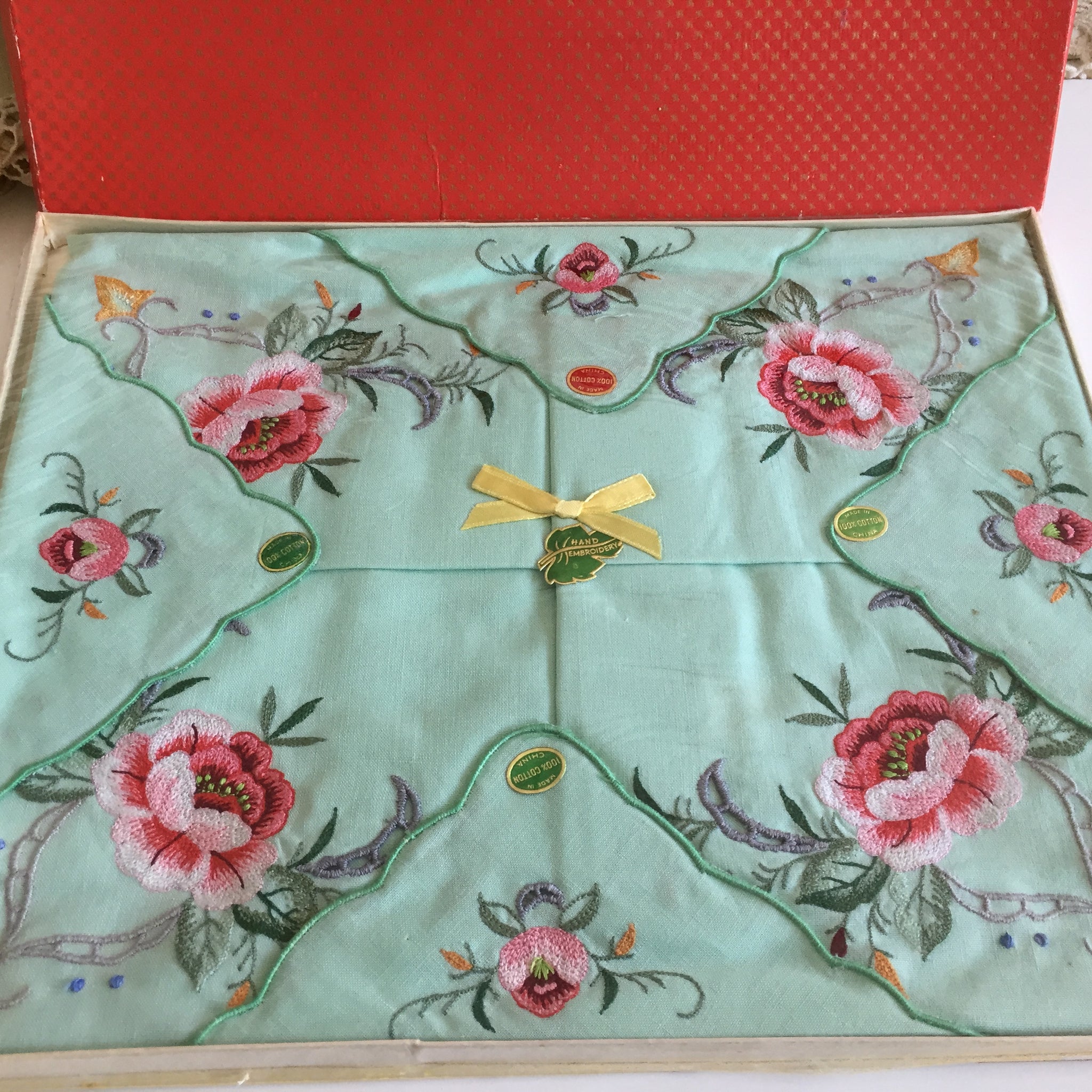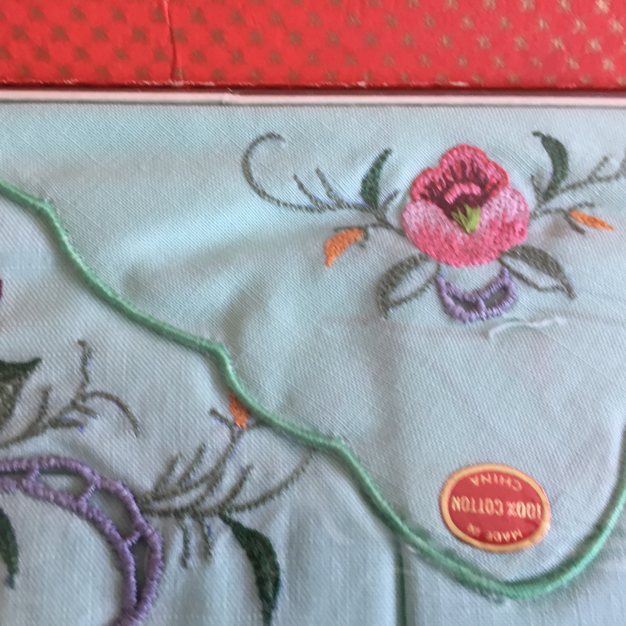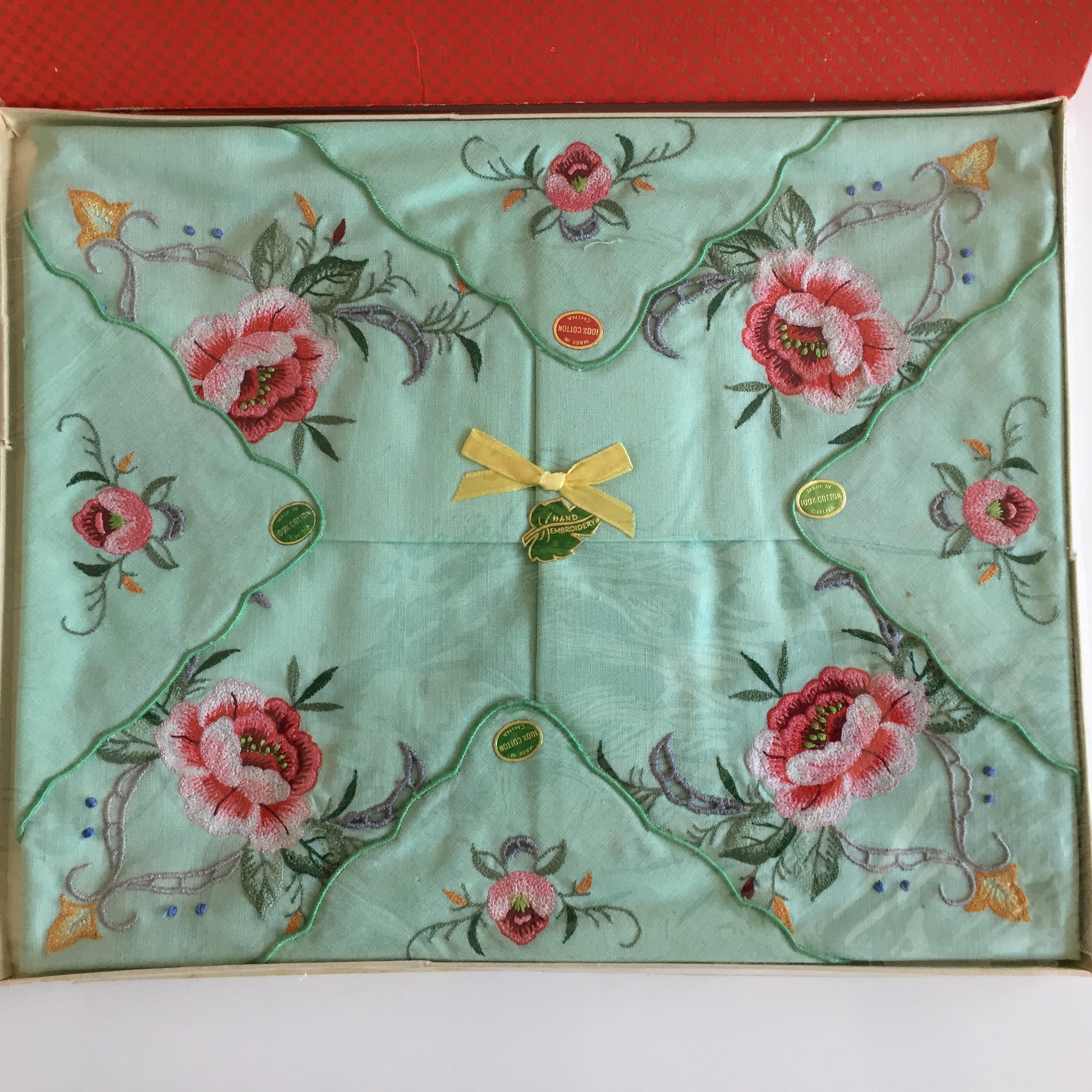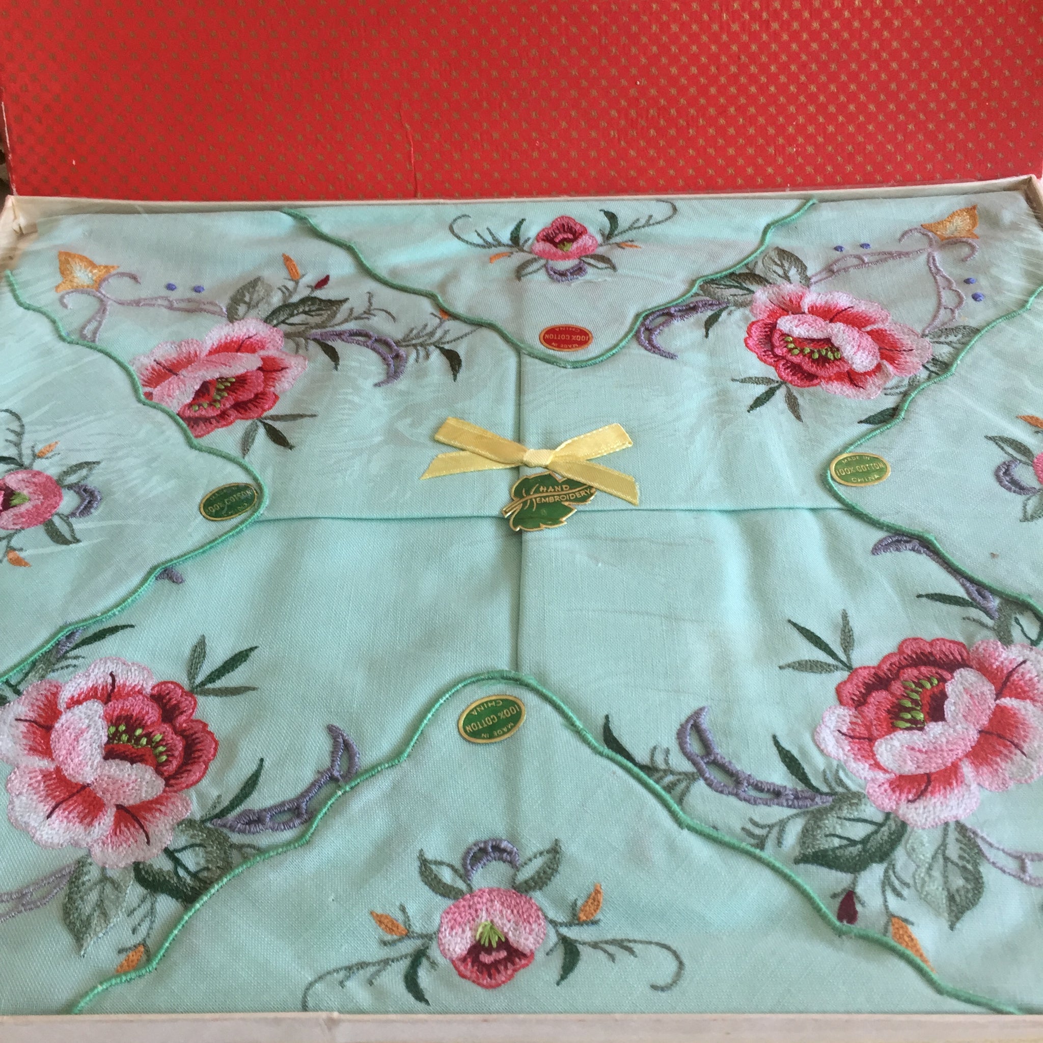 A timeless five-piece table linen treasure from the 1970–90s, this pristine vintage set features machine-embroidered red roses on soft green cotton. Never used and still in original packaging, it arrives with labels intact—a rare find for collectors and vintage enthusiasts. The generous tablecloth (approximately 75–85 cm square) pairs beautifully with four coordinating napkins (24–28 cm), perfect for creating an intimate, romantic table setting. The delicate floral embroidery showcases the craftsmanship of a bygone era, with each rose meticulously rendered in rich detail. The soft green cotton base provides an elegant canvas that complements both traditional and contemporary décor, making this set versatile enough for everyday elegance or special occasions. Whether you're hosting an intimate dinner party, setting a thoughtful table for loved ones, or simply displaying these linens as functional art, they elevate any dining experience with vintage charm and authenticity. Choosing vintage linens like this is an act of sustainability: you're rescuing beautifully crafted pieces built to last, ready for a second life of cherished memories. Unlike mass-produced modern alternatives, these linens were made with care and quality materials designed to endure. A genuine slice of nostalgic elegance that tells a story.
