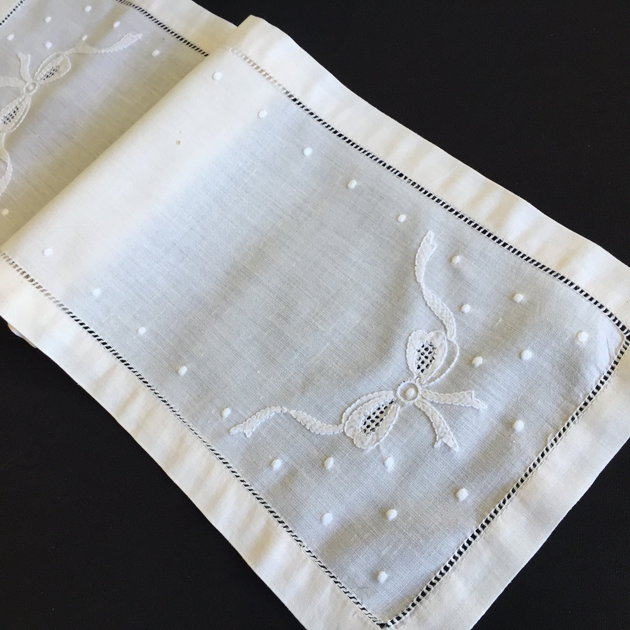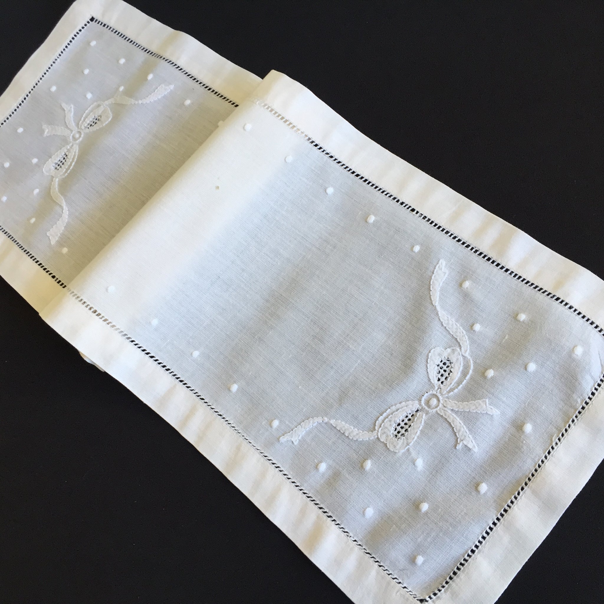 This exquisite oblong table runner is showcasing the refined artistry of Edwardian era vintage embroidery, featuring charming bows on both ends.