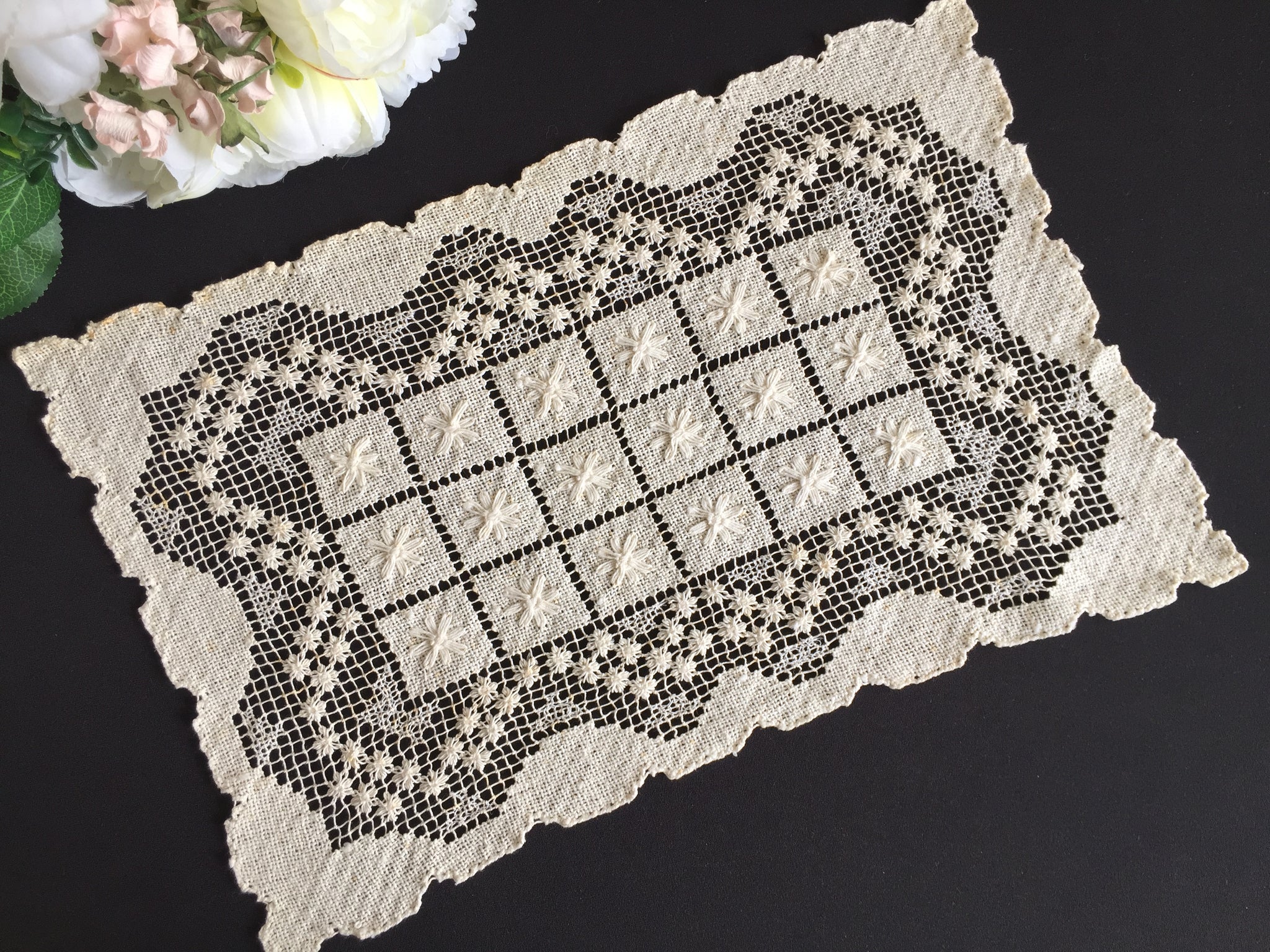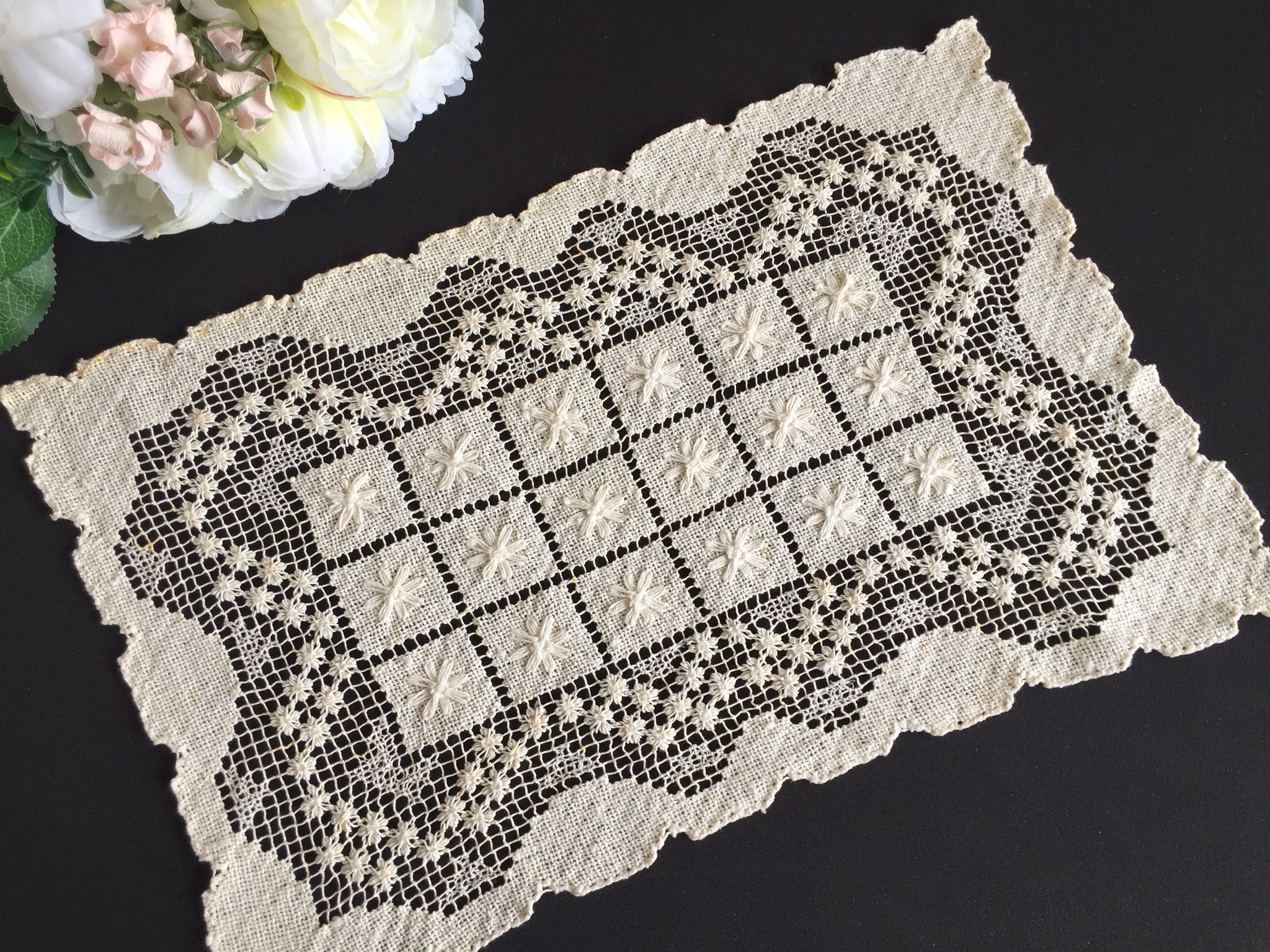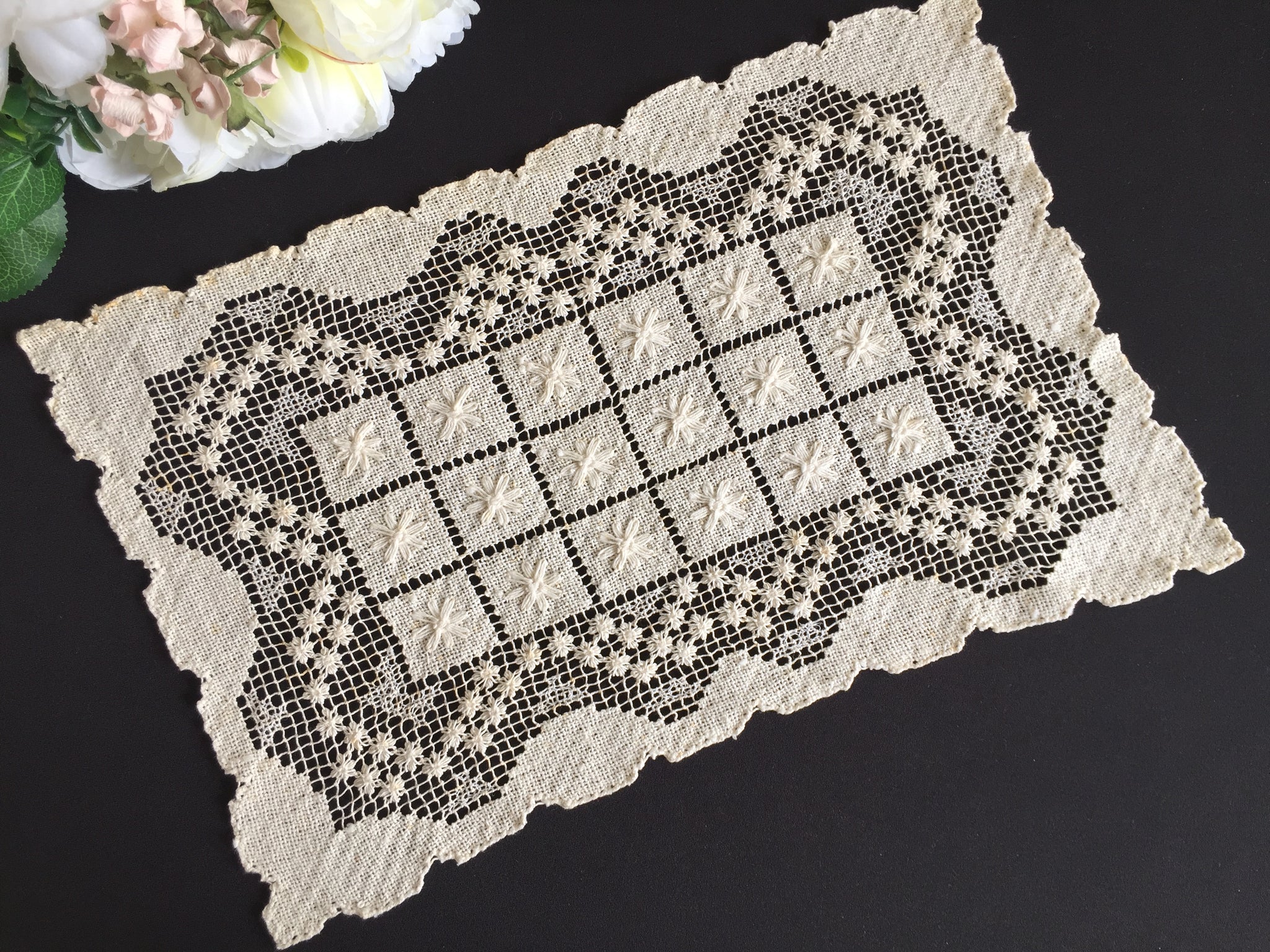 A distinguished textile from the 1920–1950s, this rectangular placemat reflects the golden age of European lace production. Its versatility extends across dining tables, console surfaces, and shelving arrangements, allowing you to style it in countless ways throughout your home.