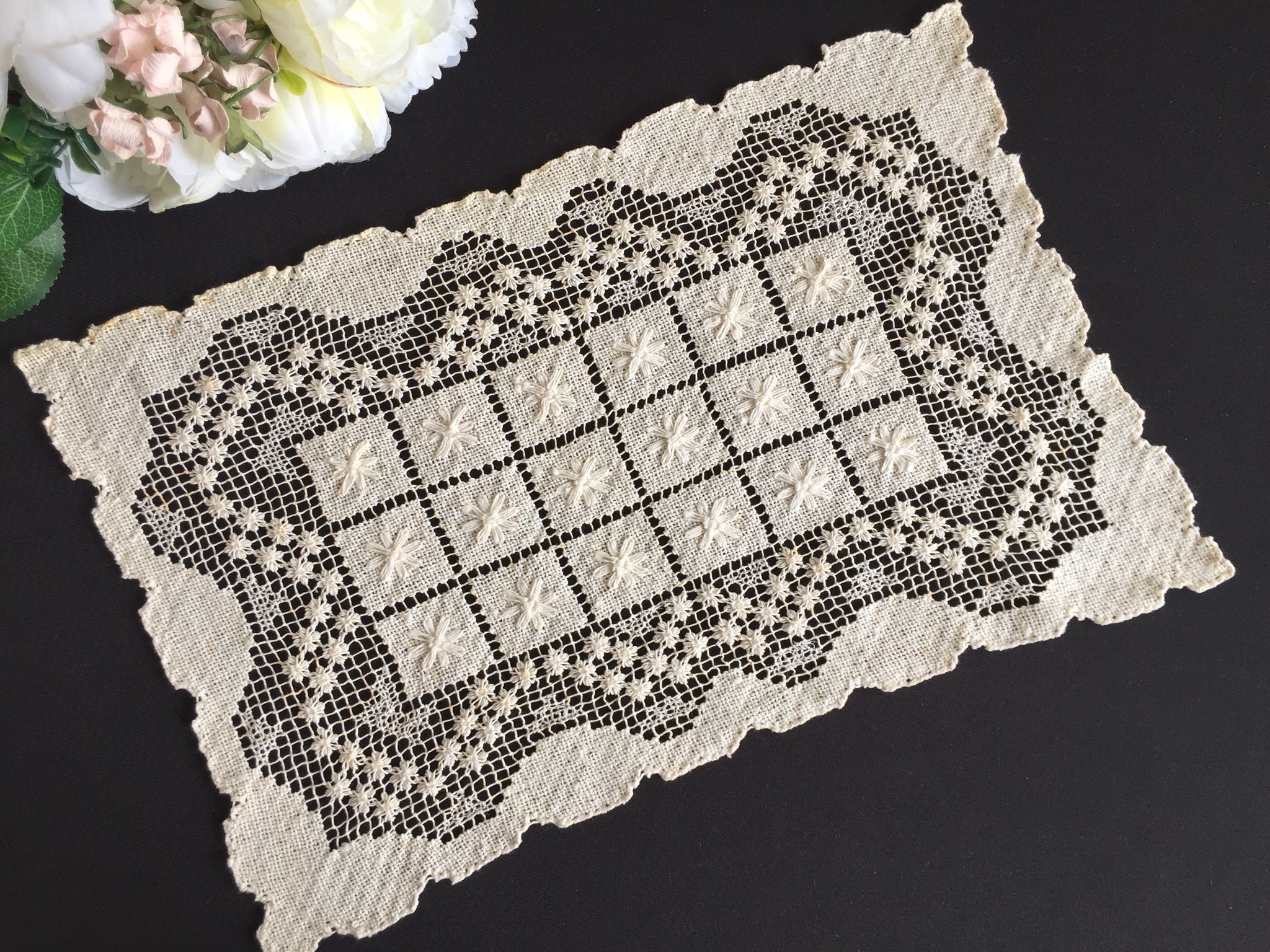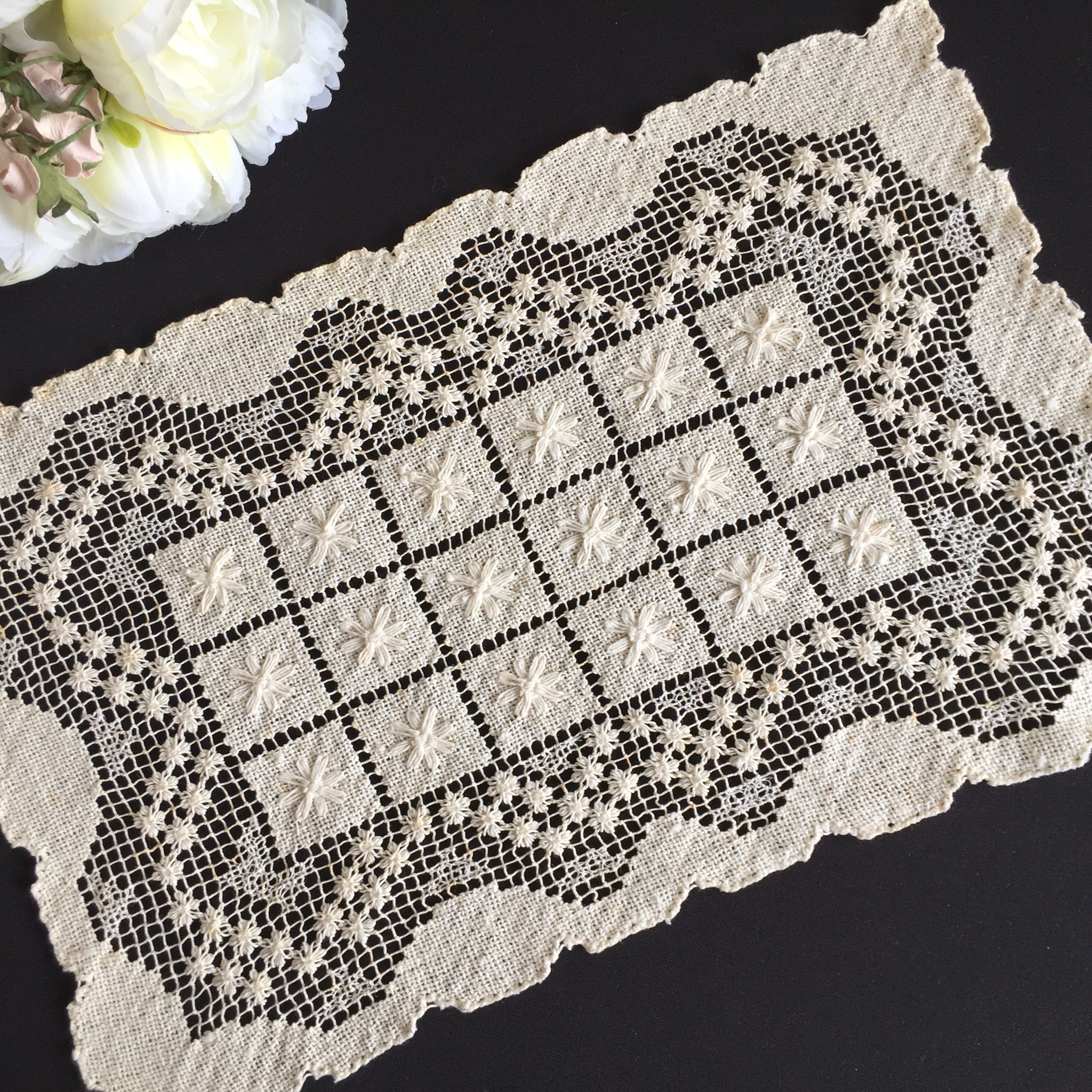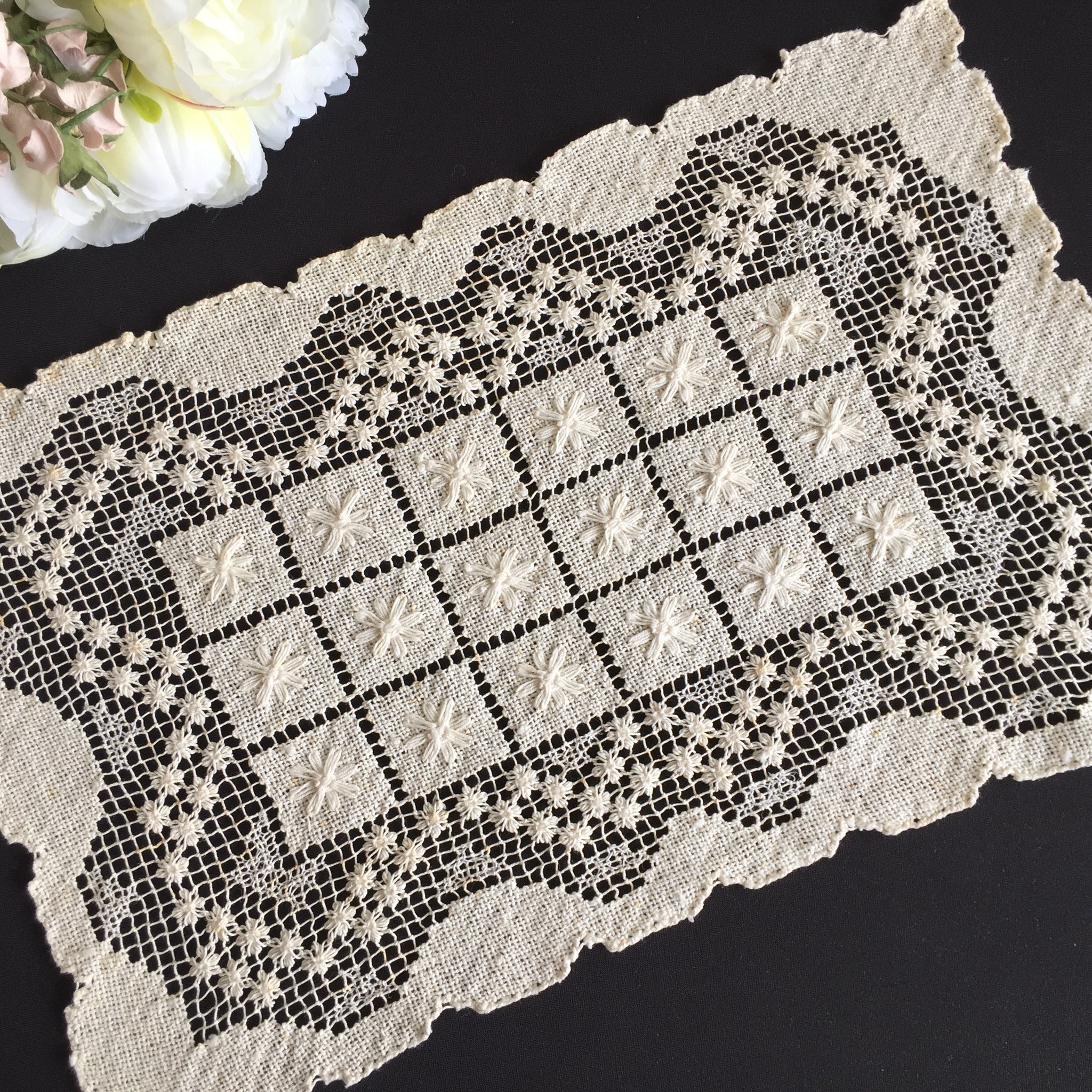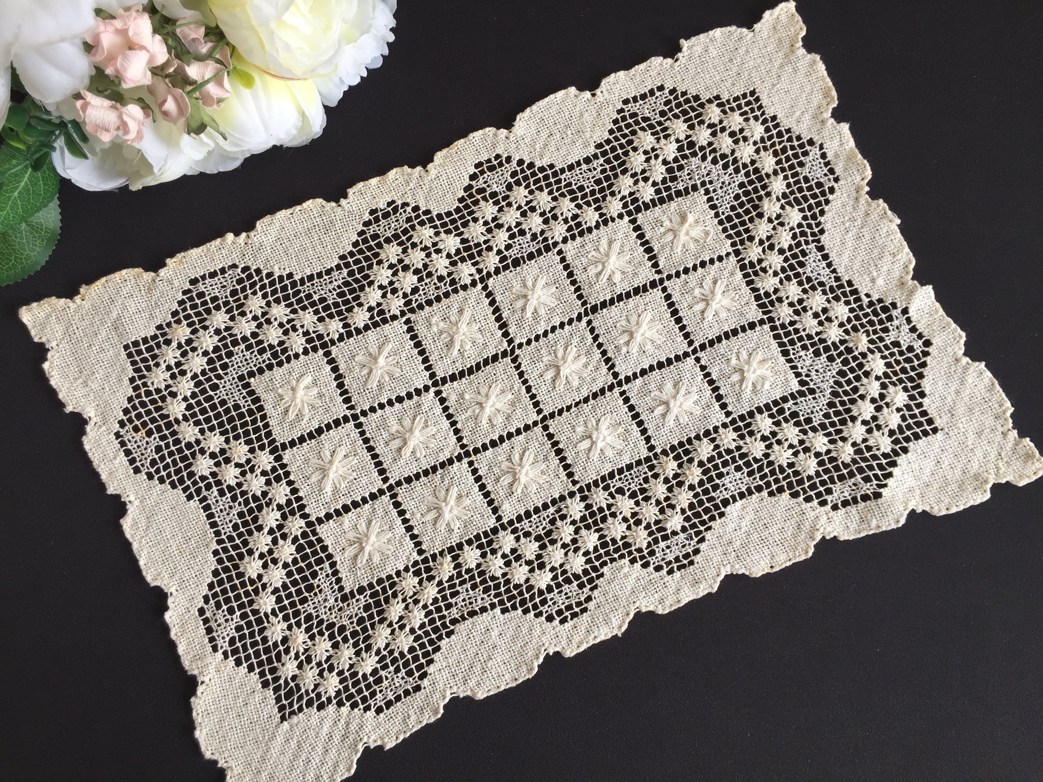 A distinguished textile from the 1920–1950s, this rectangular placemat reflects the golden age of European lace production. Its versatility extends across dining tables, console surfaces, and shelving arrangements, allowing you to style it in countless ways throughout your home.