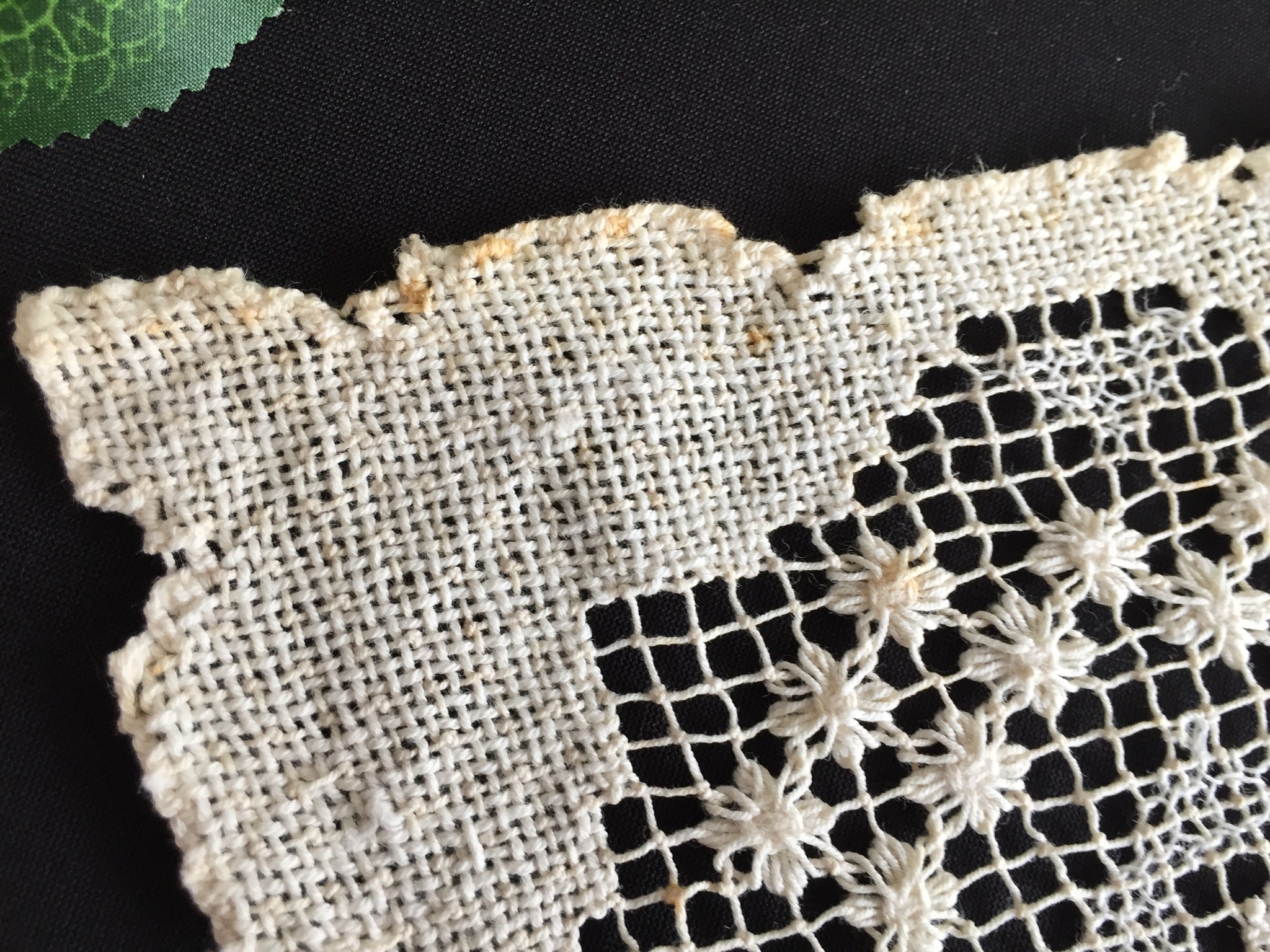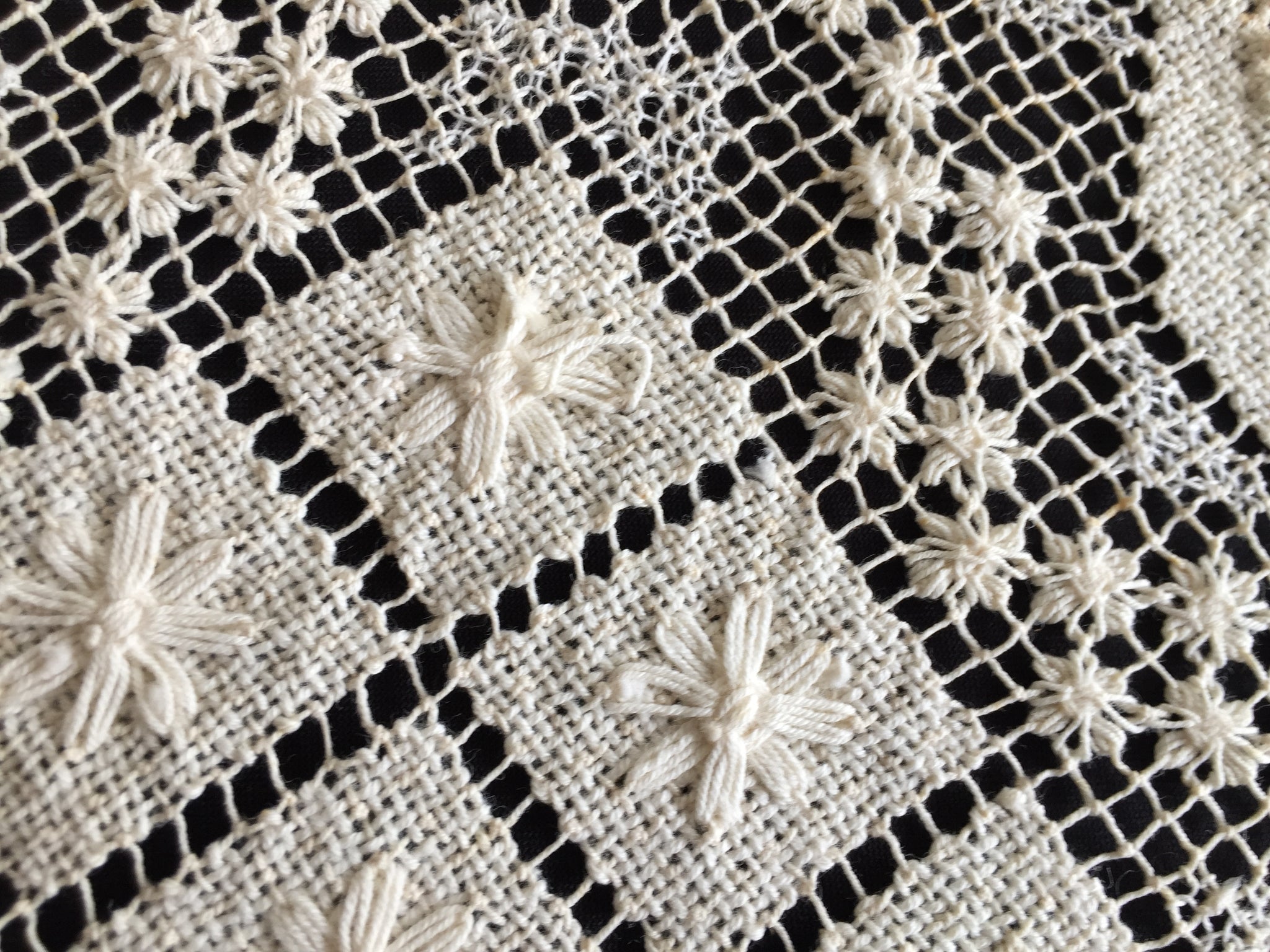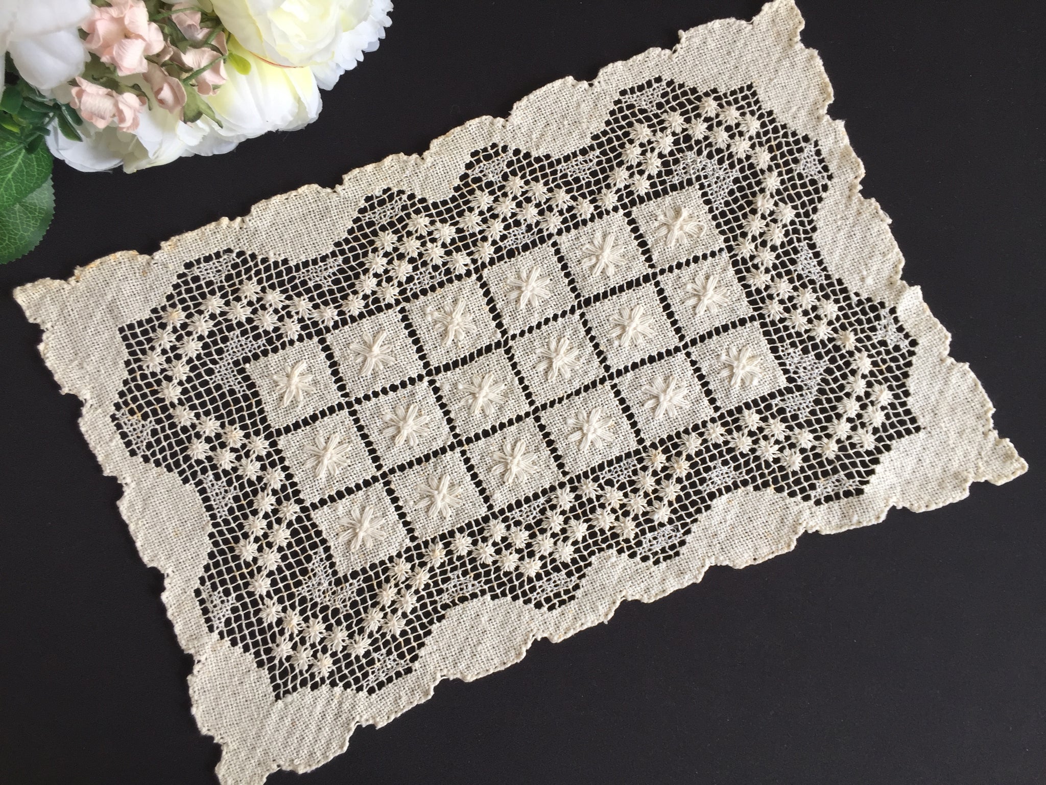 Discover the timeless elegance of this vintage MONDANO filet lace placemat, handcrafted from beige natural cotton with intricate Mediterranean knotted detailing measuring 40 x 25 cm. It showcases delicate openwork patterns characteristic of authentic filet lace, making it a sophisticated addition to your table setting or a treasured collector's item.