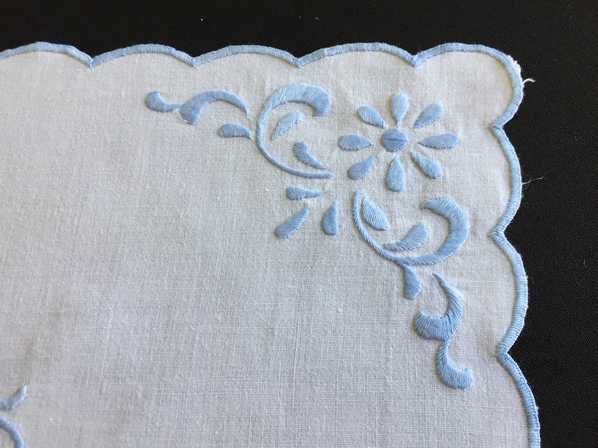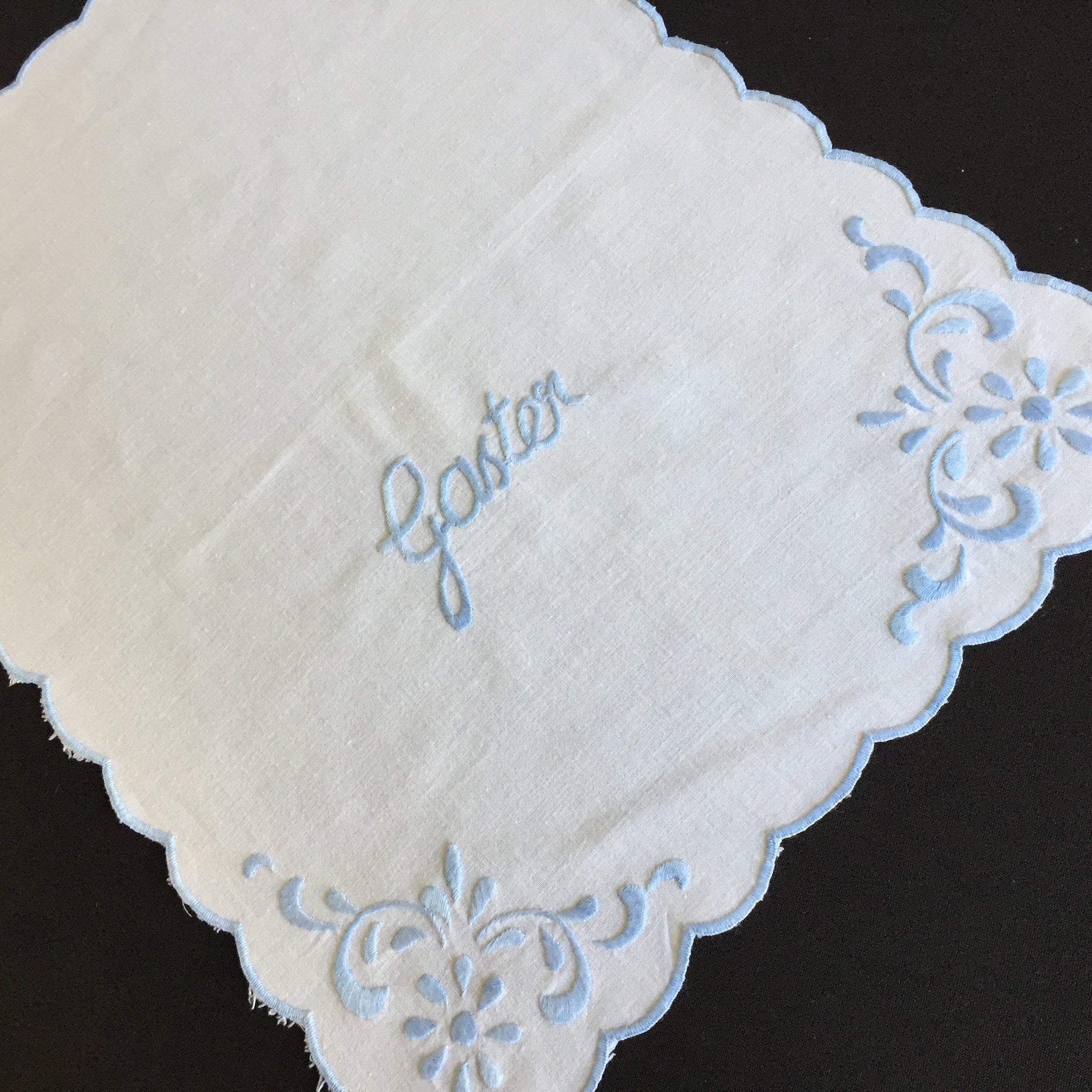 Exquisite white cotton handcrafted doily featuring the word "Garter" in cursive writing, mirrored floral motifs on one end, and a hand-stitched scalloped edging all in the same lovely baby blue.