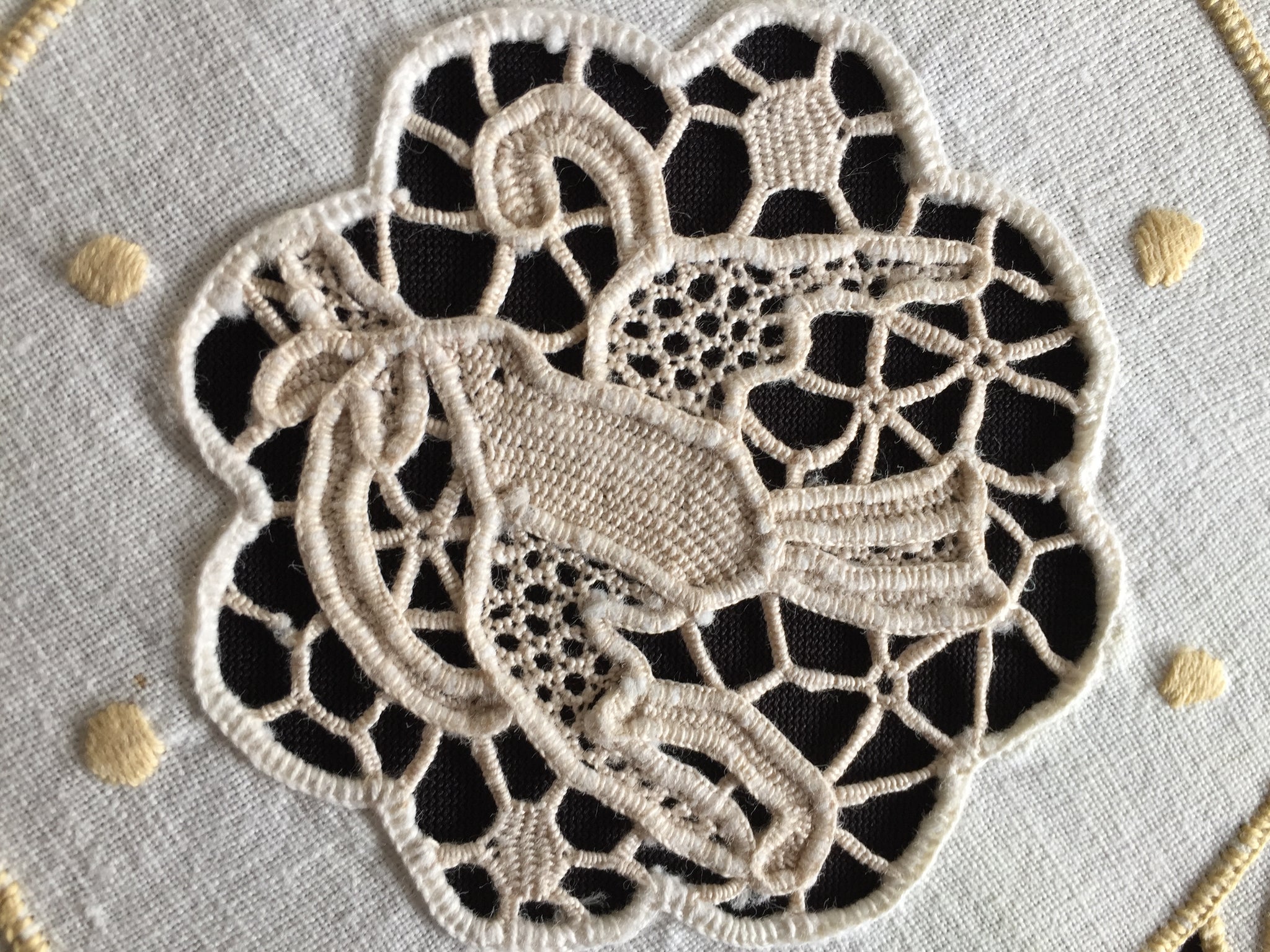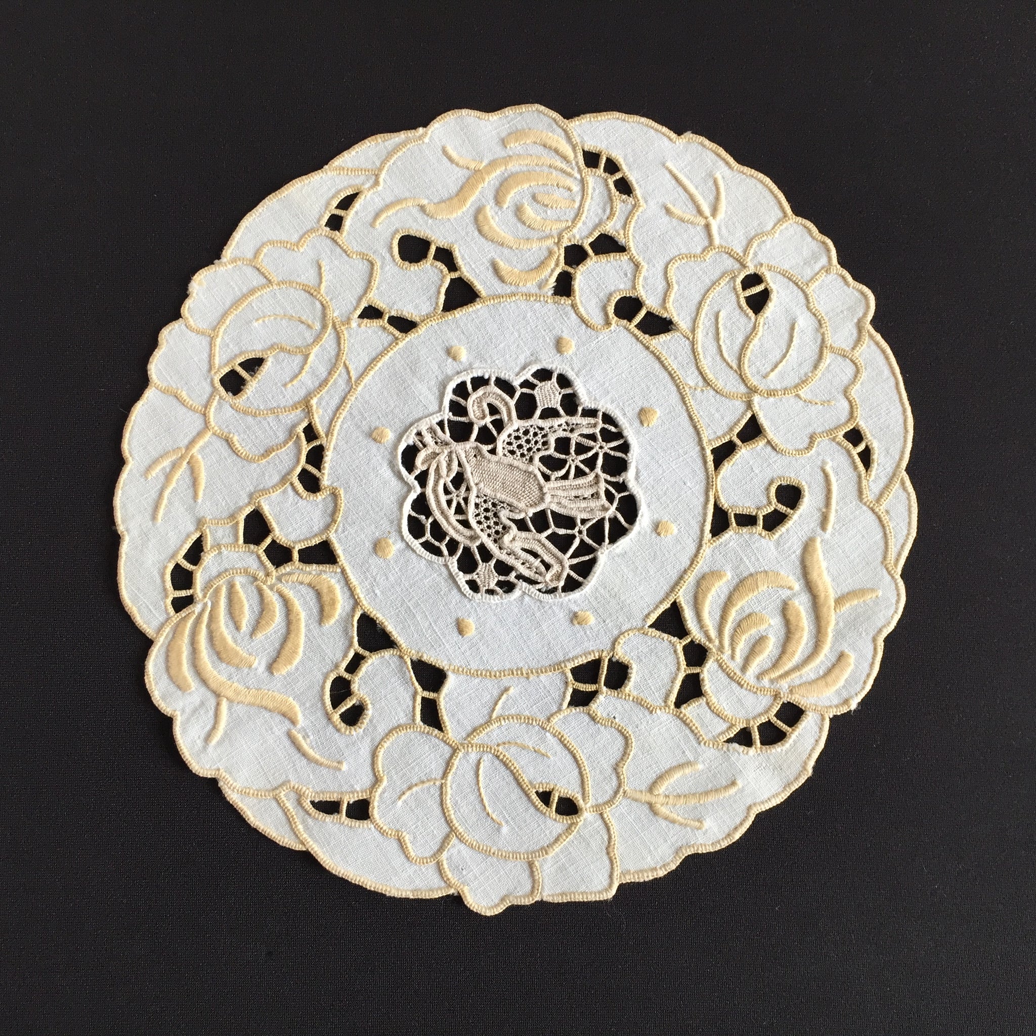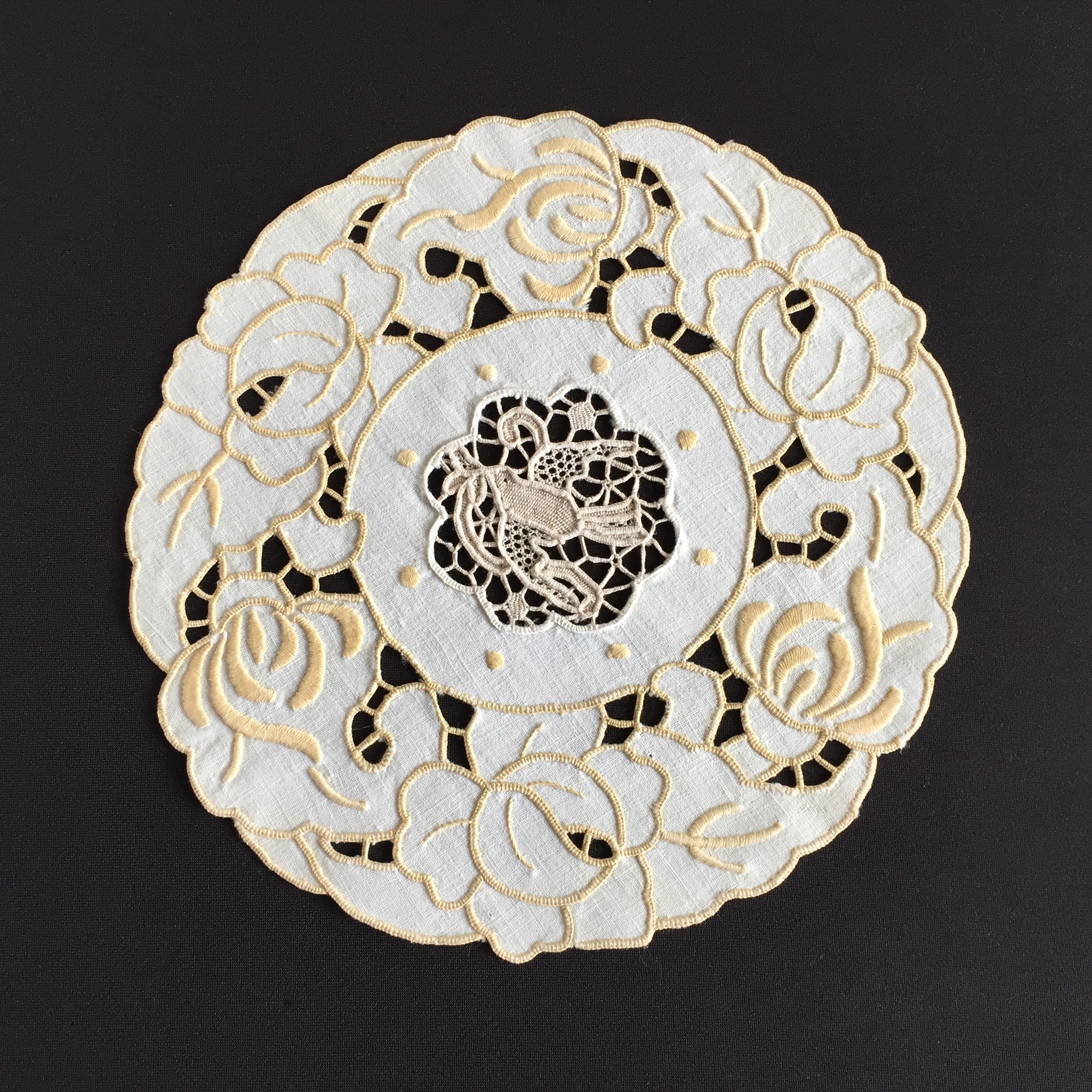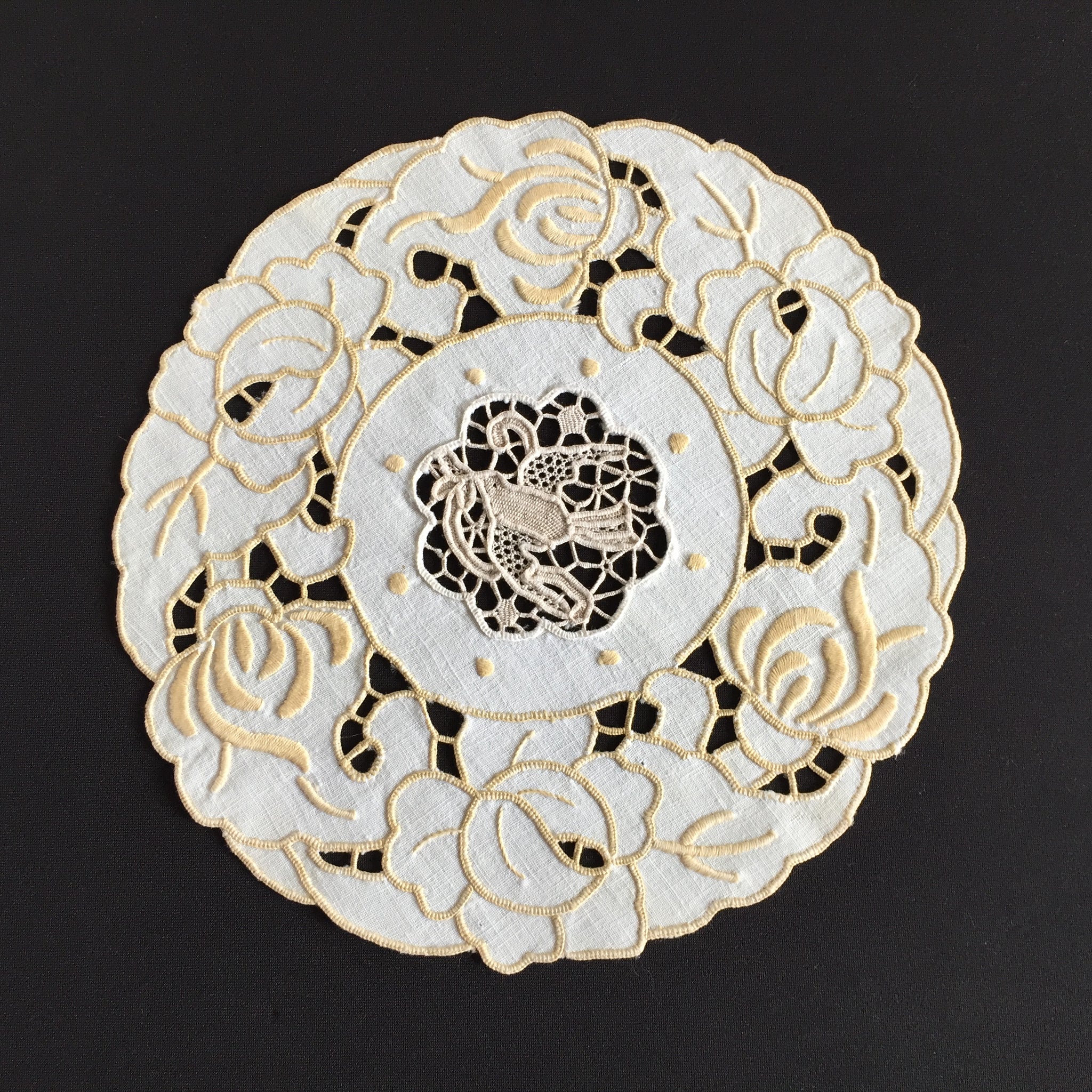 A charming piece of Australian textile heritage, this vintage Madeira doily features an exquisite dove-motif Point de Venise lace centrepiece framed by delicate golden cutwork embroidery. Measuring 23 cm across, it exemplifies the skilled needlework that defined the "glory box" tradition—when young women throughout the 1930s and post-war era handcrafted linens as cherished household treasures. The doily remains in excellent condition, except a small age spot as shown in the images.. Collectors prize such pieces for their historical significance and artisanal quality; interior designers favour them for vintage, cottagecore, and farmhouse aesthetics, whilst textile enthusiasts value them for slow stitching projects and creative upcycling. These handmade heirlooms grow increasingly rare as traditional embroidery skills fade, making each example a sustainable investment in enduring craftsmanship and nostalgic beauty.