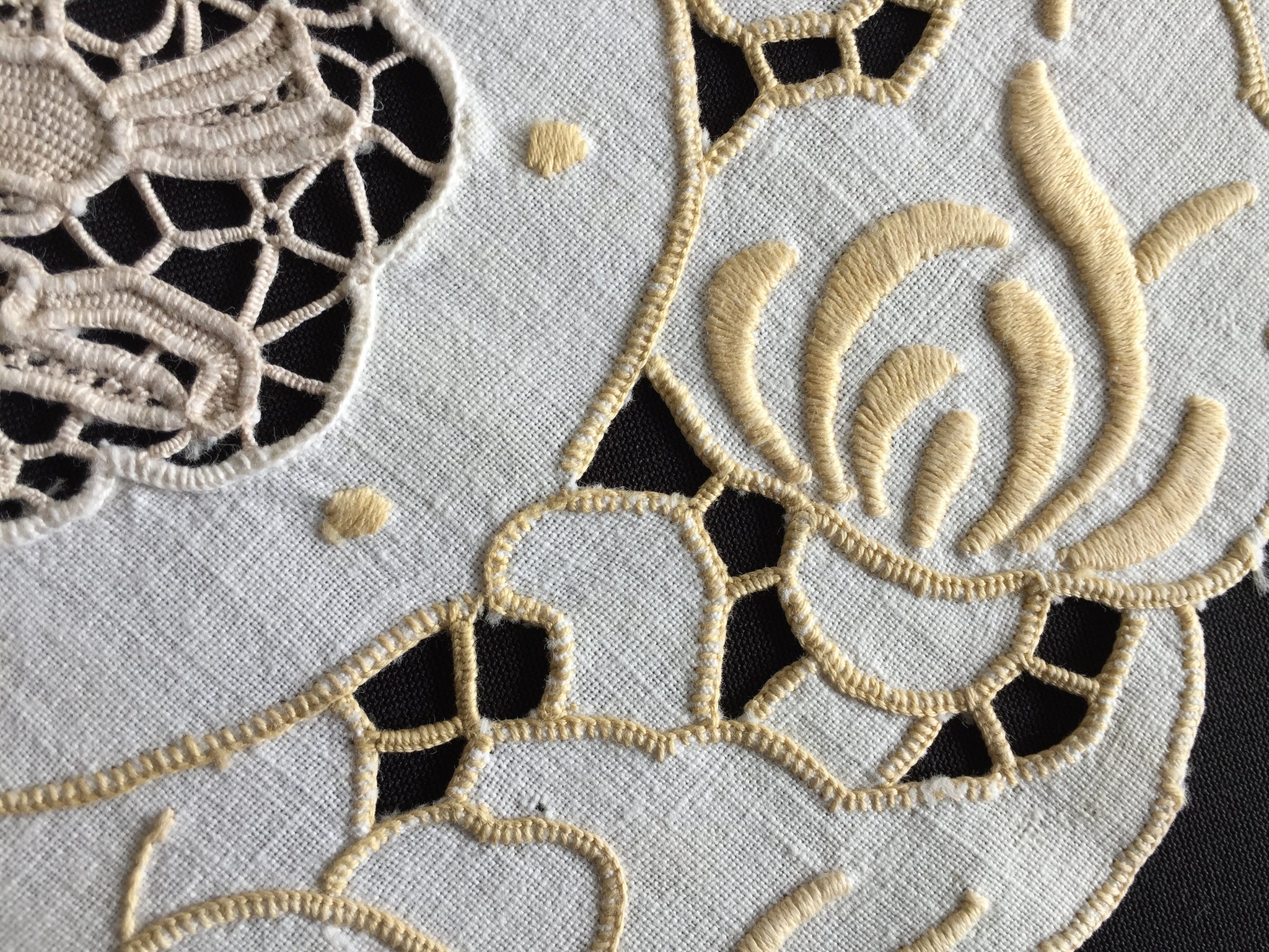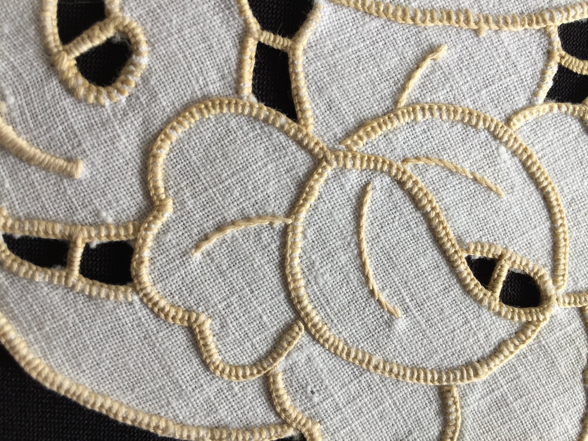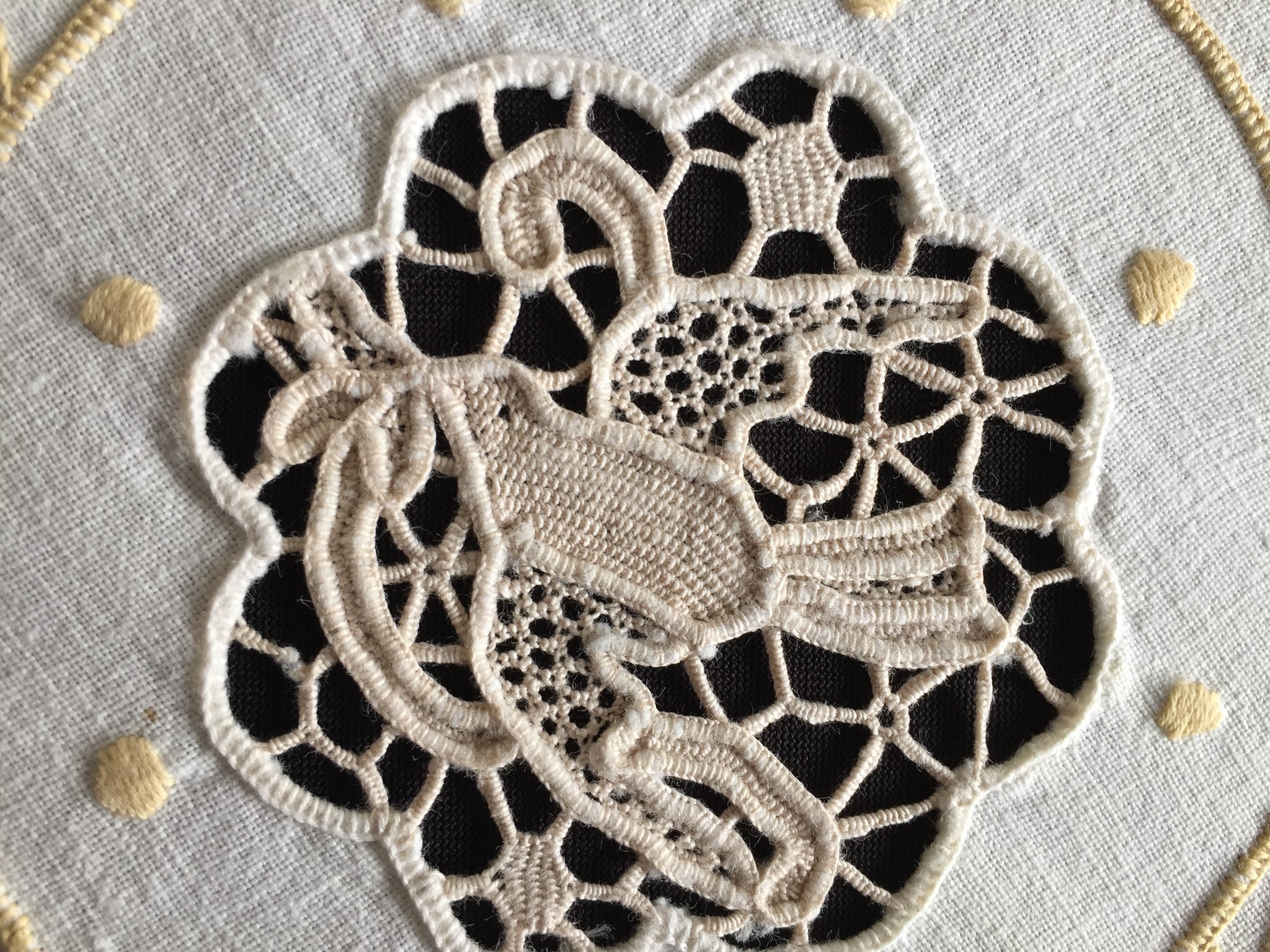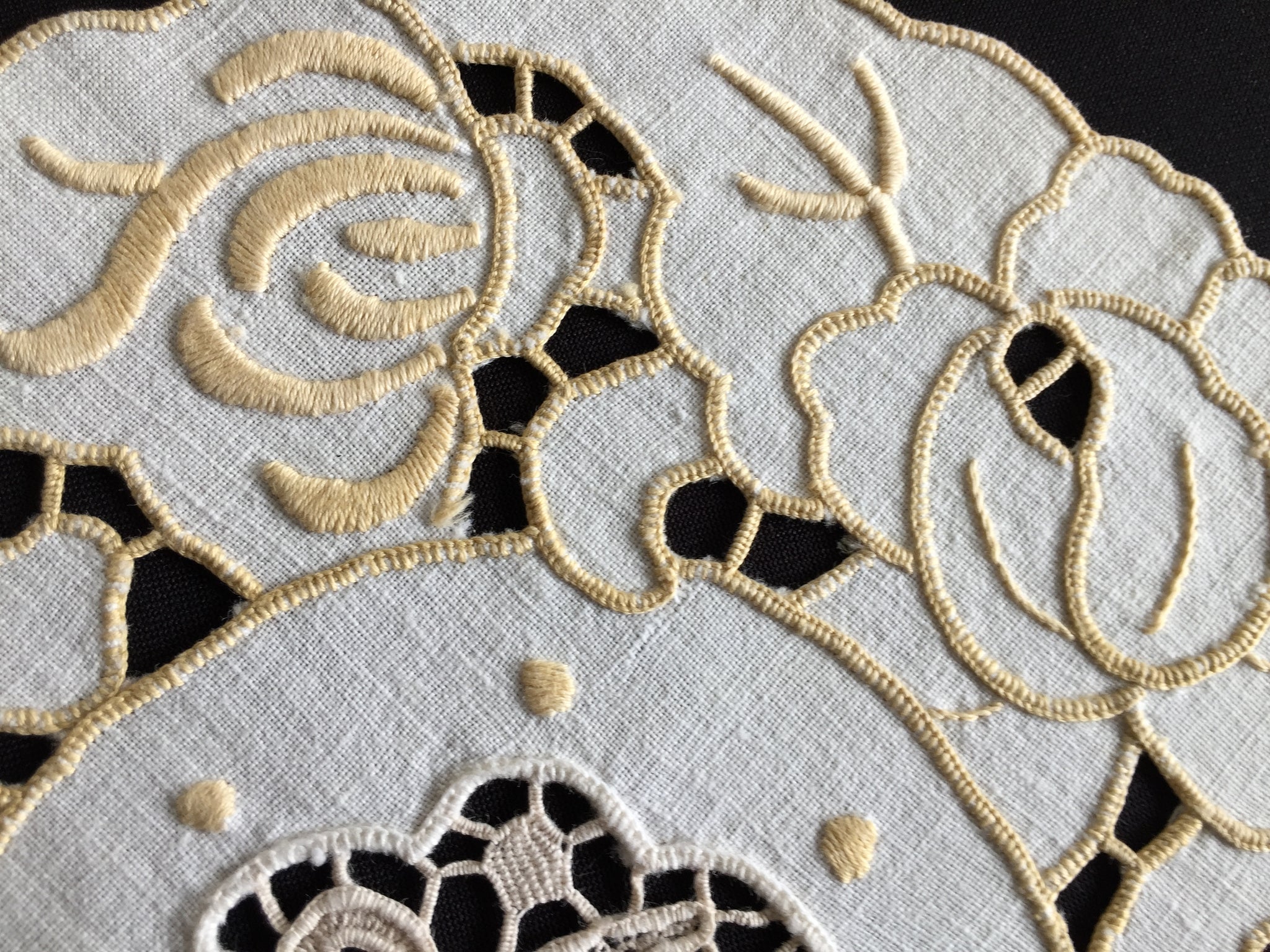 A charming piece of Australian textile heritage, this vintage Madeira doily features an exquisite dove-motif Point de Venise lace centrepiece framed by delicate golden cutwork embroidery. Measuring 23 cm across, it exemplifies the skilled needlework that defined the "glory box" tradition—when young women throughout the 1930s and post-war era handcrafted linens as cherished household treasures. The doily remains in excellent condition, except a small age spot as shown in the images.. Collectors prize such pieces for their historical significance and artisanal quality; interior designers favour them for vintage, cottagecore, and farmhouse aesthetics, whilst textile enthusiasts value them for slow stitching projects and creative upcycling. These handmade heirlooms grow increasingly rare as traditional embroidery skills fade, making each example a sustainable investment in enduring craftsmanship and nostalgic beauty.