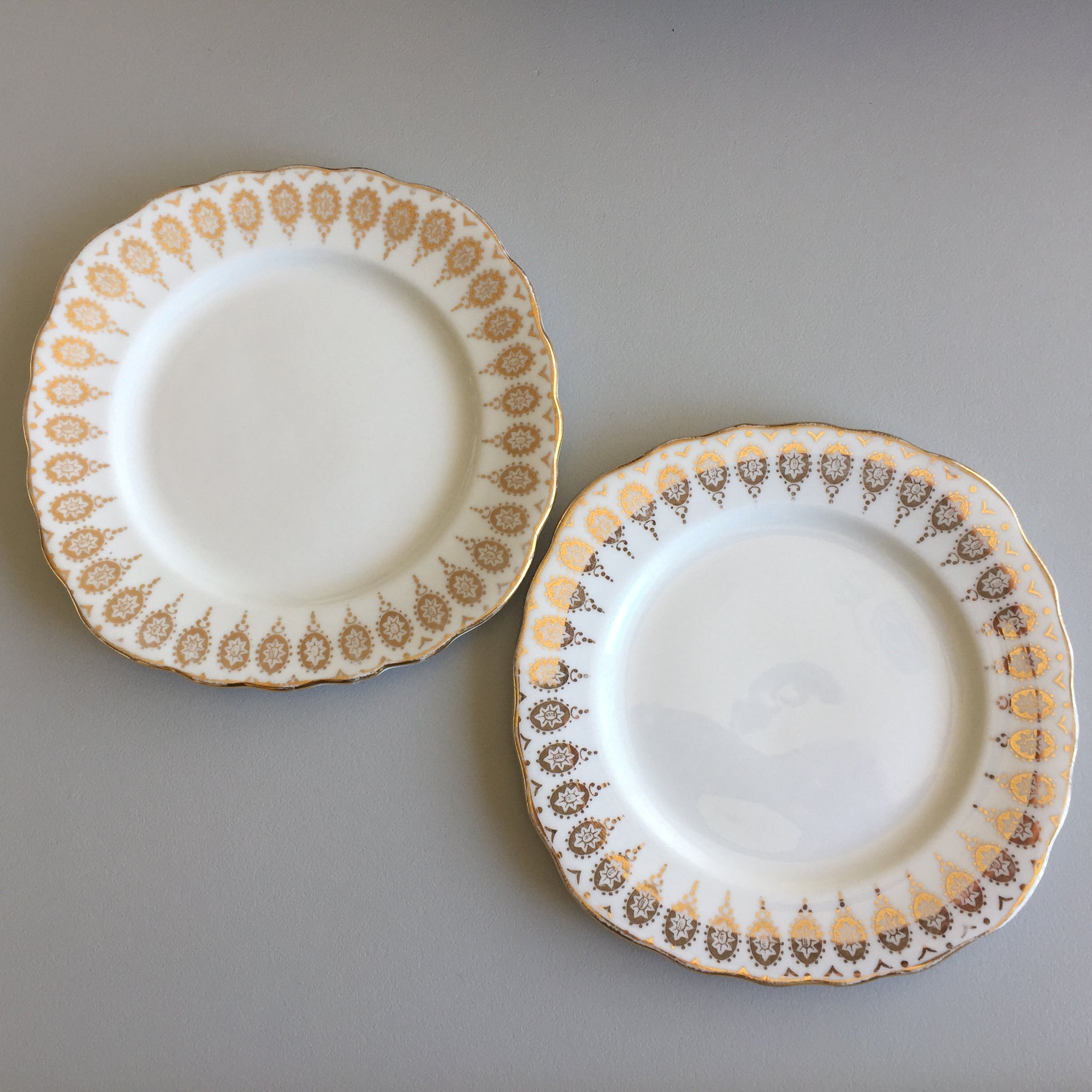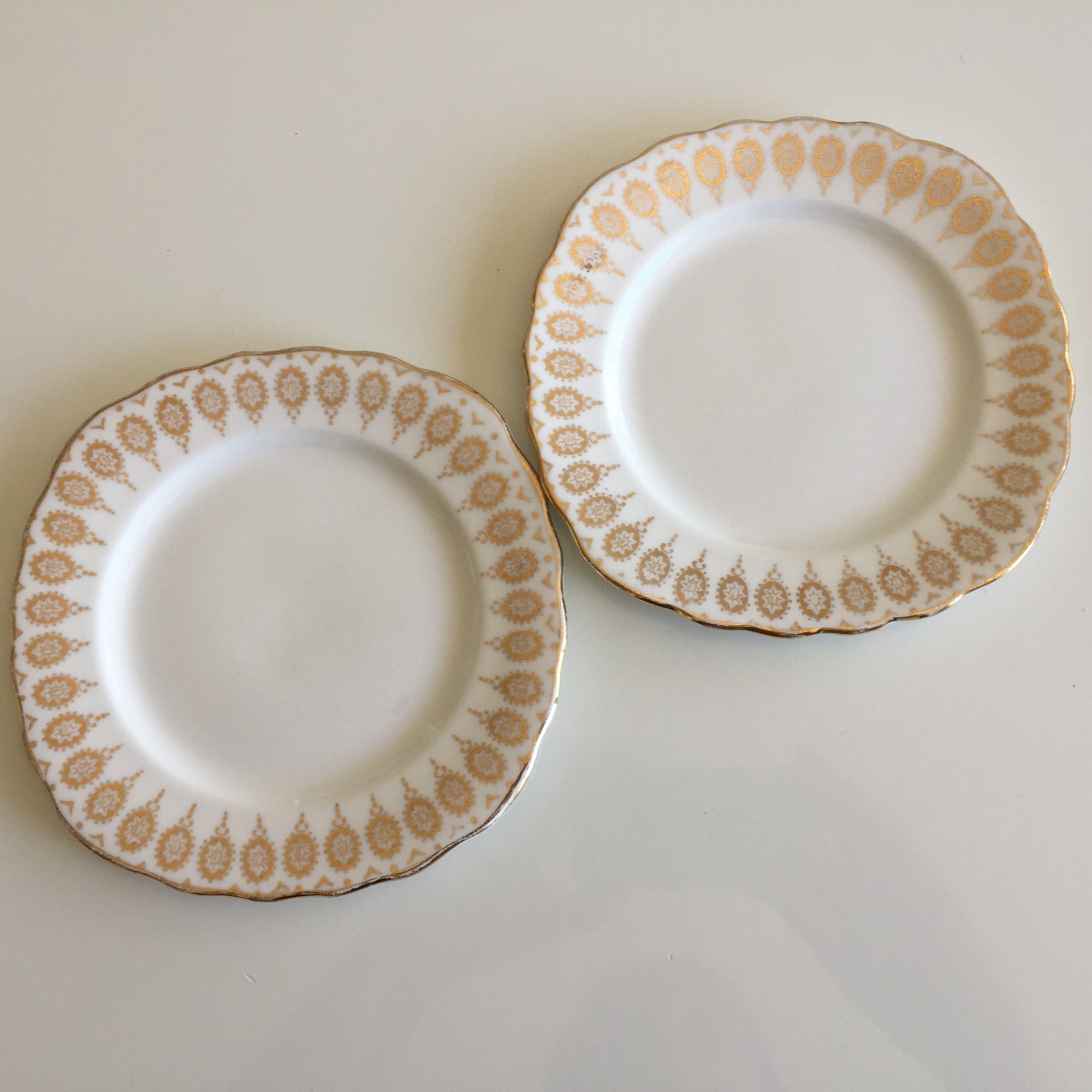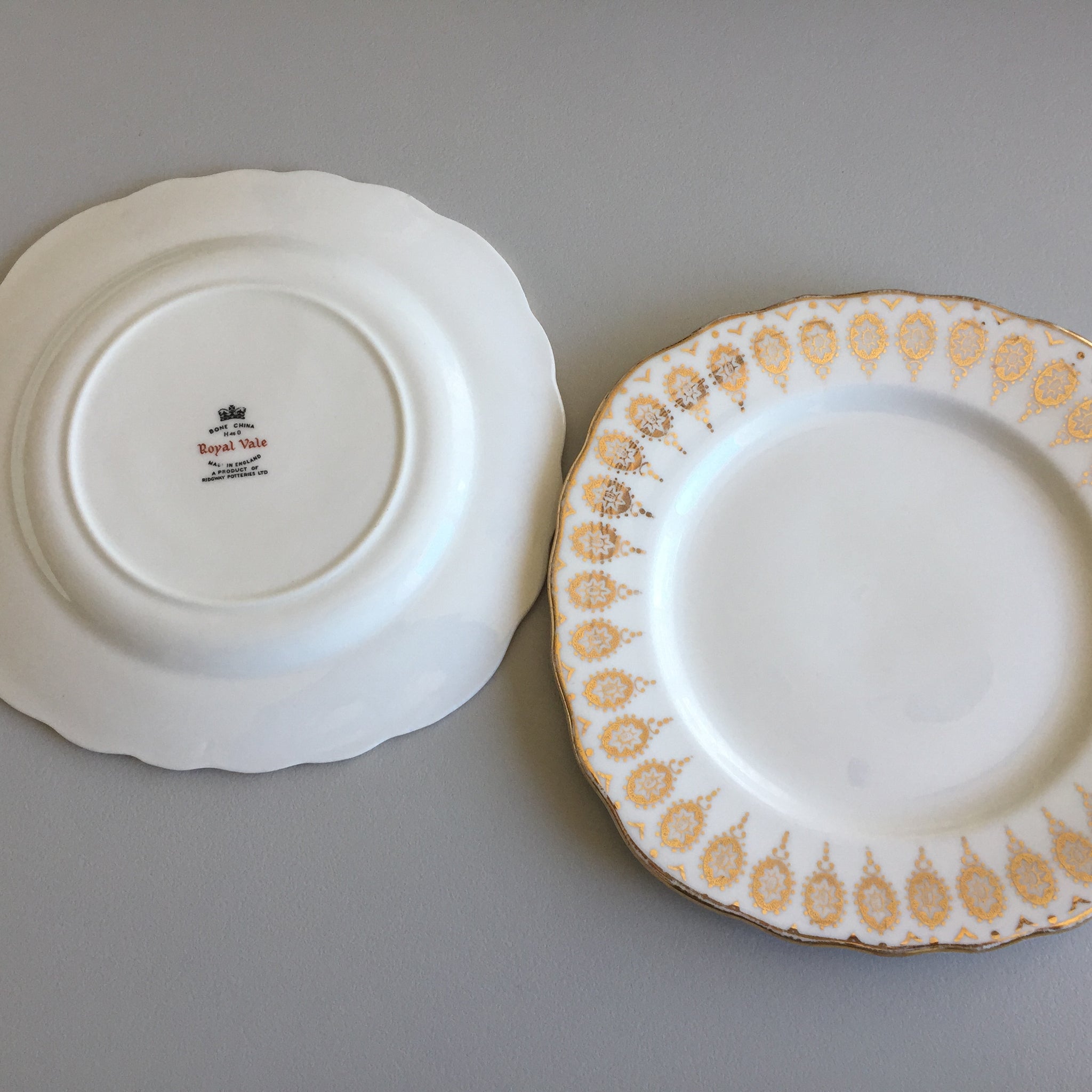 This listing includes both plates as pictured. Discover the timeless elegance of this Royal Vale English vintage pairing, featuring exquisite scalloped gilded borders that capture the essence of classic tableware craftsmanship. Each 15.5 cm plate showcases the superior quality and durability that defines authentic English porcelain, arriving in pristine condition with no chips, cracks, or crazing. The subtle patina of age adds character and authenticity to these collectible pieces. Perfect for elevating your table setting or completing a curated collection of vintage English dinnerware, these bread and butter plates bring refined sophistication to any occasion.