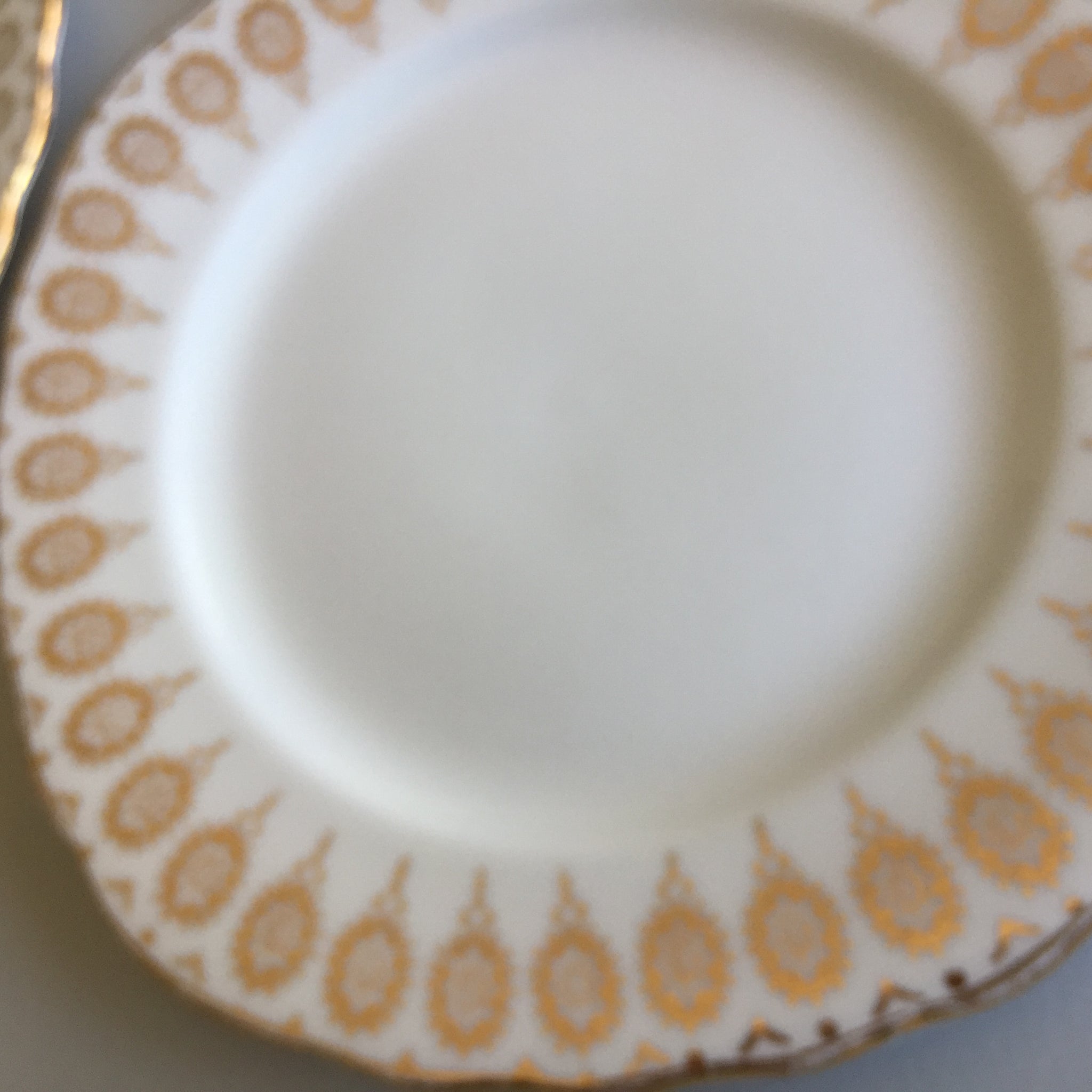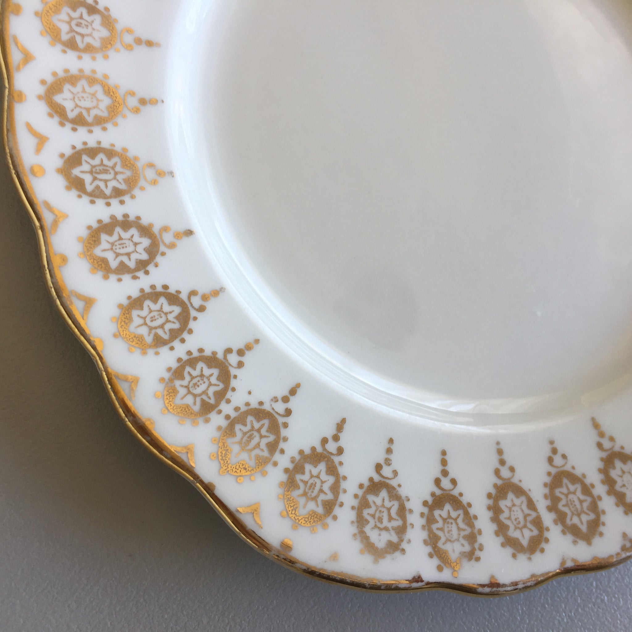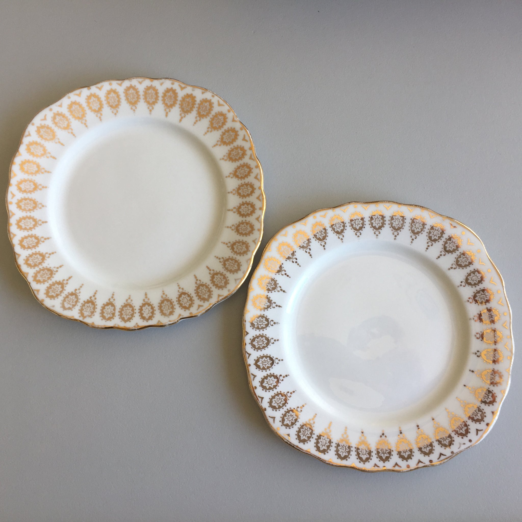 This listing includes both plates as pictured. Discover the timeless elegance of this Royal Vale English vintage pairing, featuring exquisite scalloped gilded borders that capture the essence of classic tableware craftsmanship. Each 15.5 cm plate showcases the superior quality and durability that defines authentic English porcelain, arriving in pristine condition with no chips, cracks, or crazing. The subtle patina of age adds character and authenticity to these collectible pieces. Perfect for elevating your table setting or completing a curated collection of vintage English dinnerware, these bread and butter plates bring refined sophistication to any occasion.