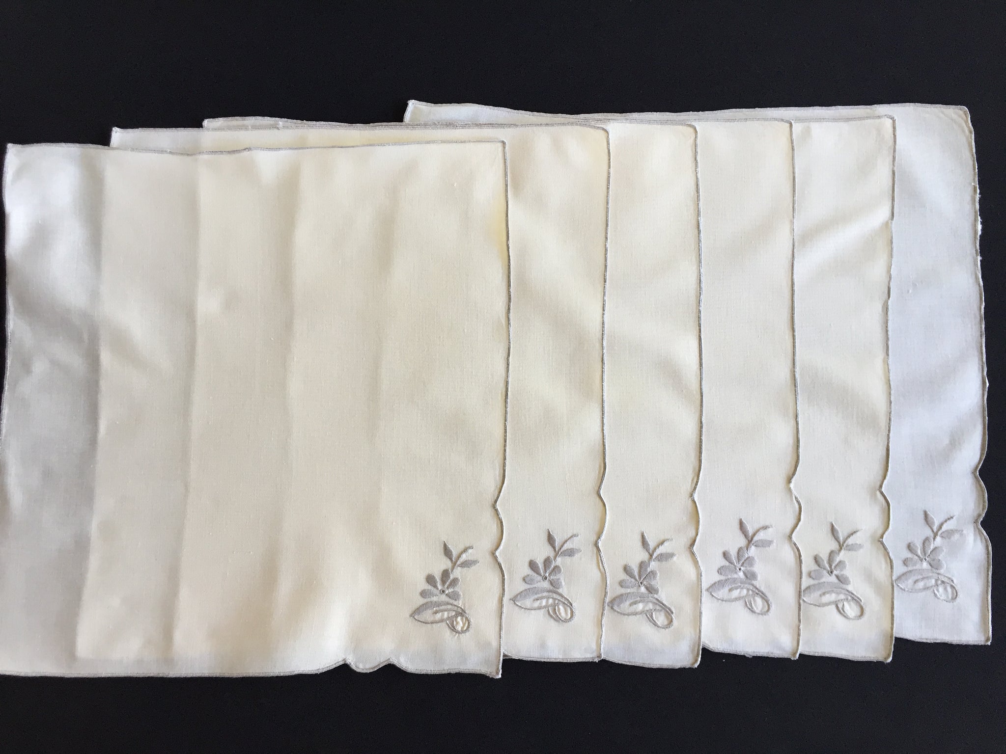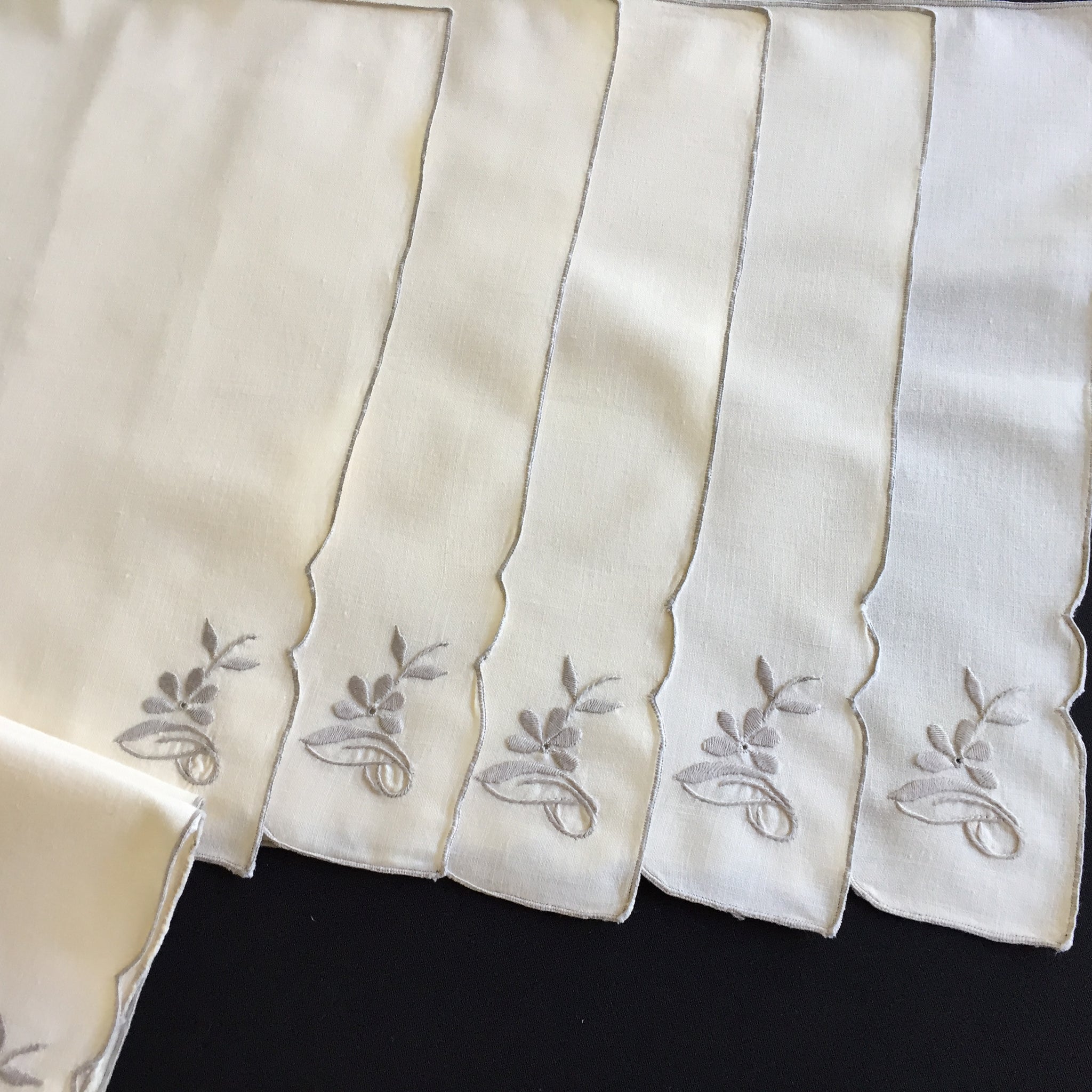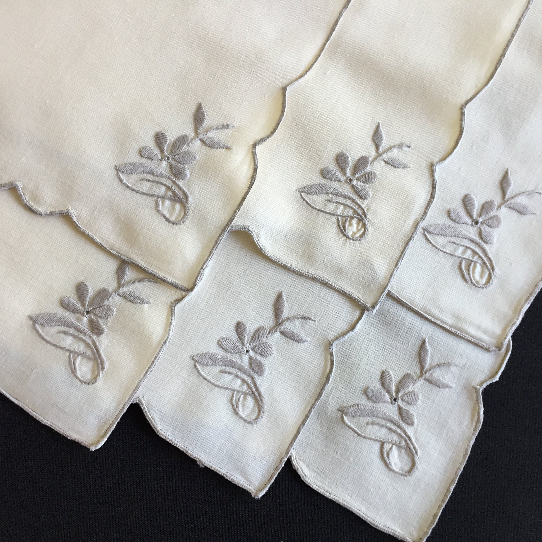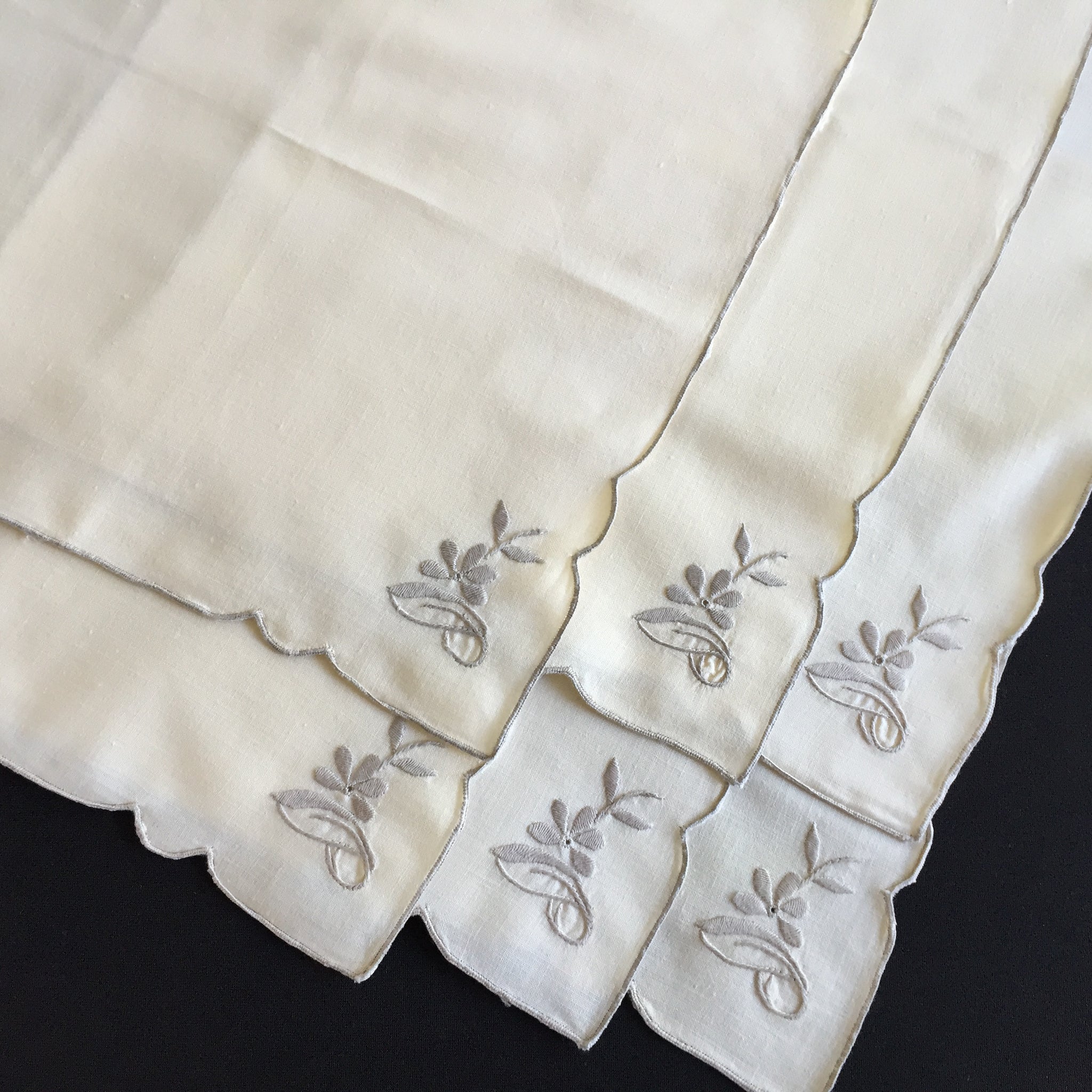Elevate your table setting with this stunning set of six hand-embroidered vintage cotton napkins, a testament to the artisanal excellence of mid-century textile craftsmanship. Each napkin features a graceful floral motif delicately embroidered in grey cotton on one corner, complemented by an elegant wavy hand-stitched border in matching grey that frames the design with understated sophistication.