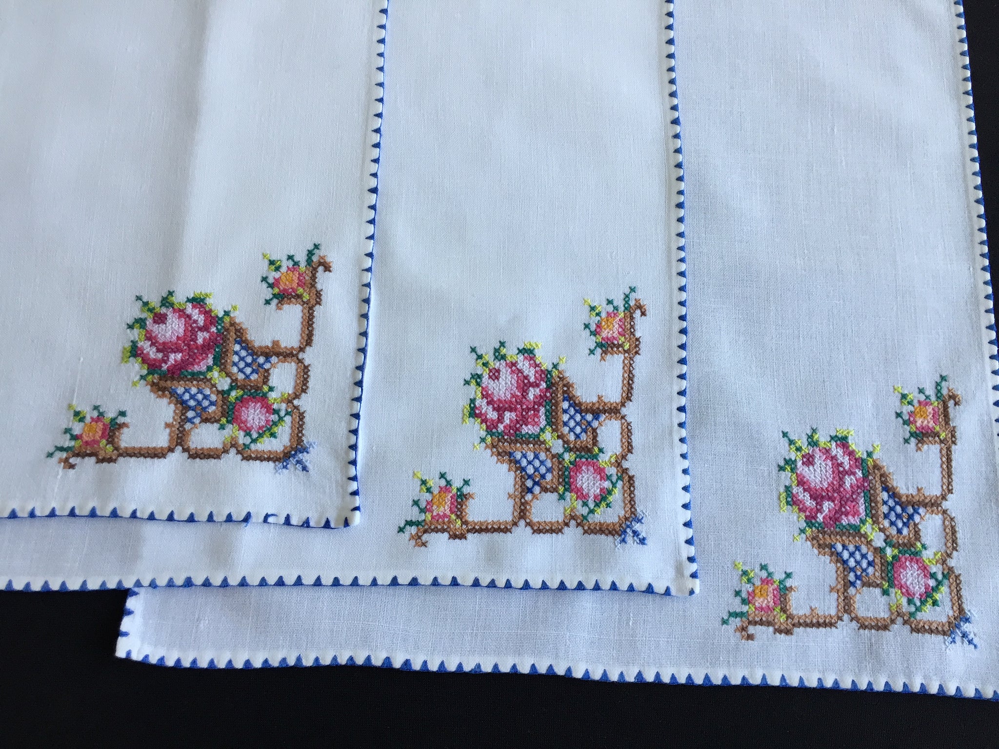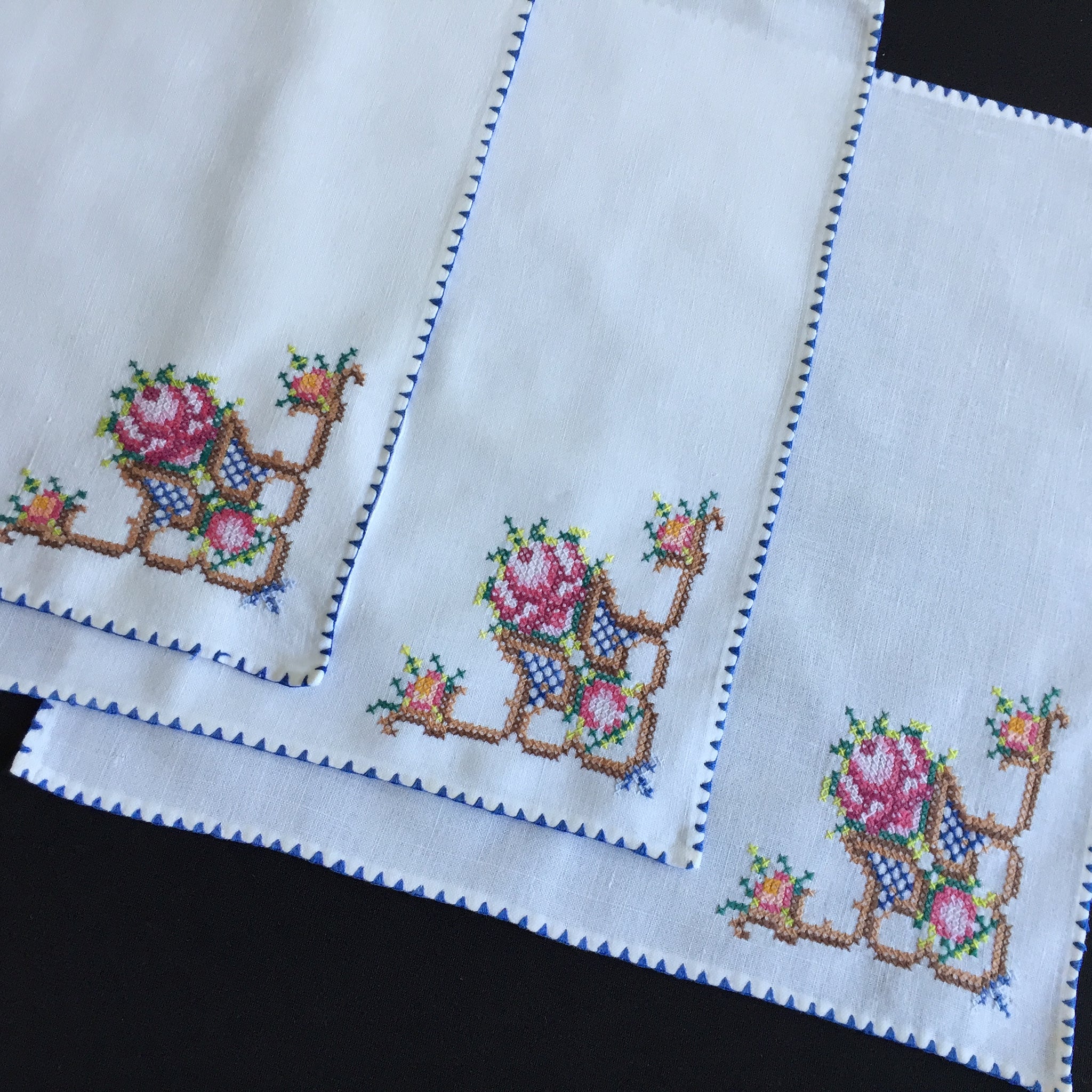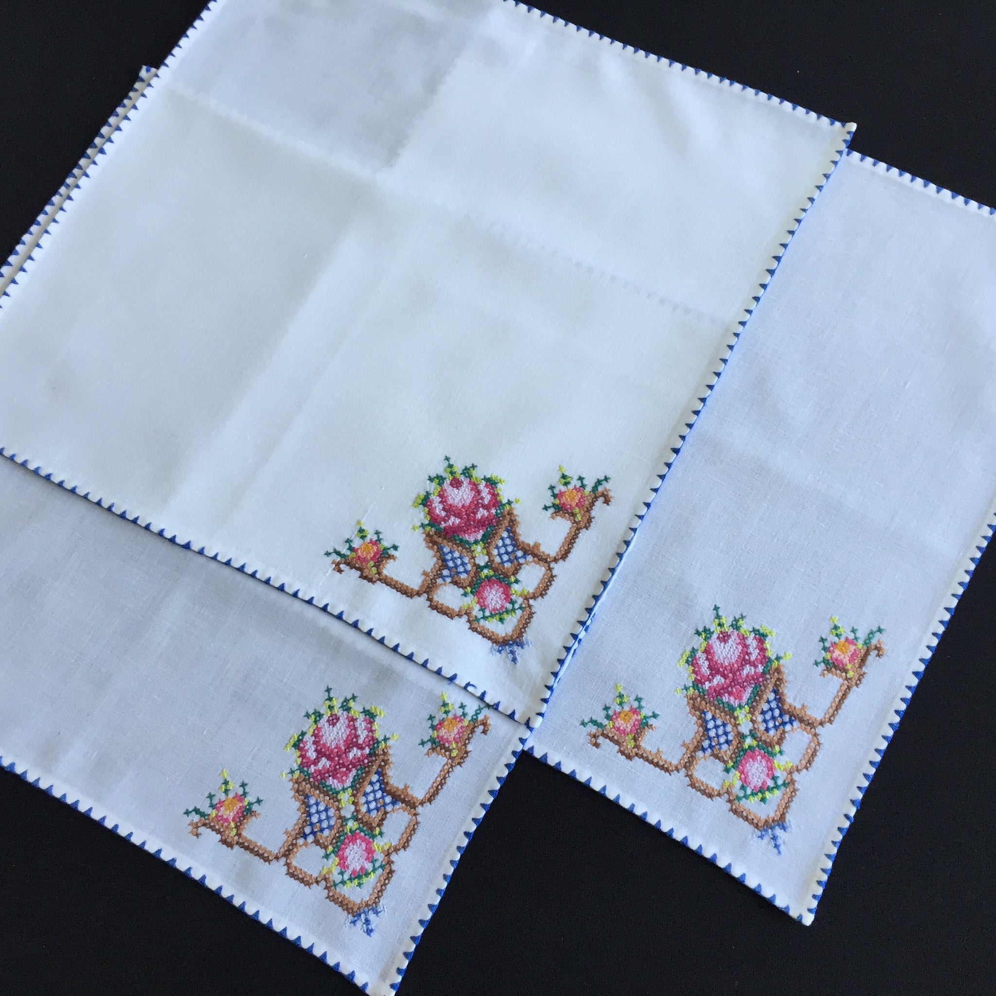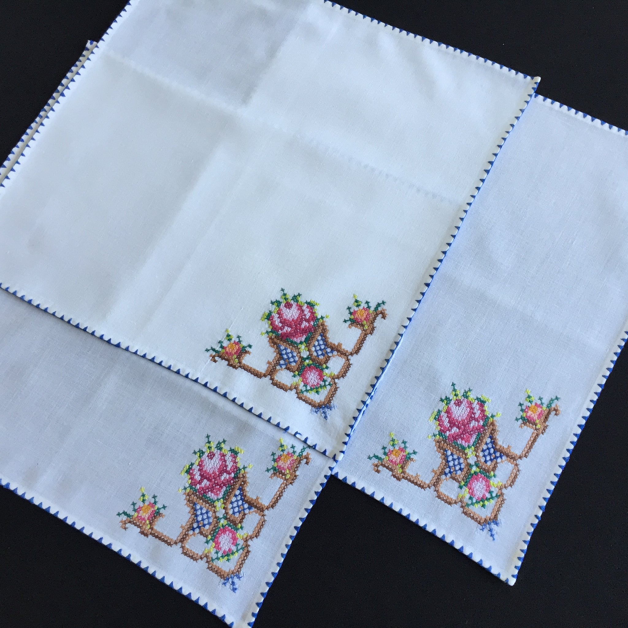 Set of 3 in white: good, gently used vintage, freshly laundered, with minor flaws (1 x small age spot, couple of broken threads on one corner as shown in the images).