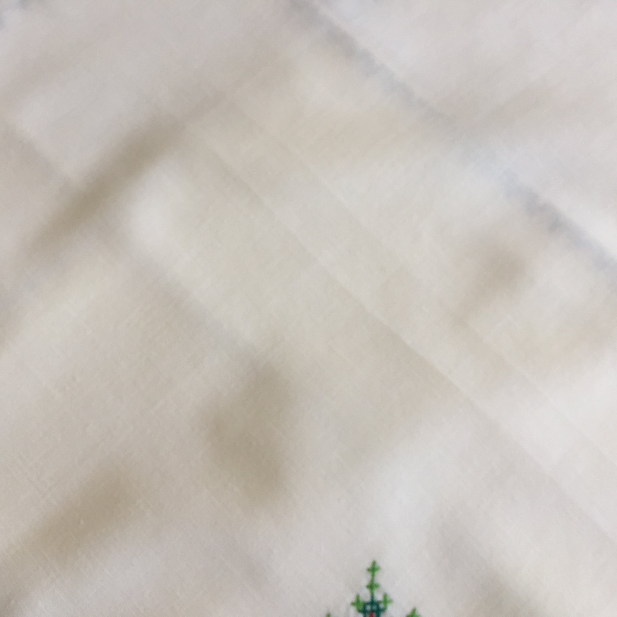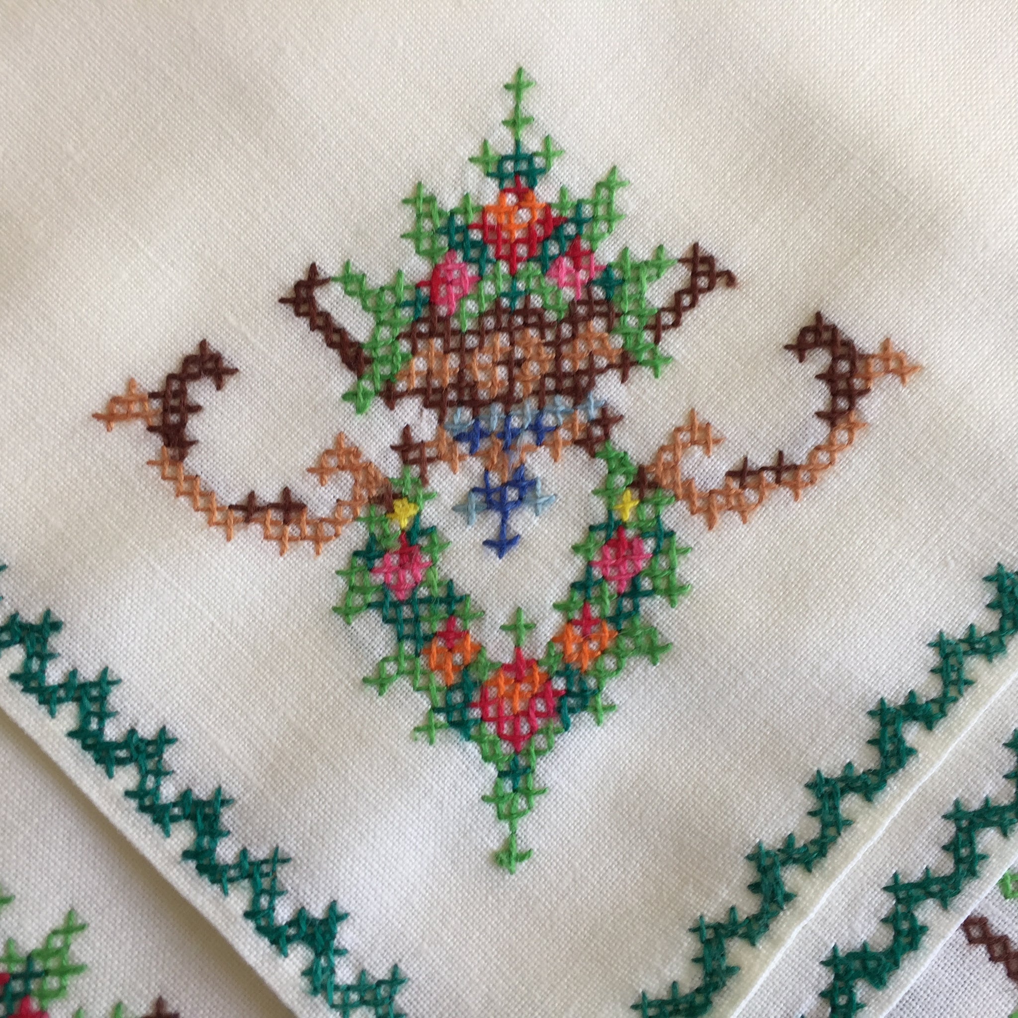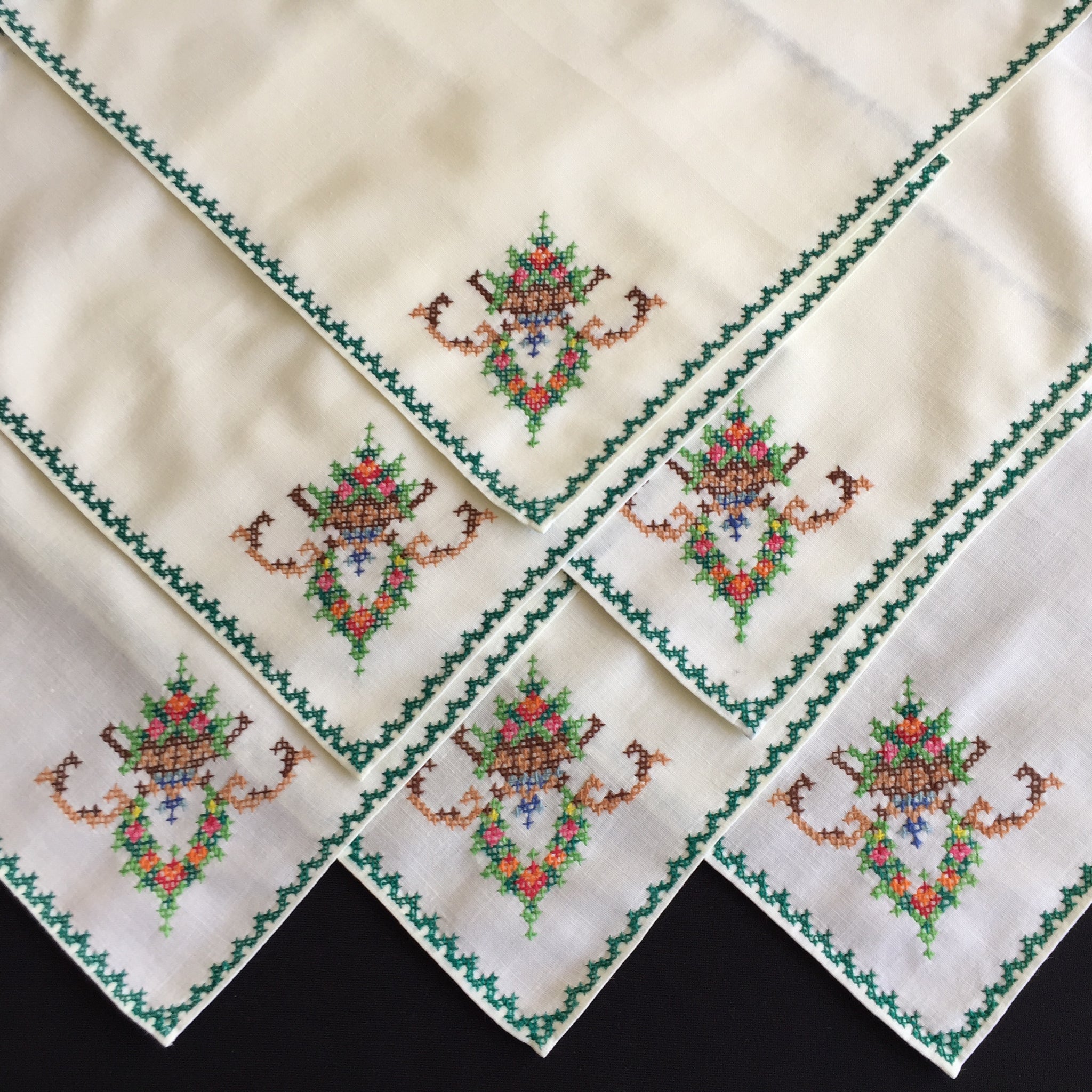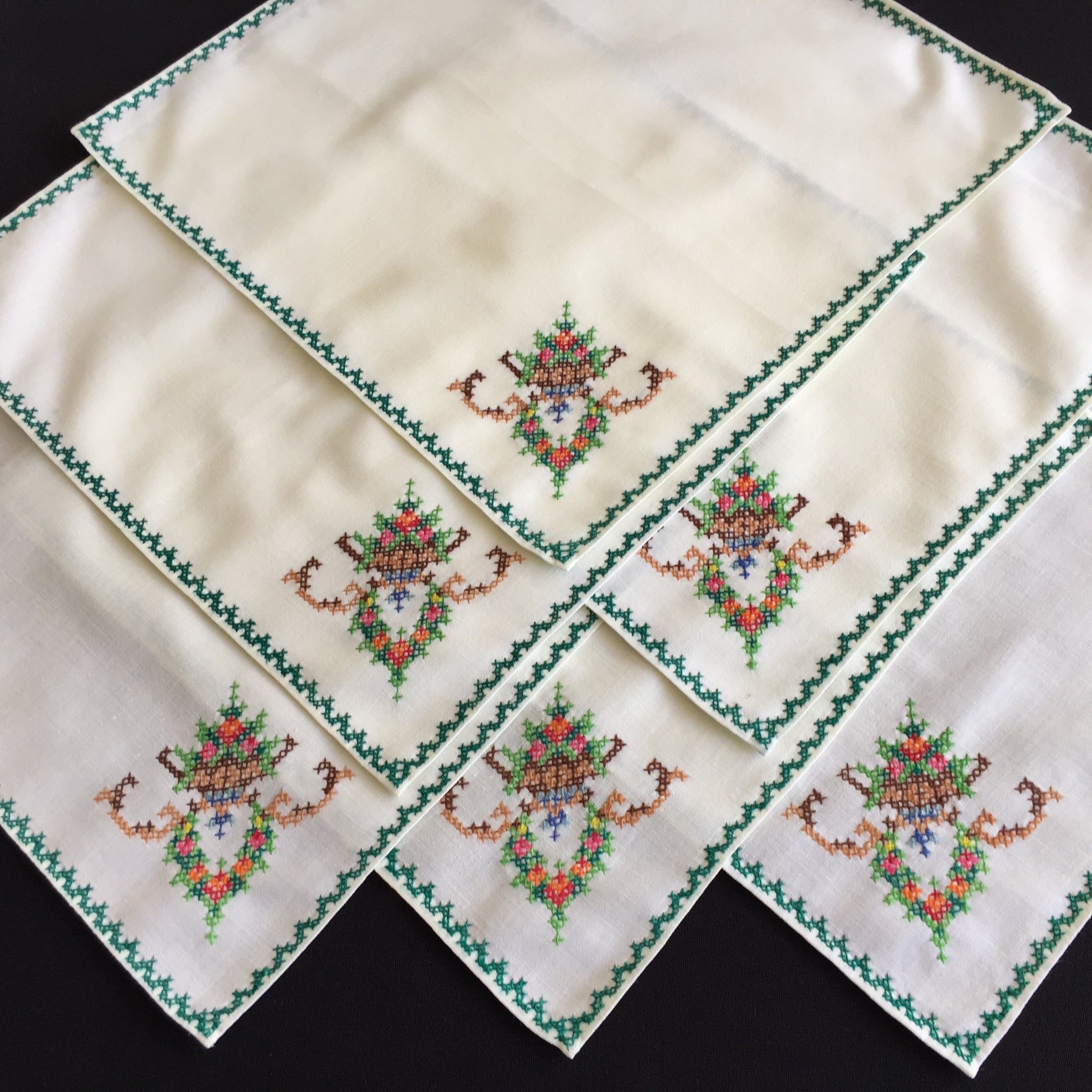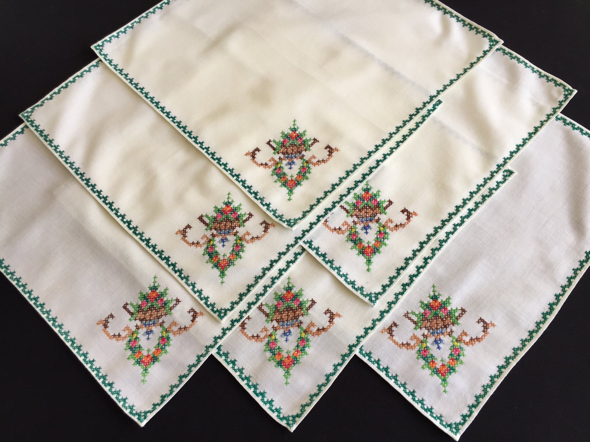 Beautifully handcrafted set of 6 cream/beige cotton napkins with an art deco style cross stitch floral motif in one corner and green edging. Each napkin is measuring around 27 cm (11 inches).