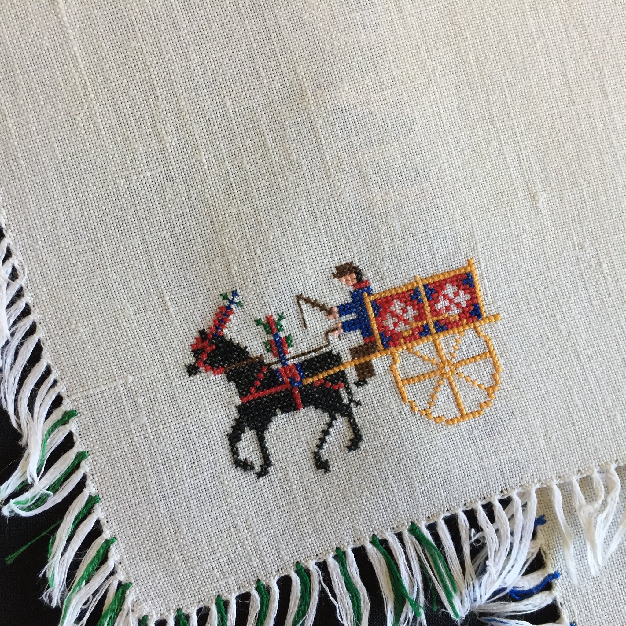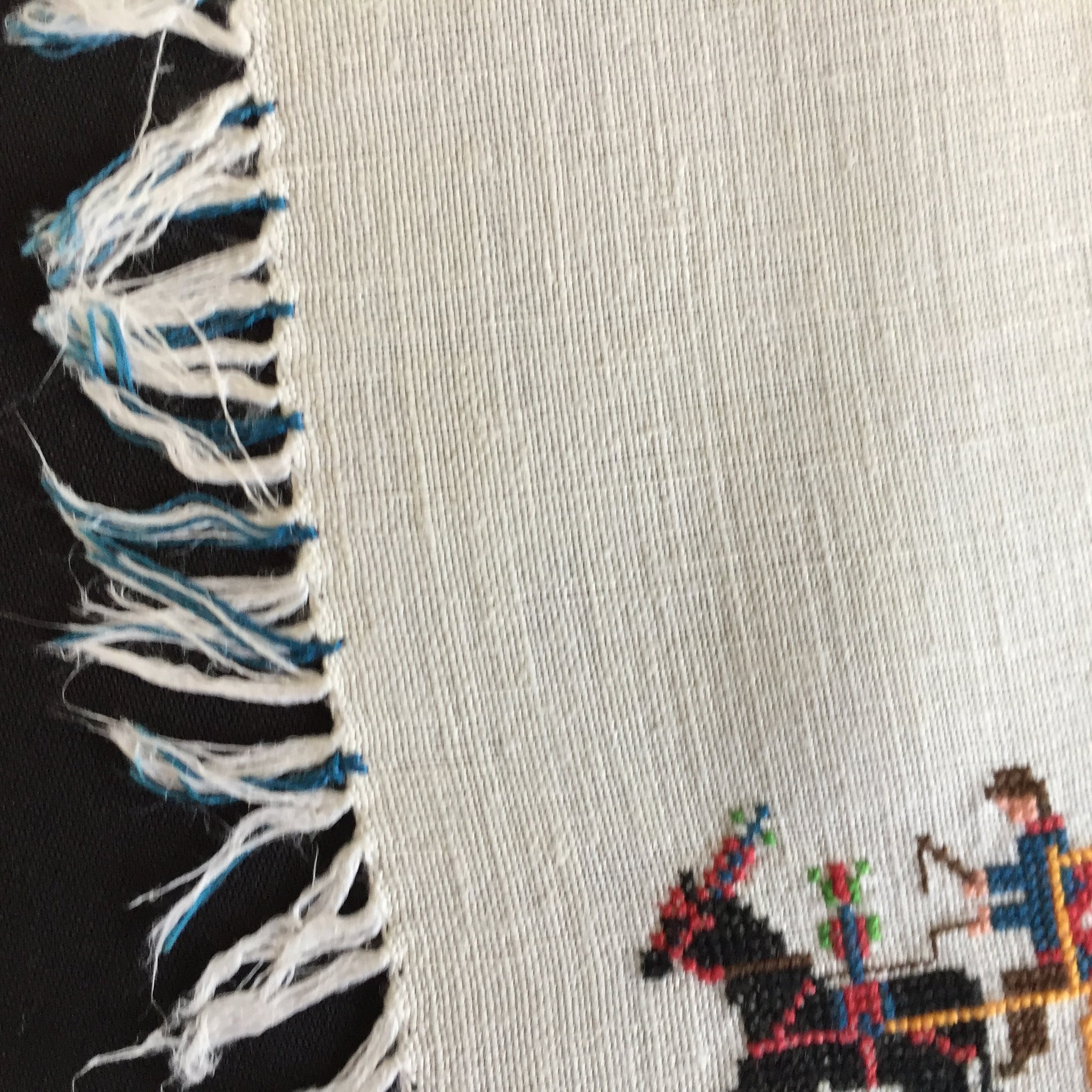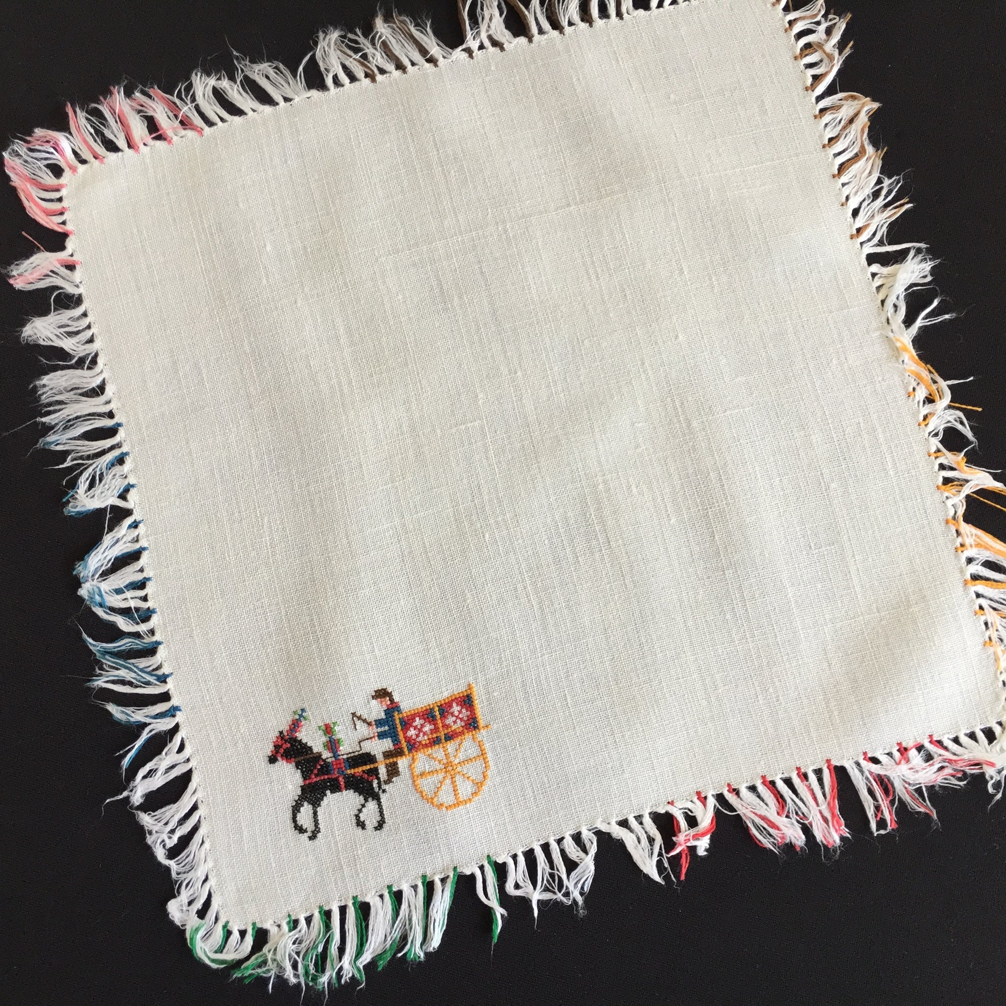 Beautifully handcrafted linen napkin. Gorgeous petit point embroidered motif in one corner, featuring a donkey pulling a cart. Someone went into a lot of trouble for even adding different coloured threads to the fringed edging to match the embroidered picture. Measuring around 26 cm (10.5 inches) square.