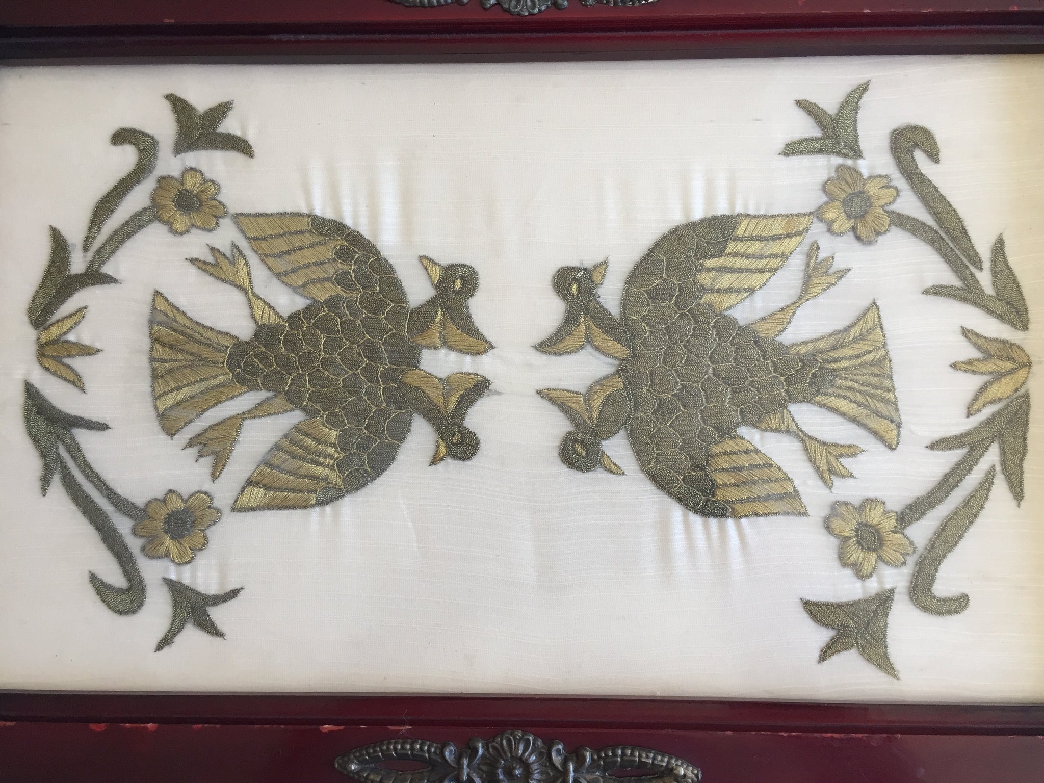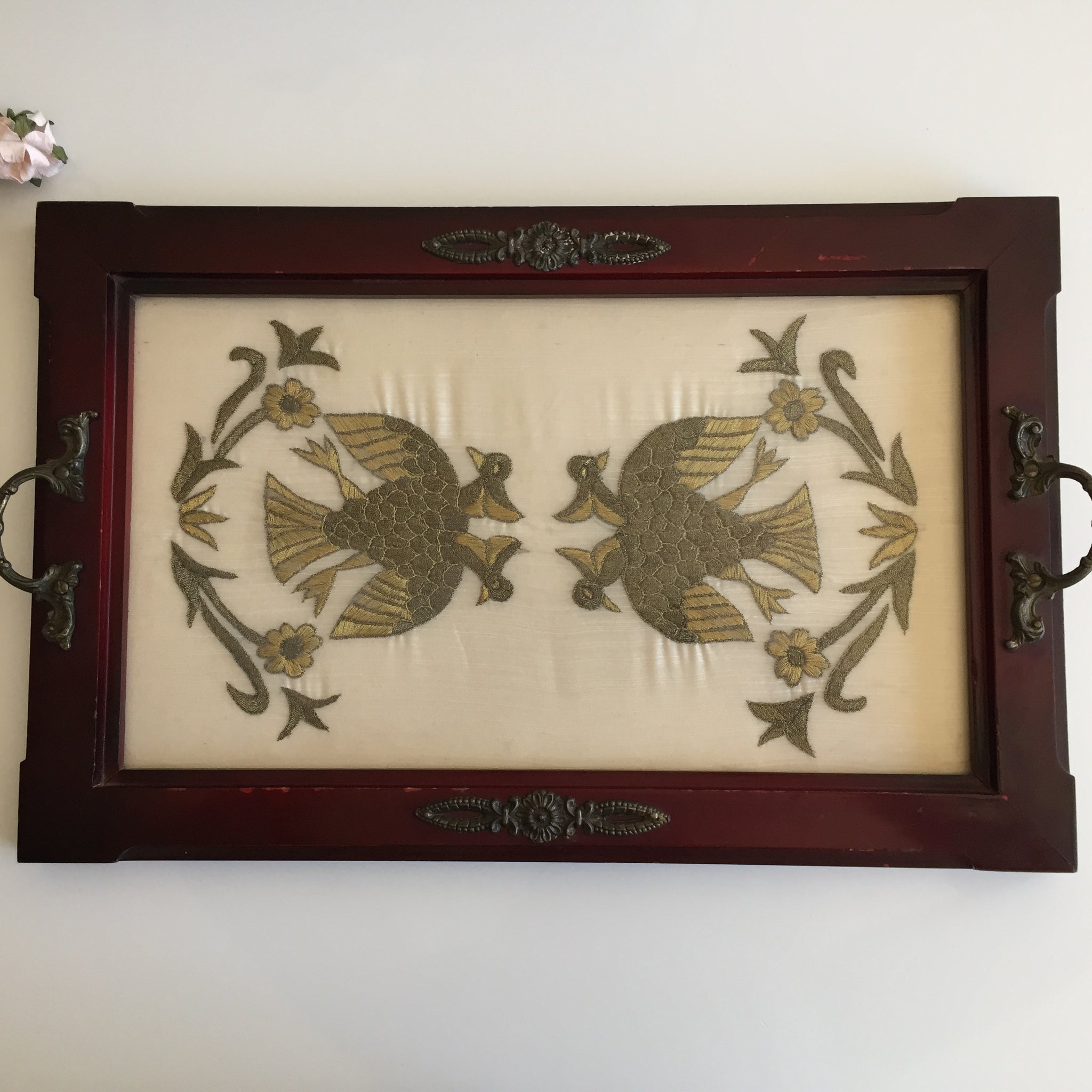 Antique wooden serving tray, featuring a handmade interior gold embroidery on silk fabric layered under clear glass. The central design depicts a symmetrical motif of two birds facing each other, surrounded by floral elements.