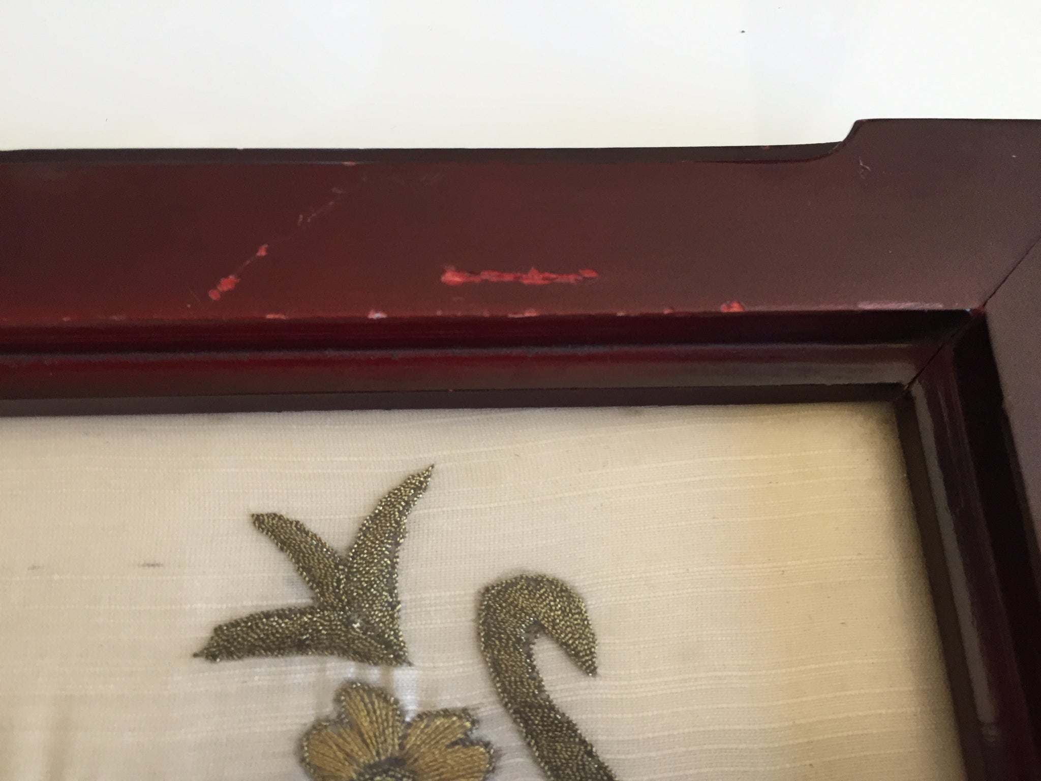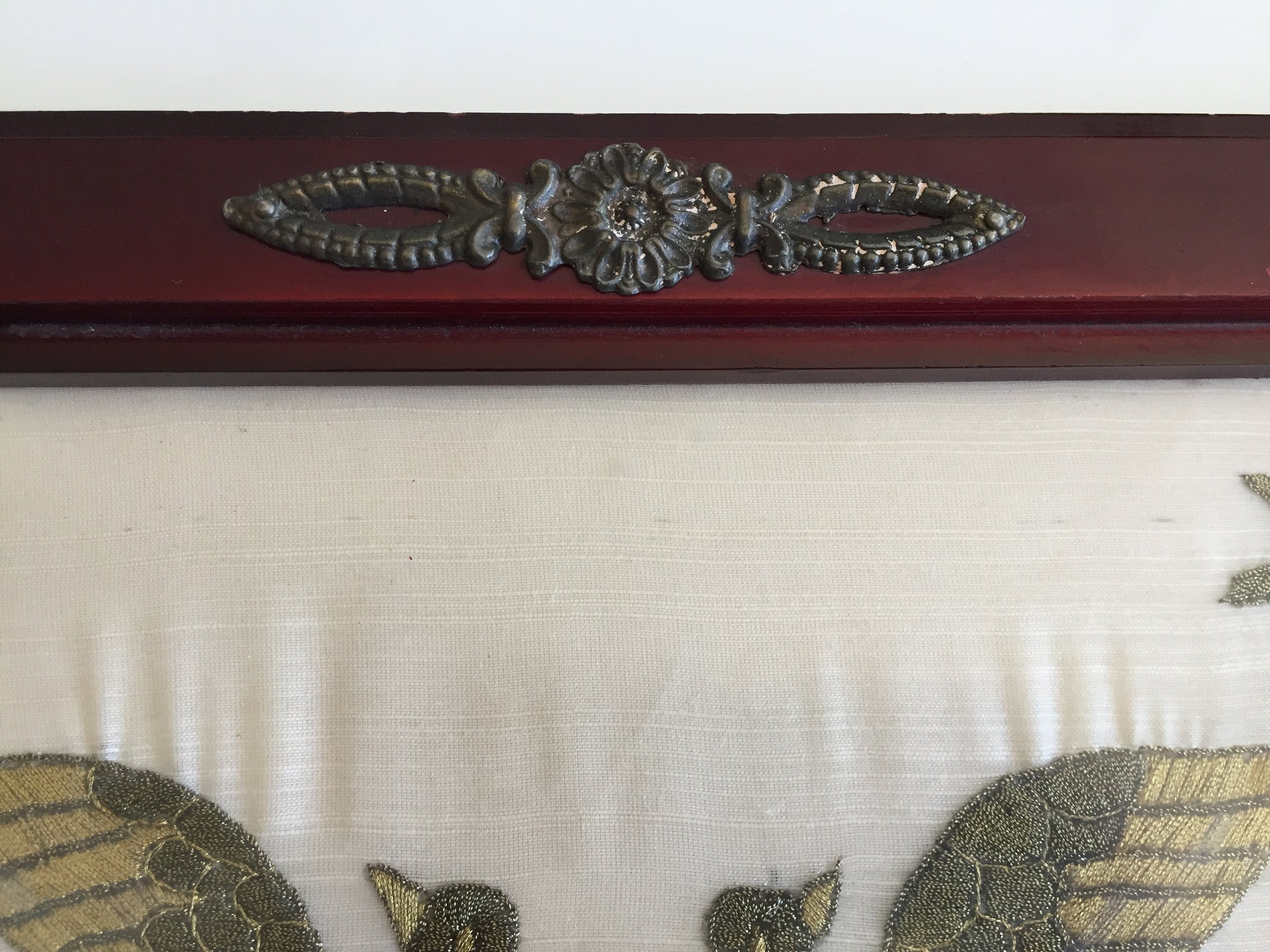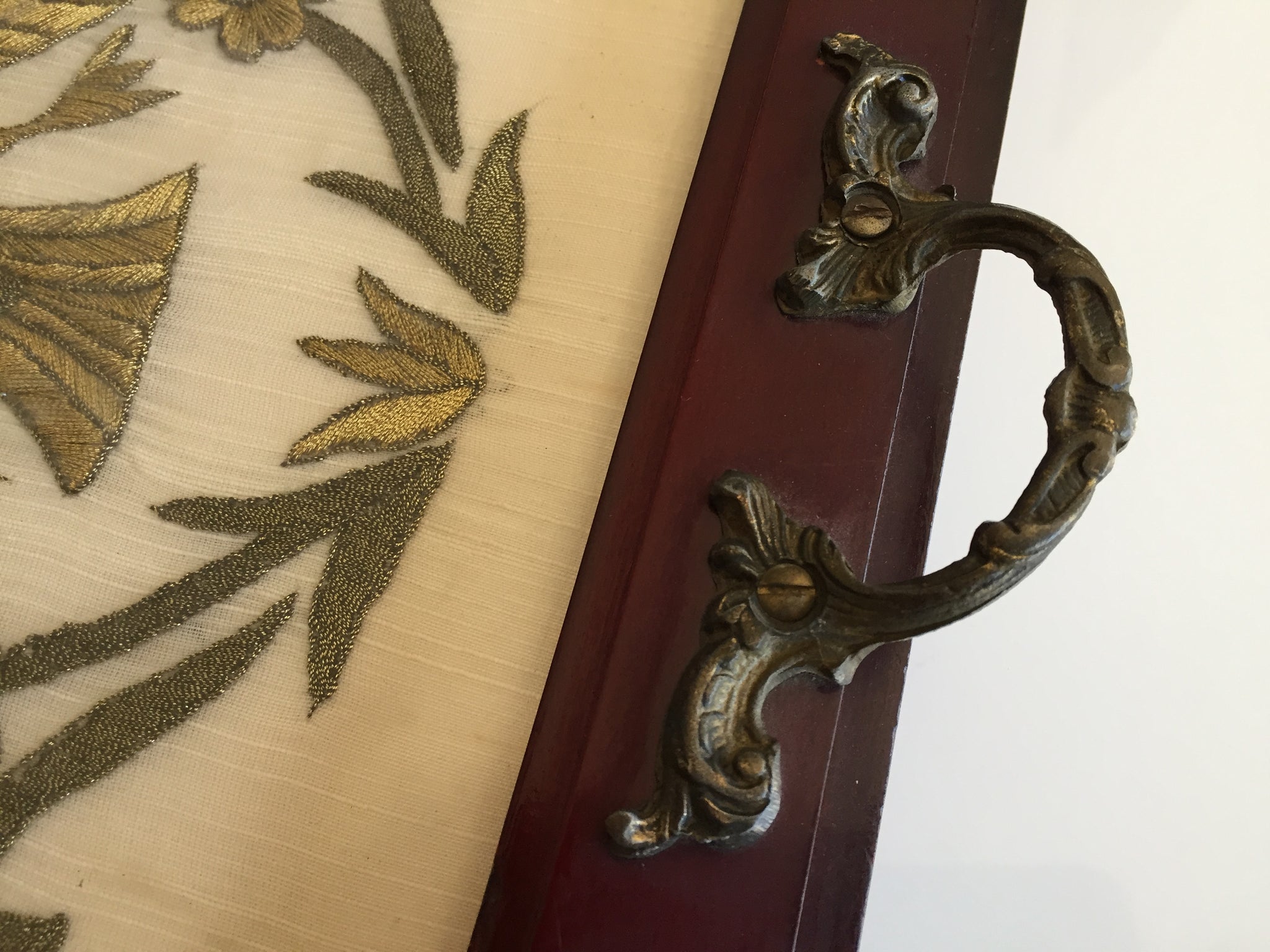 Materials: The tray is constructed from hand-carved wood. The internal artwork is embroidered using silk and gold metallic thread on a silk fabric backing.