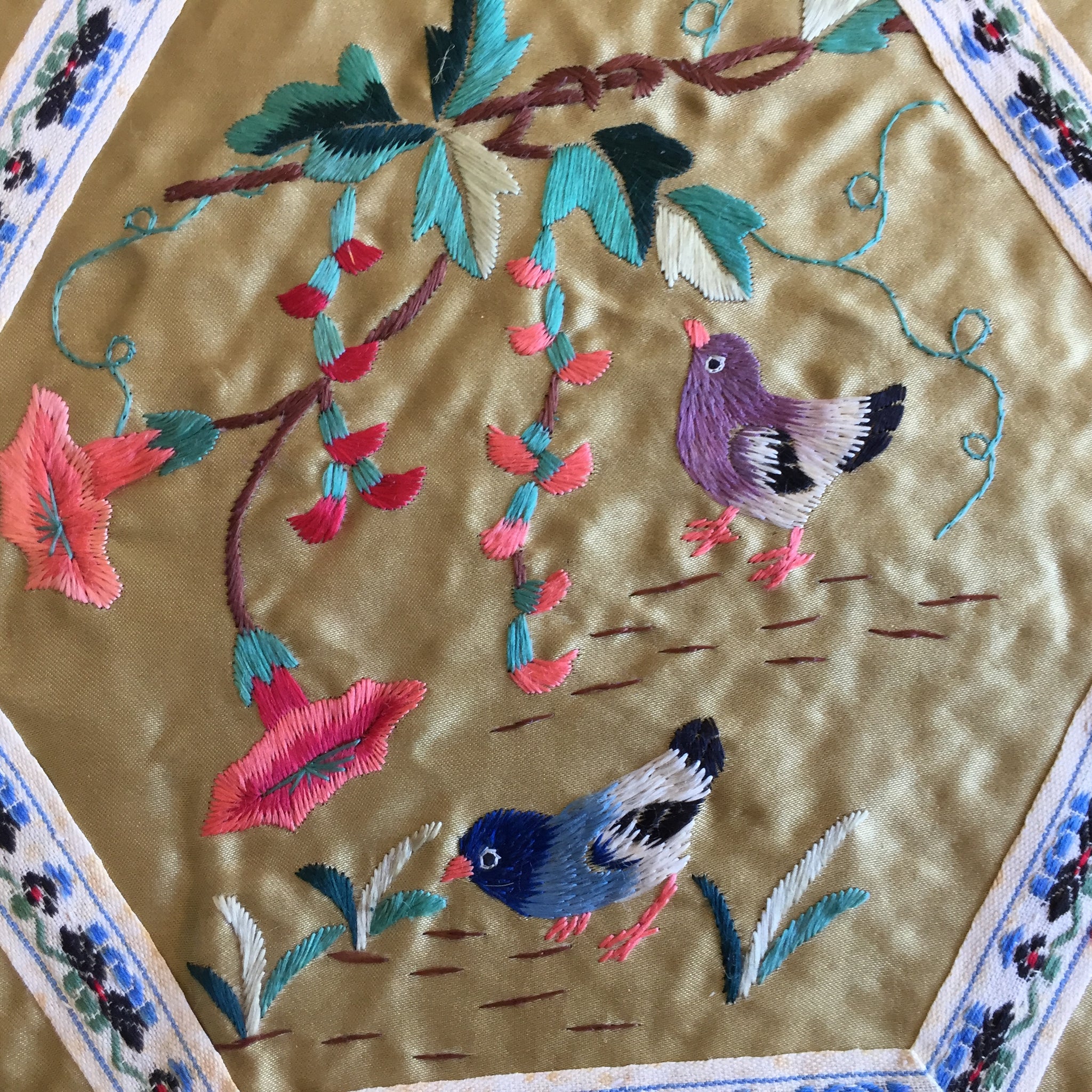 Each stitch tells a story of meticulous craftsmanship, with vibrant silk threads creating dimensional depth and luminous detail that captures light beautifully. In very good vintage condition, this authentic piece bears the gentle patina of age—subtle signs of use that only enhance its character and provenance.