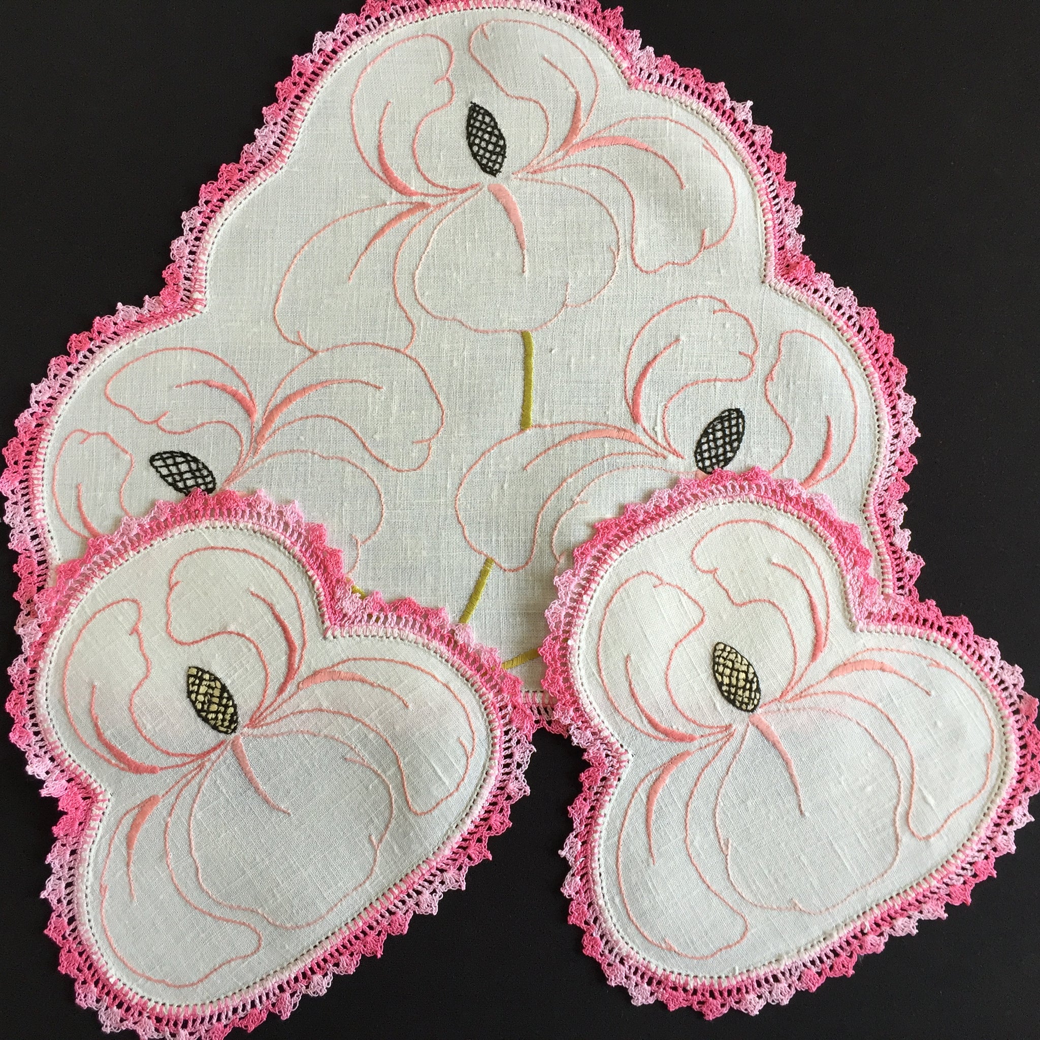 A treasured trio of hand-embroidered doilies that capture the elegance of Australian vintage craftsmanship. Originally designed for the dressing tables of discerning homemakers, this three-piece set brings authentic period charm and refined detail to any room. Each piece showcases delicate floral embroidery, telling the story of a graceful era when such handcrafted textiles were cherished heirlooms passed through generations.