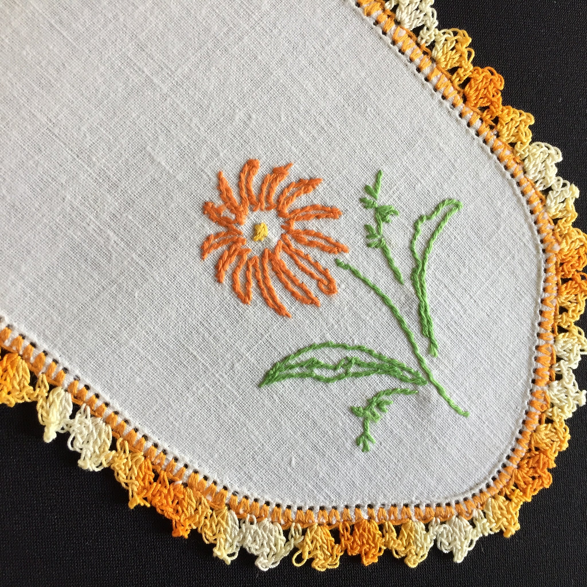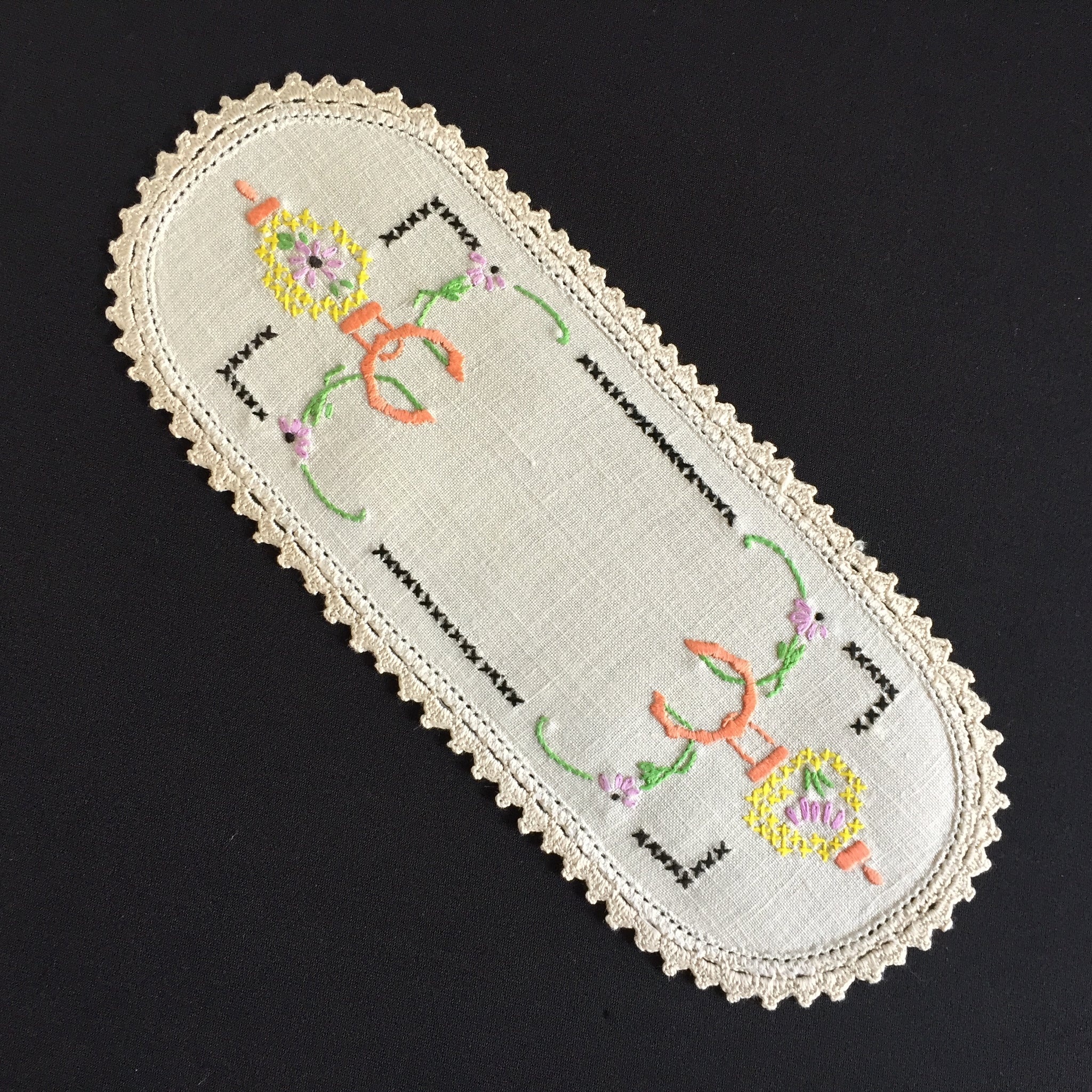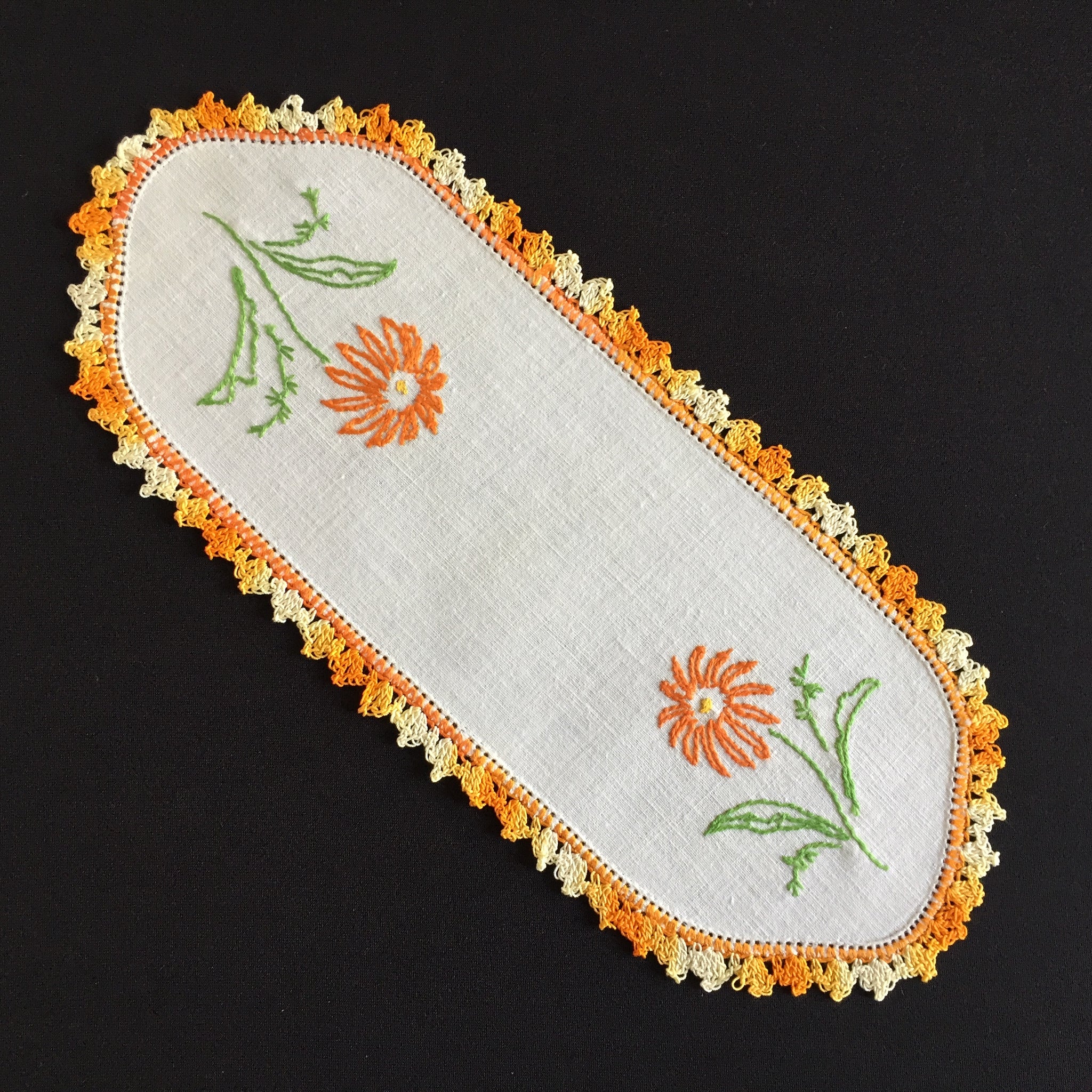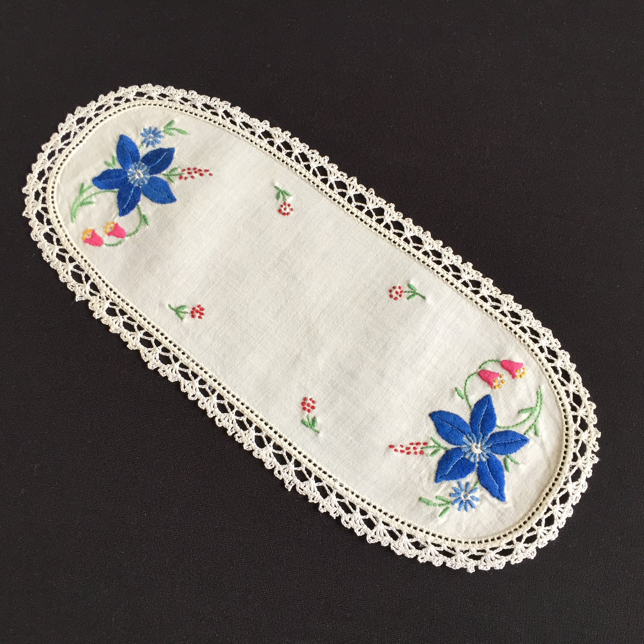 Discover the quiet elegance of these Australian vintage hand-embroidered sandwich doilies—oblong treasures measuring 20-28cm, adorned with intricate floral needlework.
