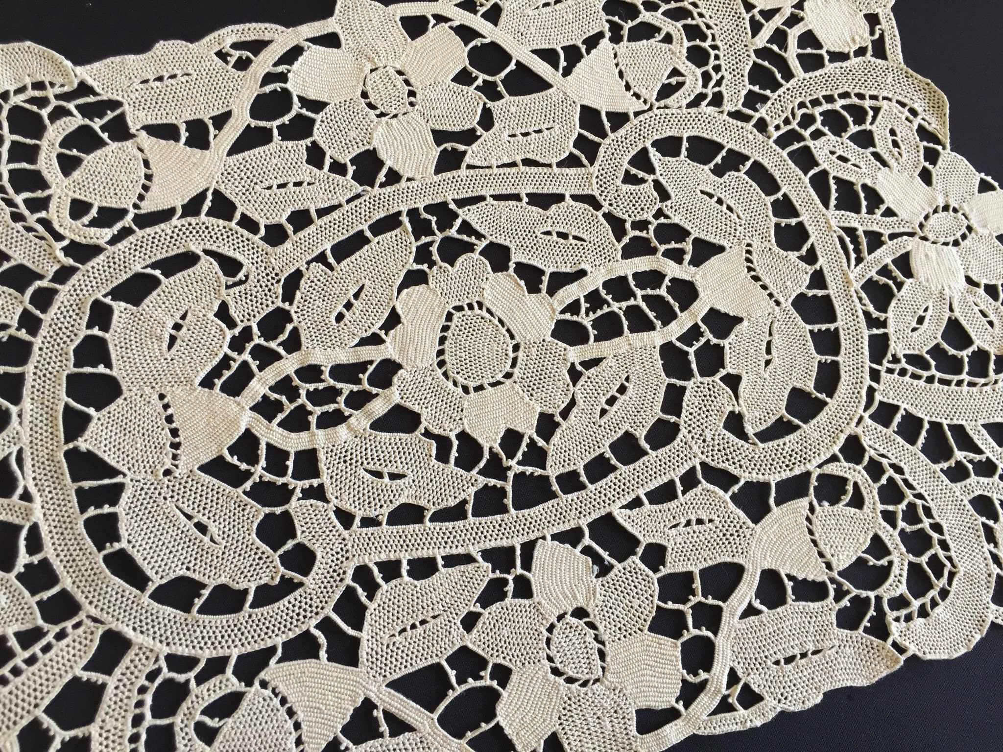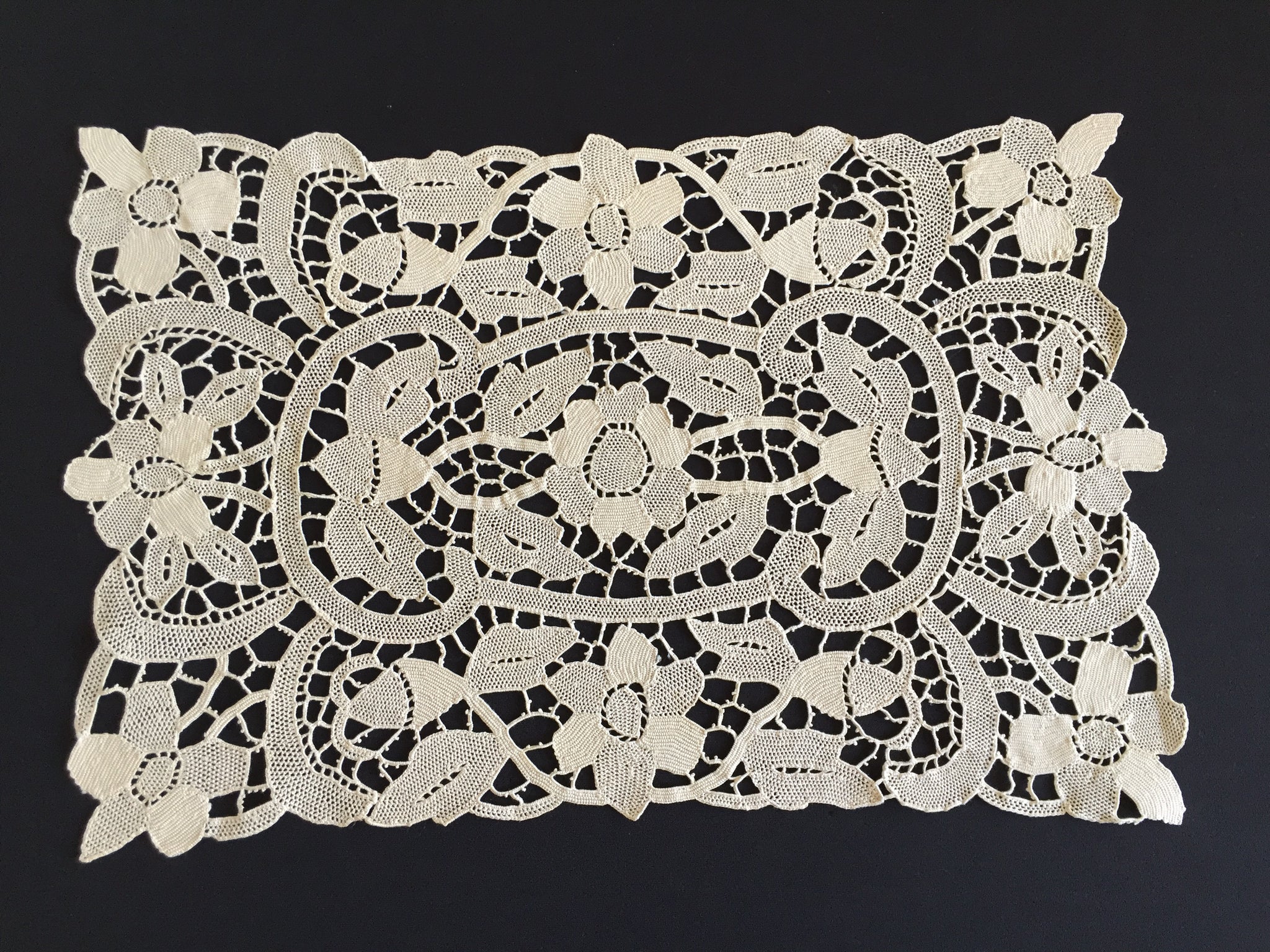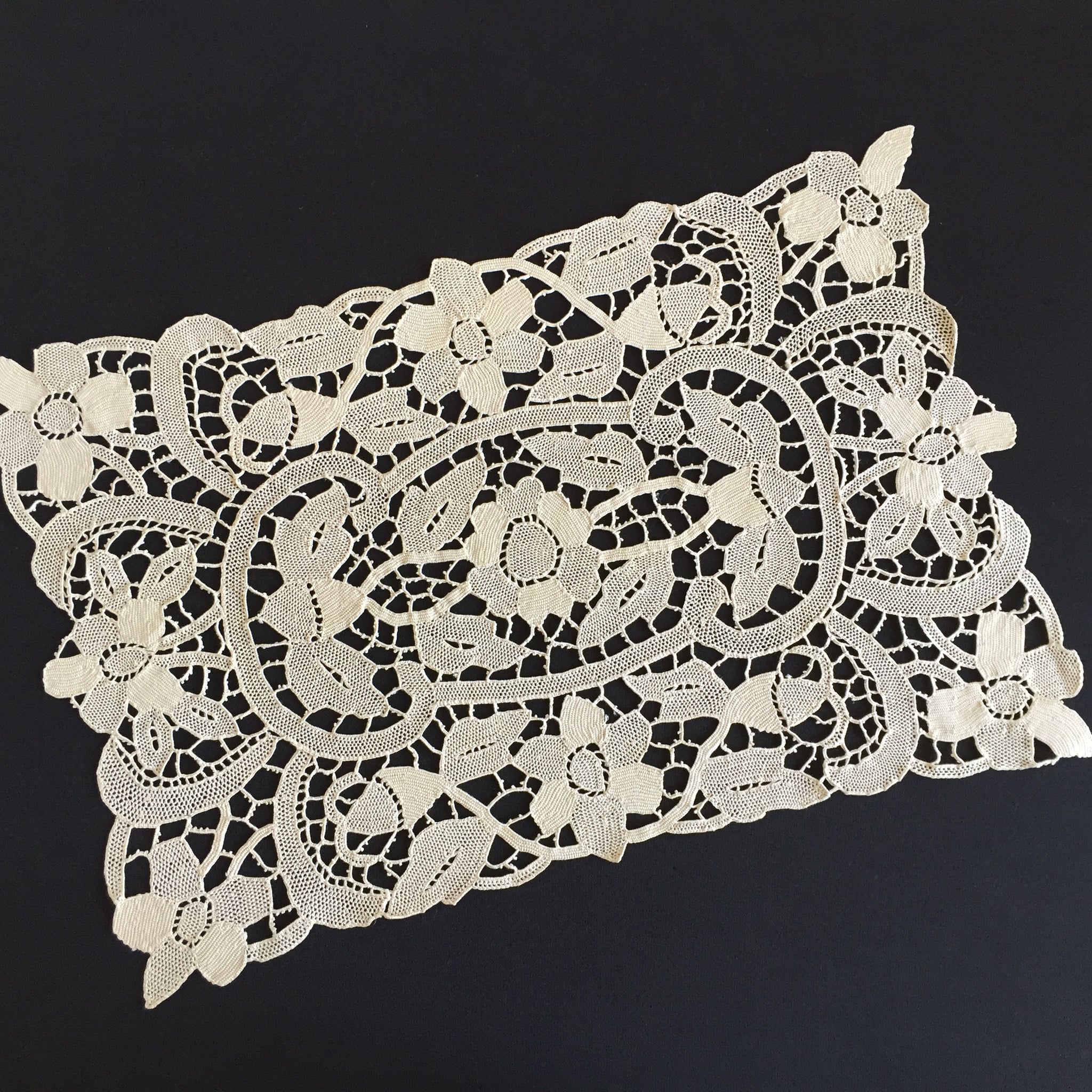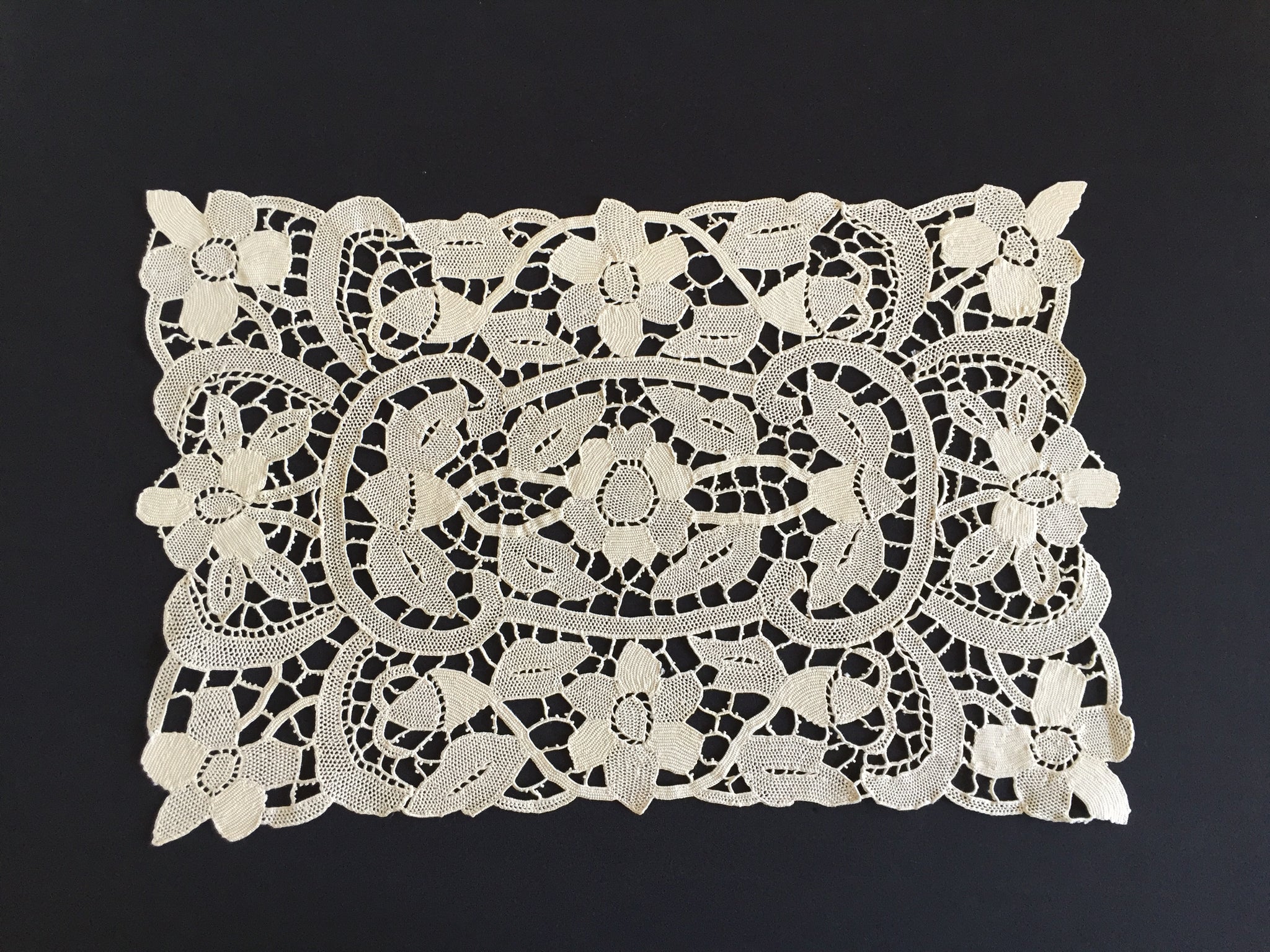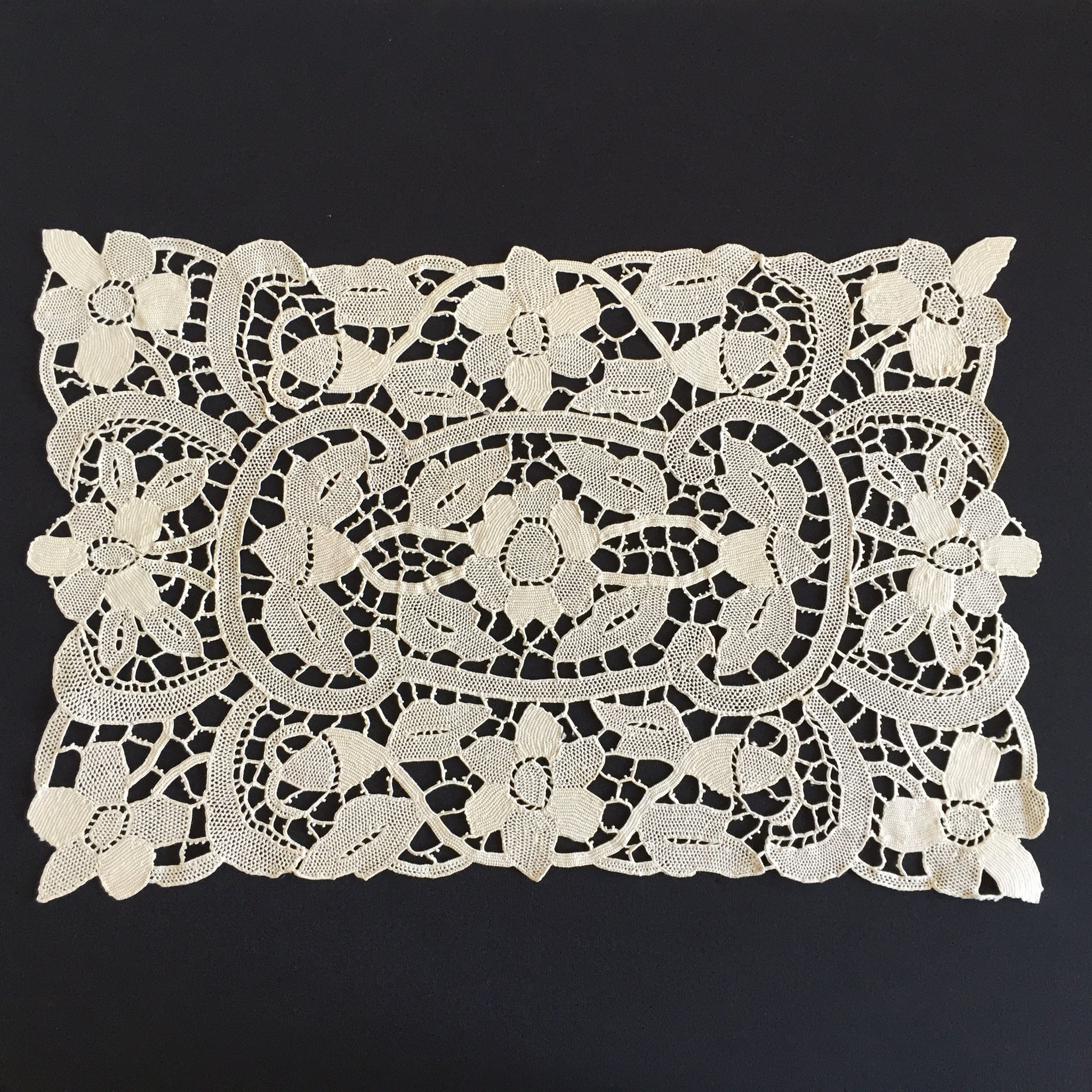 Measuring around 42 x 28 cm (16.5 x11"). Material: Champagne/ecru colour cotton or linen thread.