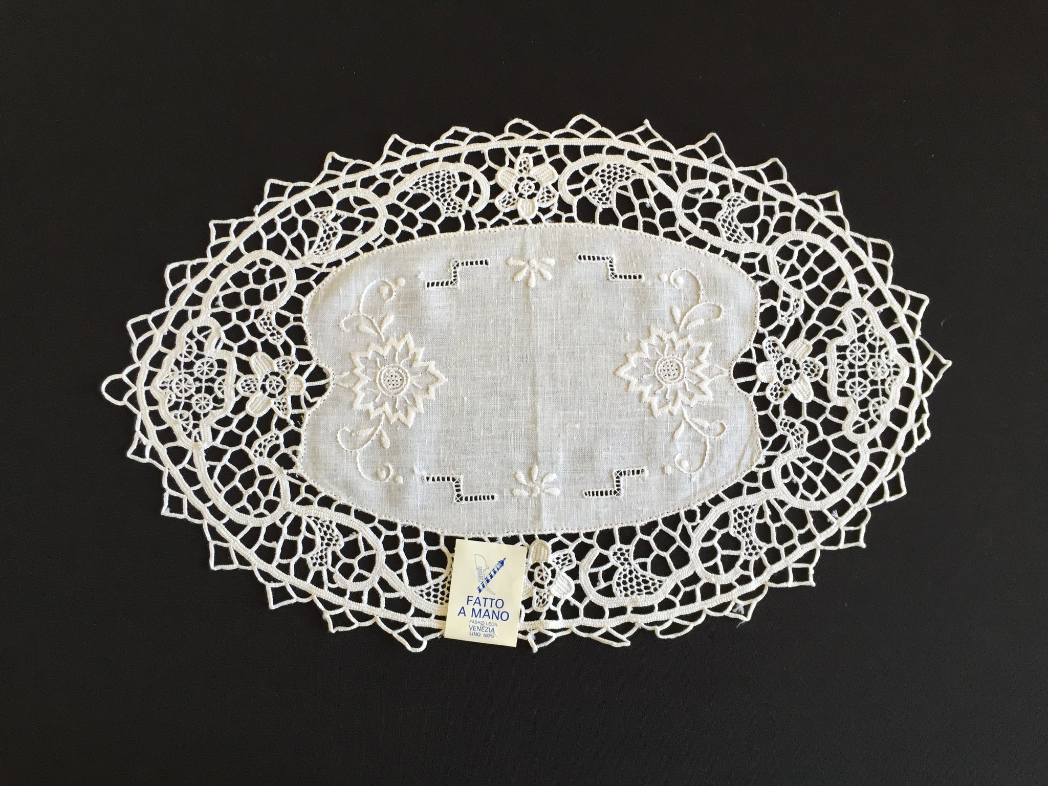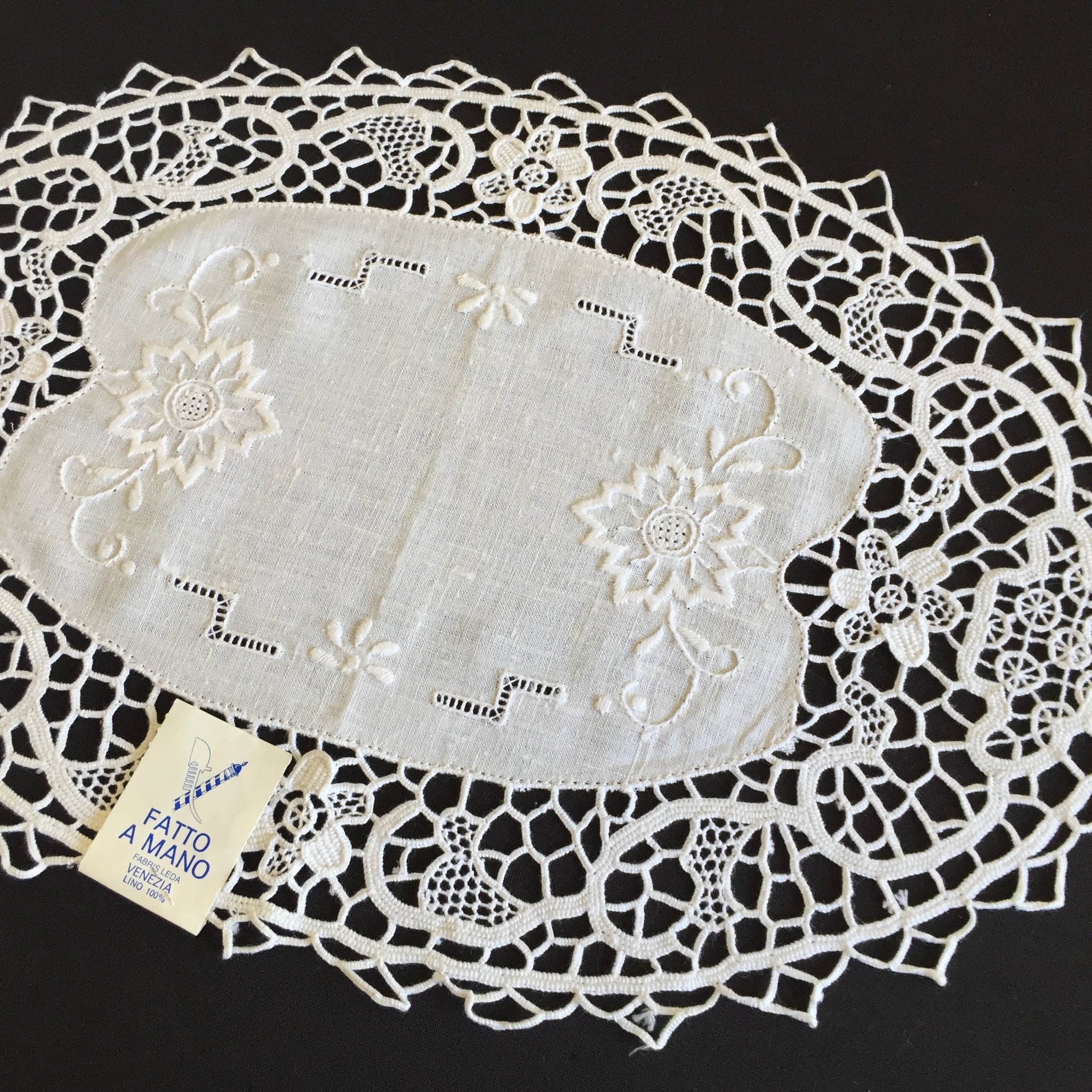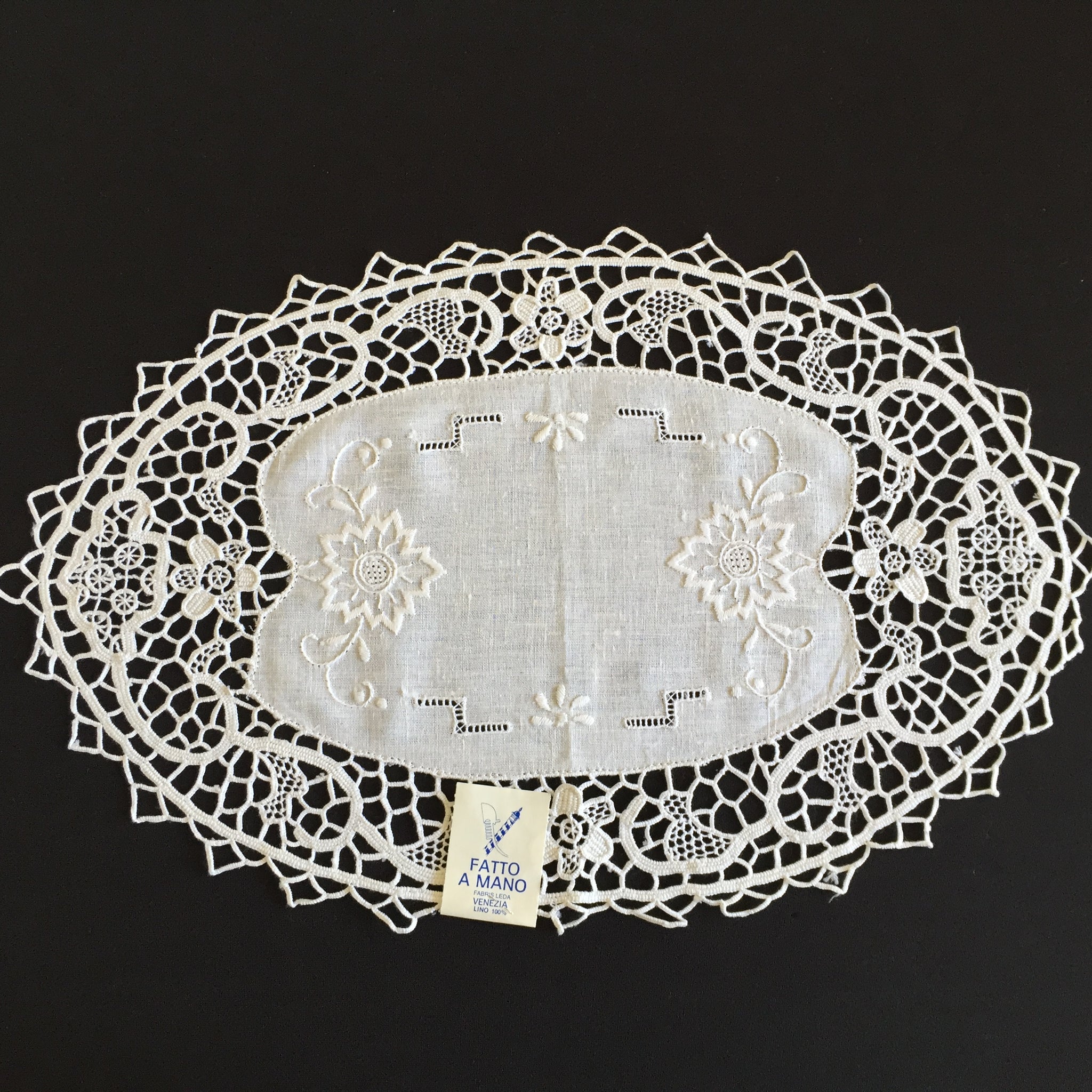 This stunning authentic handcrafted Italian lace doily would have taken weeks to make. It has a hand embroidered white linen centre with beautiful, deep Point de Venise needle lace edging.