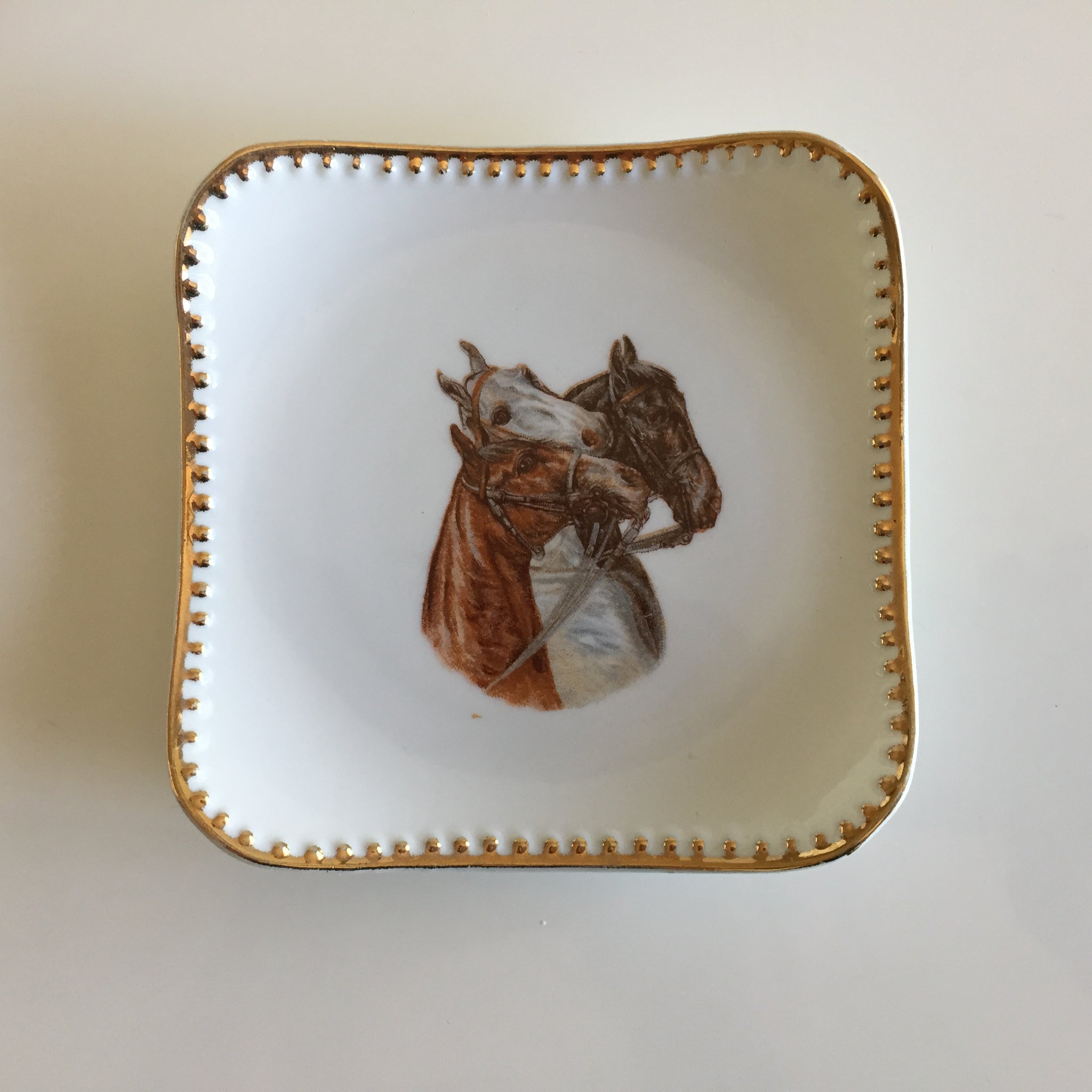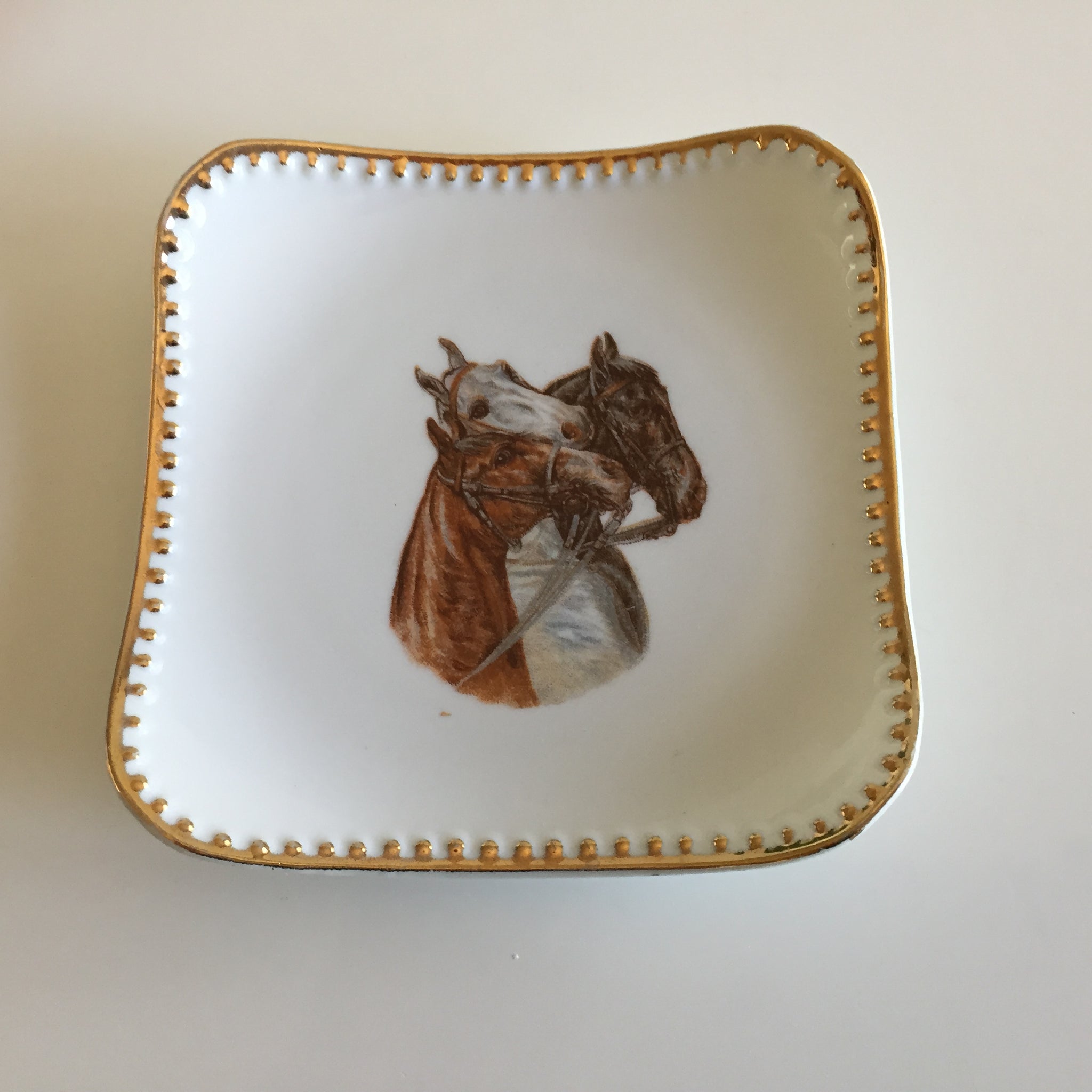 This charming vintage ring dish from Westminster Australia showcases a spirited bridled horses motif accented with a gilded rope border, all contained within a neat 9 cm square footprint. Perfect for safeguarding your most precious rings and jewellery, it merges practical function with genuine artistic heritage.