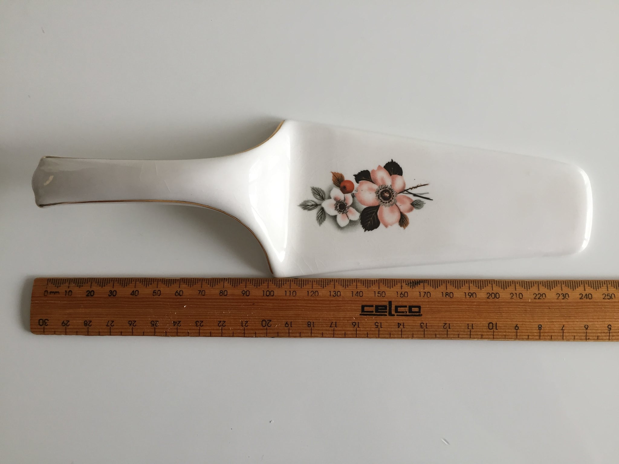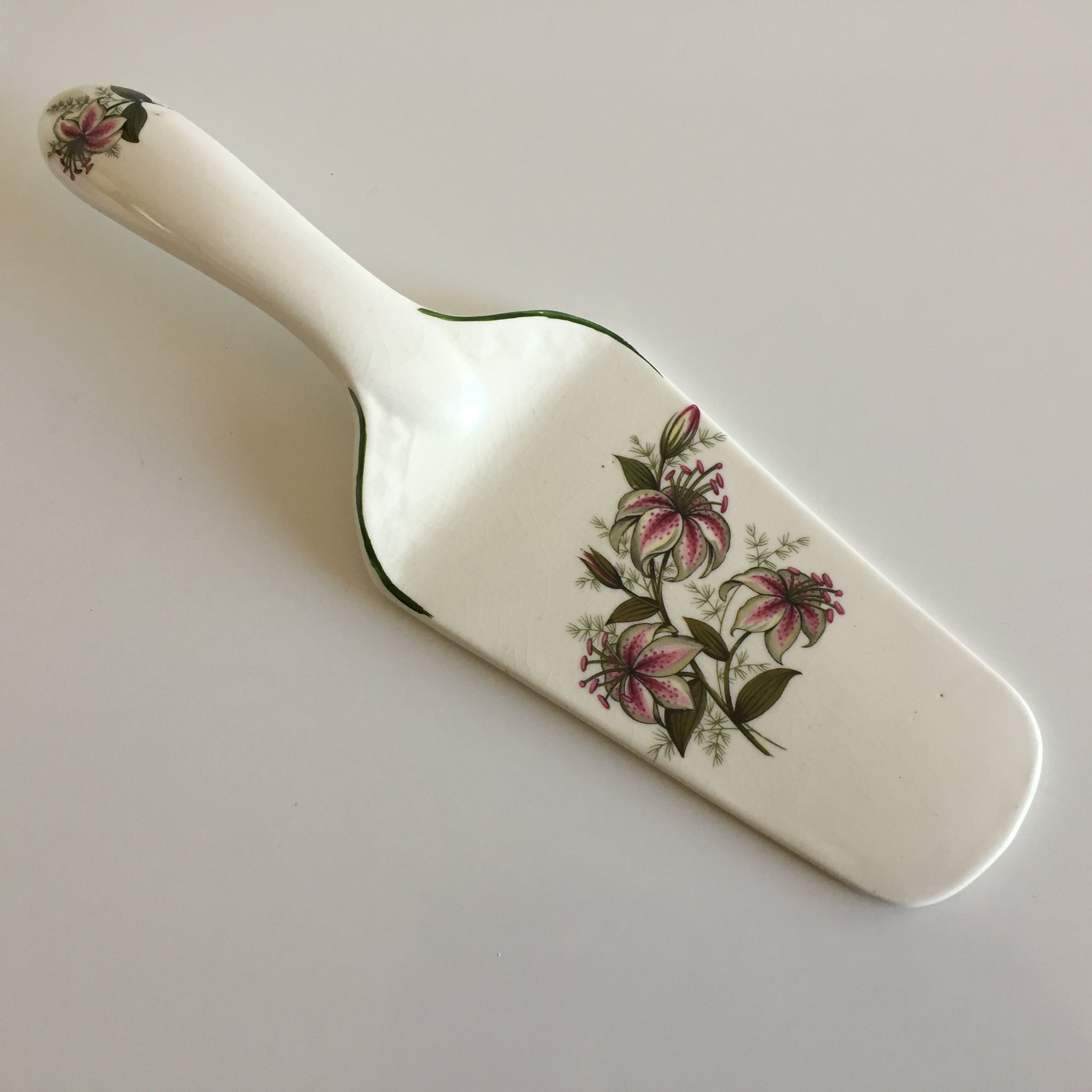 This charming English vintage ceramic spatula features a delicate floral pattern and represents a genuine piece of culinary history. Handcrafted by respected European potteries during the early-to-mid 20th century, it embodies the superior craftsmanship of a bygone era when quality and longevity were paramount.