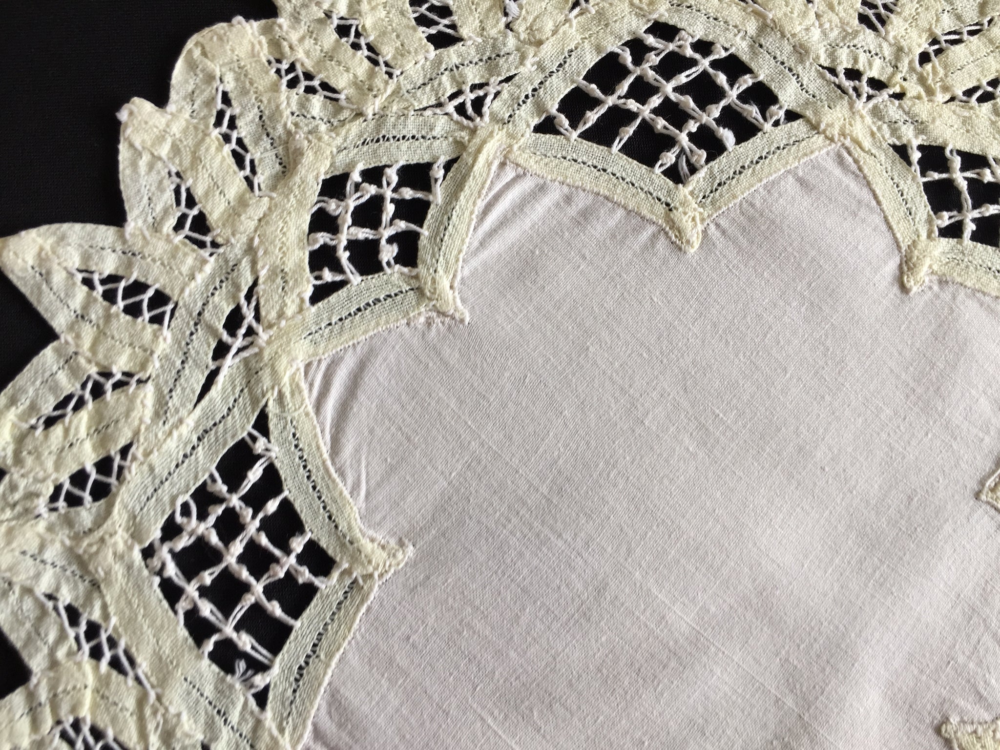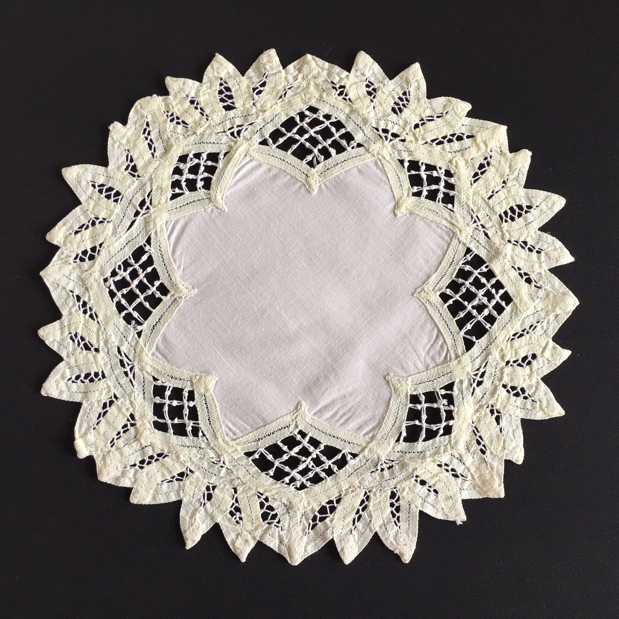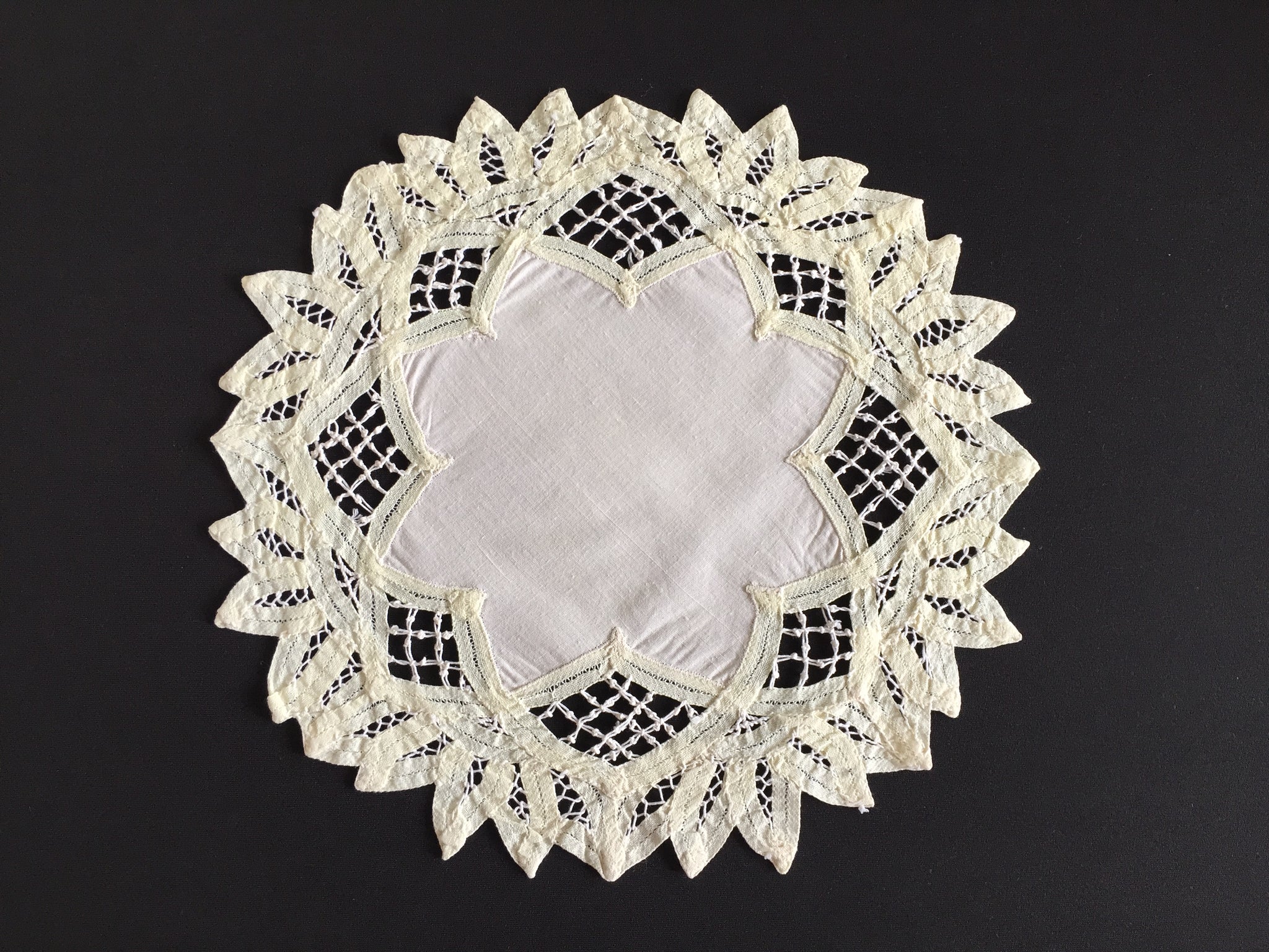 Discover the refined beauty of authentic vintage craftsmanship with this handmade Battenburg lace doily. Meticulously created using traditional lacemaking techniques, this 28 cm (11.5") cotton piece showcases the intricate artistry that defined early textile work.