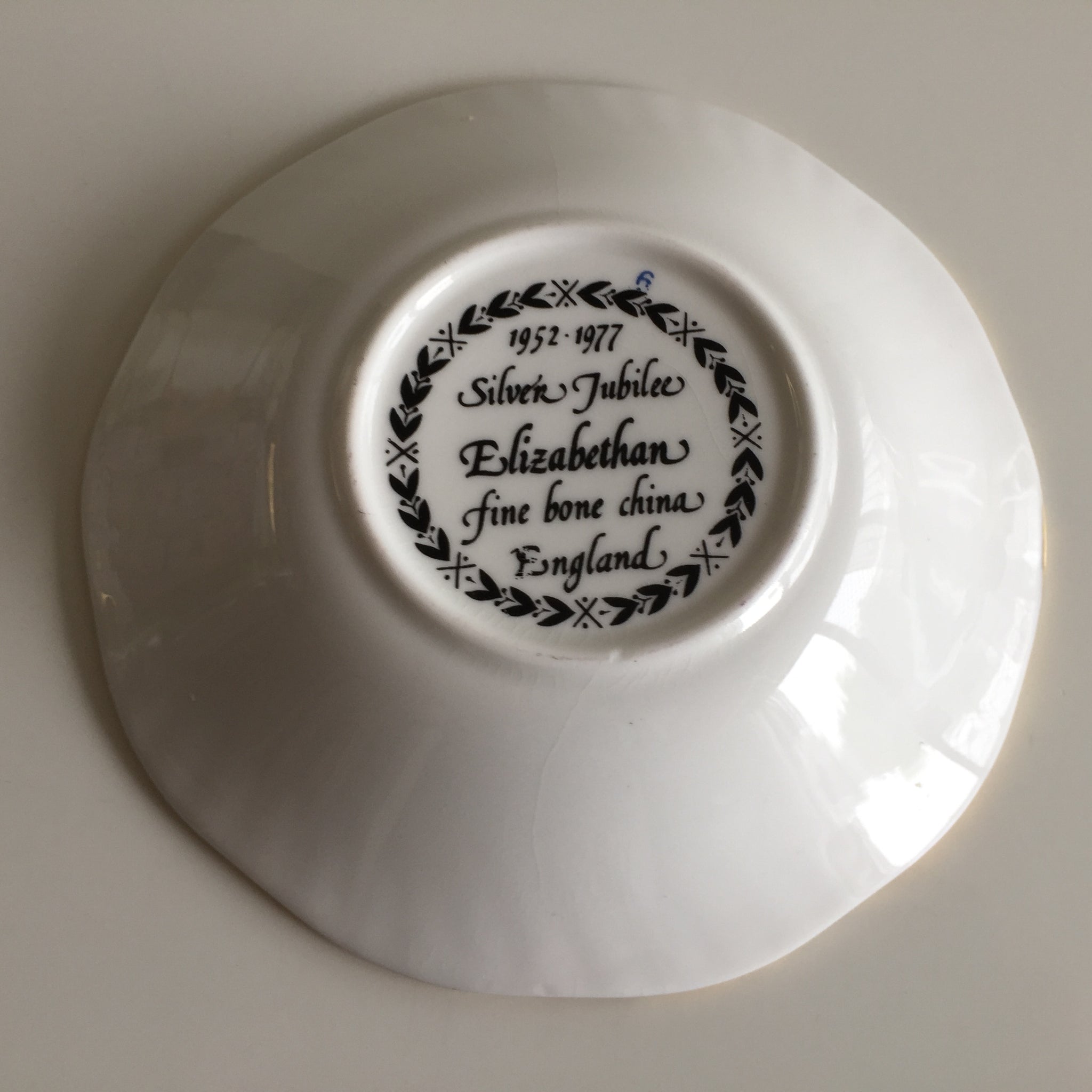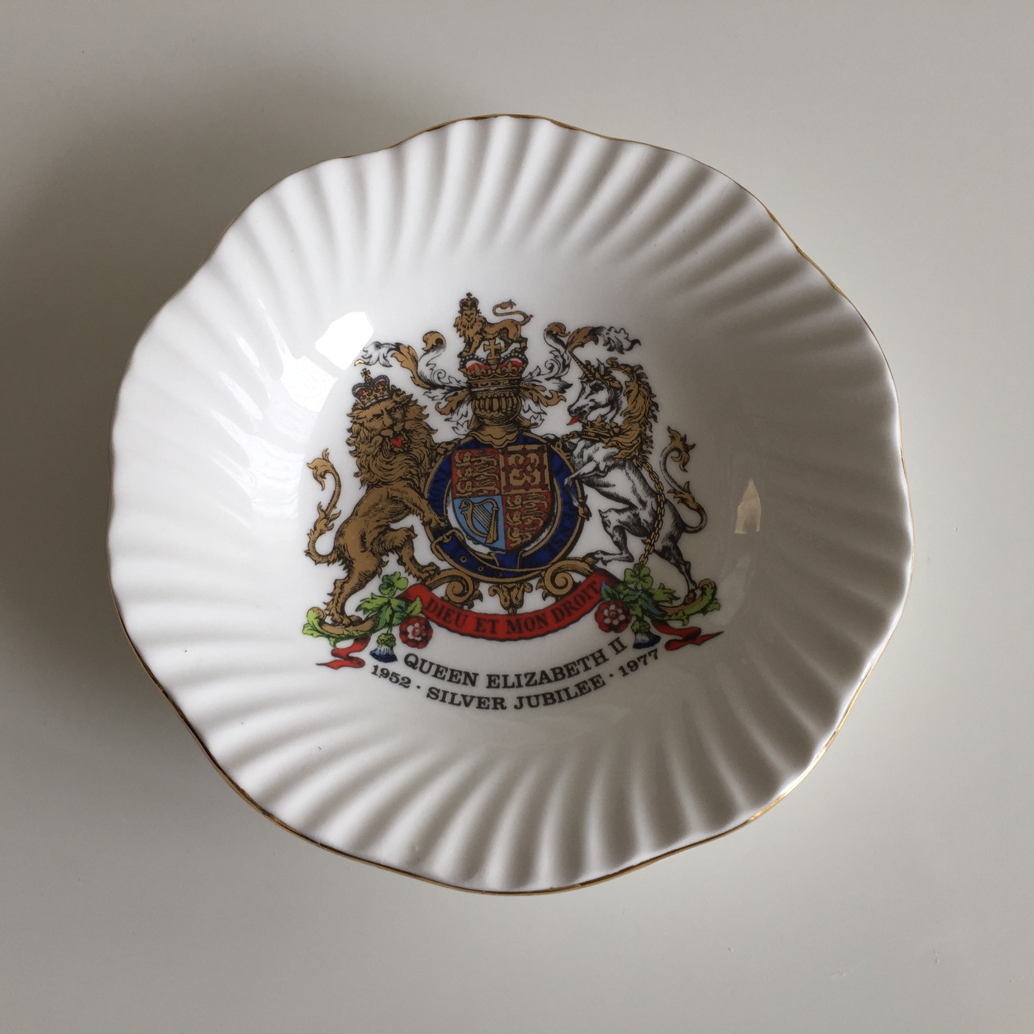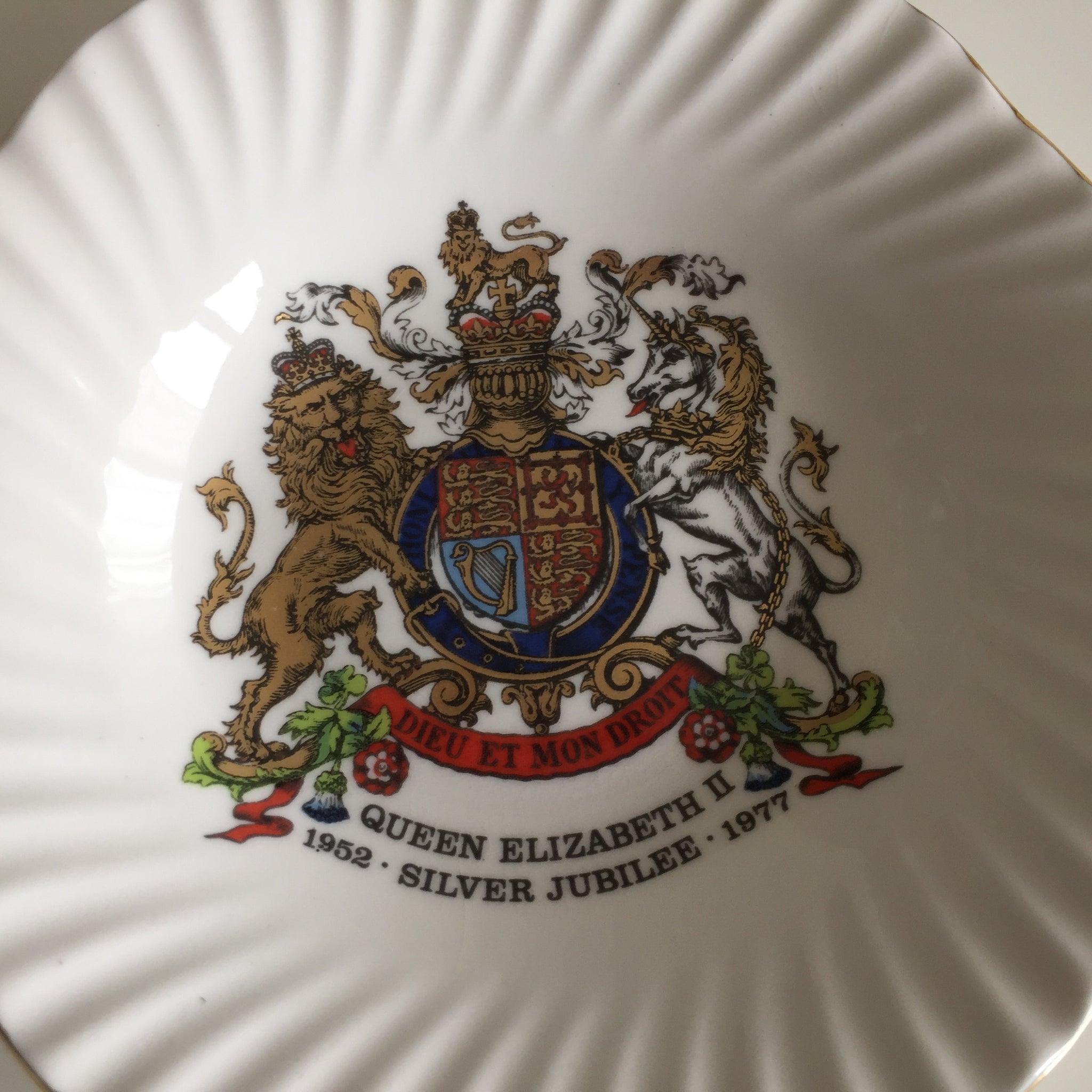 A stunning piece of royal history, this 1977 bone china commemorative dish celebrates Queen Elizabeth II's Silver Jubilee with timeless elegance. The centre showcases the Royal Coat of Arms of the United Kingdom, surrounded by gilt-edged scalloped detailing and carefully inscribed text including "QUEEN ELIZABETH II," "1952 SILVER JUBILEE 1977," and the royal motto "DIEU ET MON DROIT."