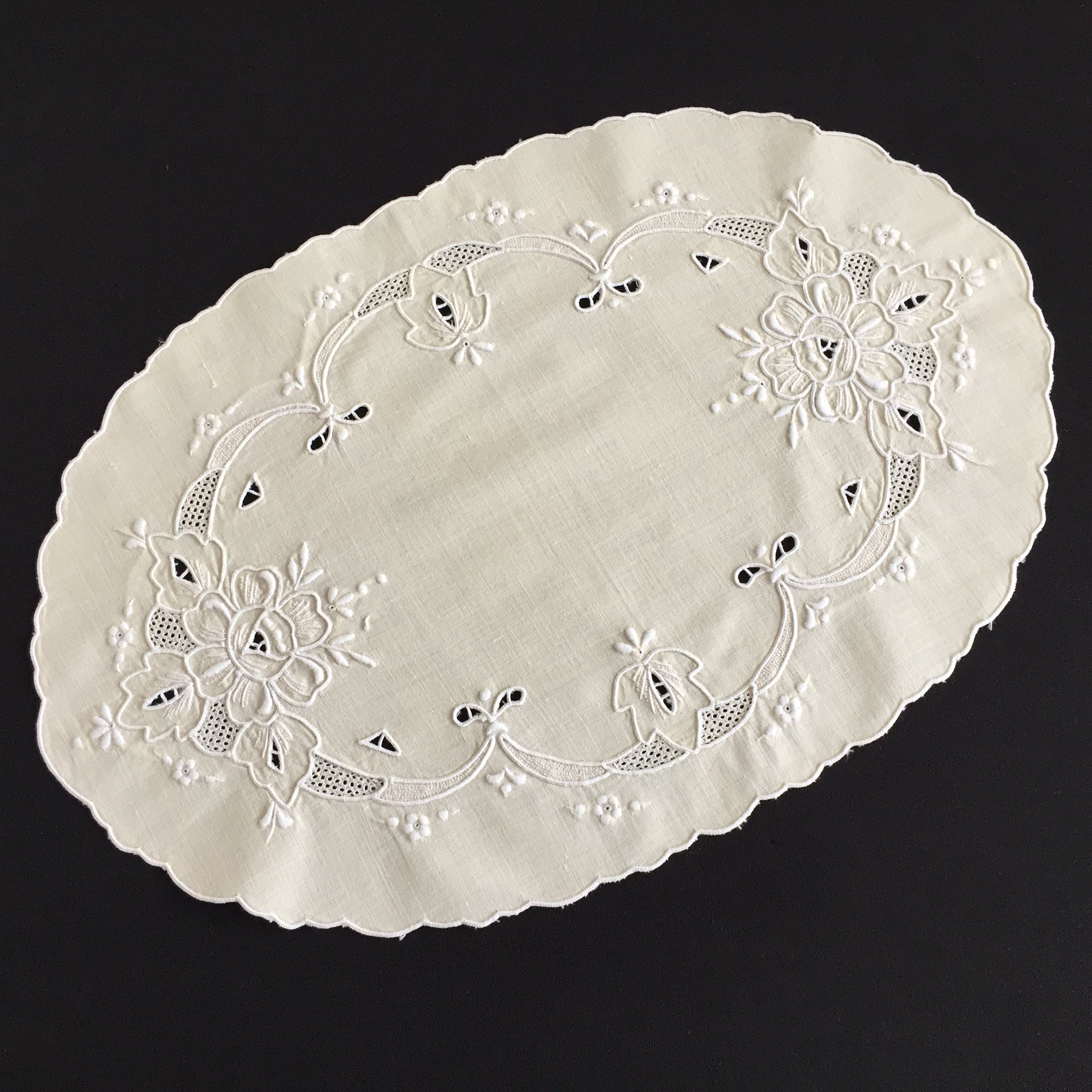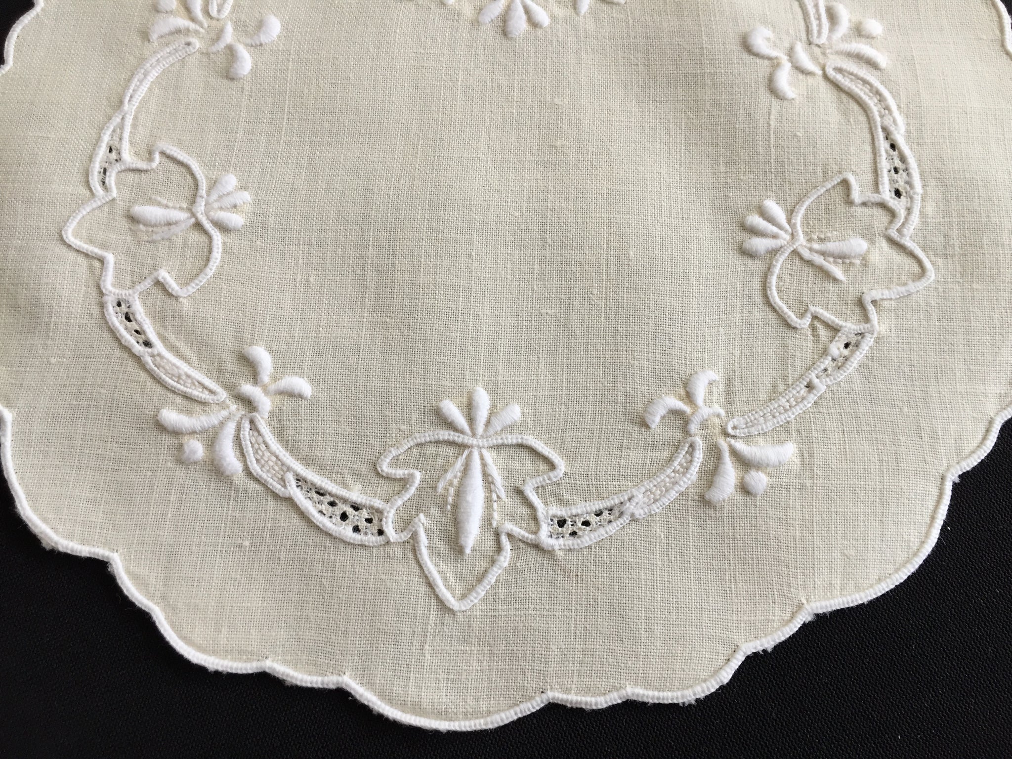 Discover the timeless elegance of this vintage cream cotton doily, meticulously adorned with Madeira cutwork embroidery and delicate white floral details. Hand-stitched scalloped edges showcase authentic artisanal craftsmanship from a cherished era. Available in two versatile sizes—a generous 40 x 27 cm oval placemat perfect for dining displays, or an intimate 17 cm cake doily ideal for intimate table settings.
