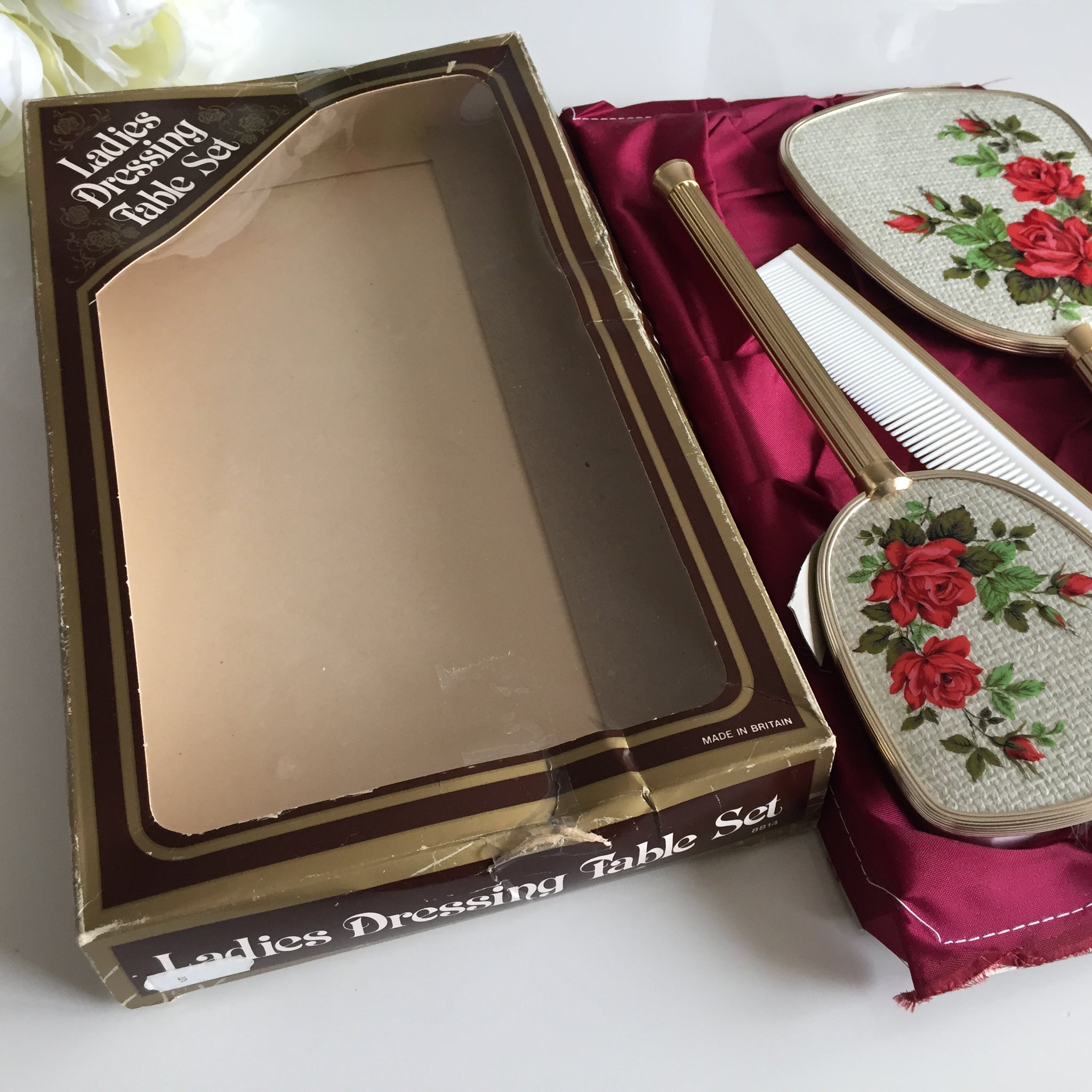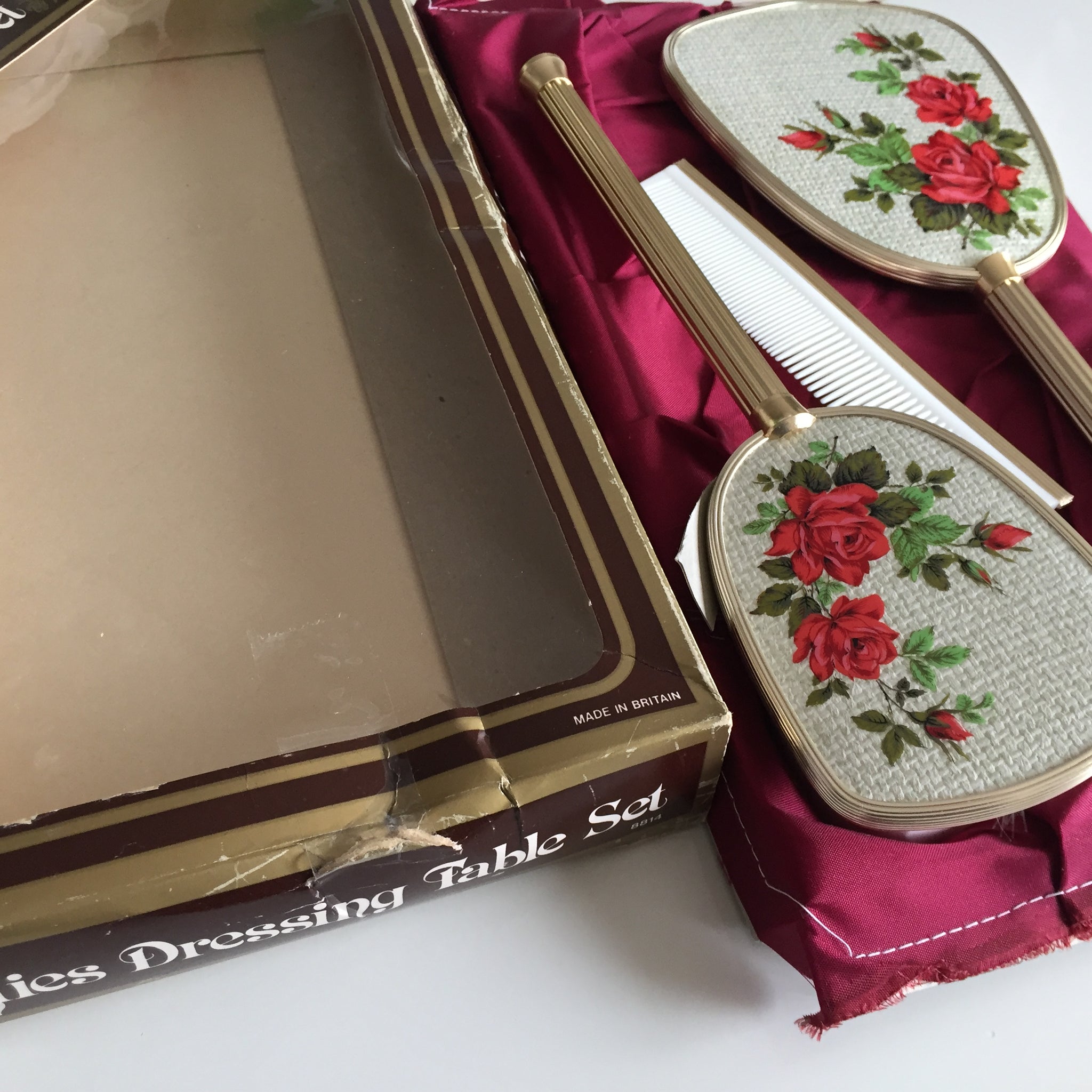 The original packaging—though showing gentle signs of age—speaks to the set's authenticity and heritage. Whether you're a serious vintage collector, an interior design enthusiast seeking statement pieces, or someone who appreciates the artistry of mid-century British manufacturing, this vanity set offers both aesthetic charm and investment value. A rare find that celebrates timeless beauty and exceptional quality.