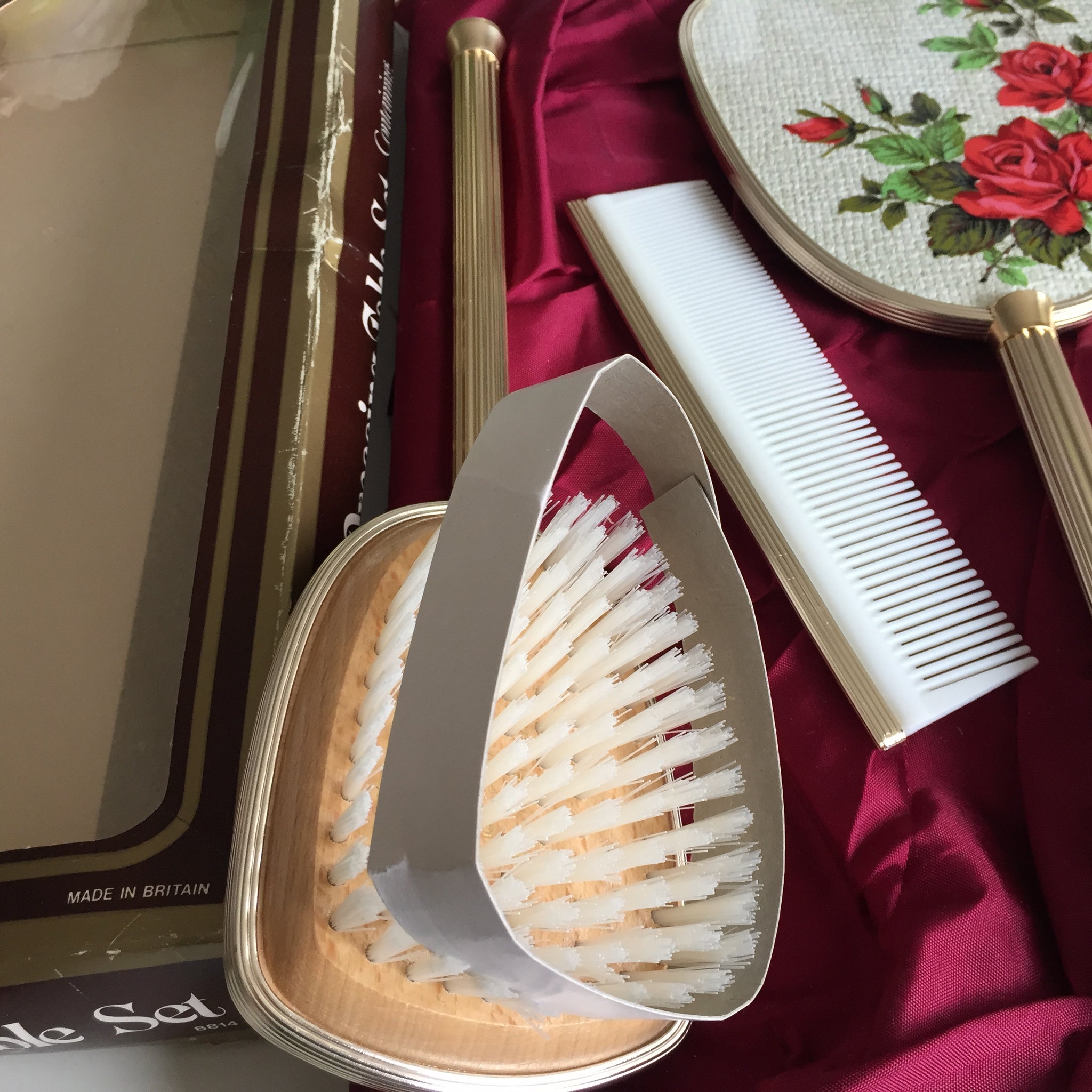 Discover authentic 1950s elegance with this pristine Rondis England vanity set—a true collector's treasure. This three-piece ensemble features a hand mirror and brush adorned with delicate red rose motifs, paired with a brass and plastic comb of exceptional quality.