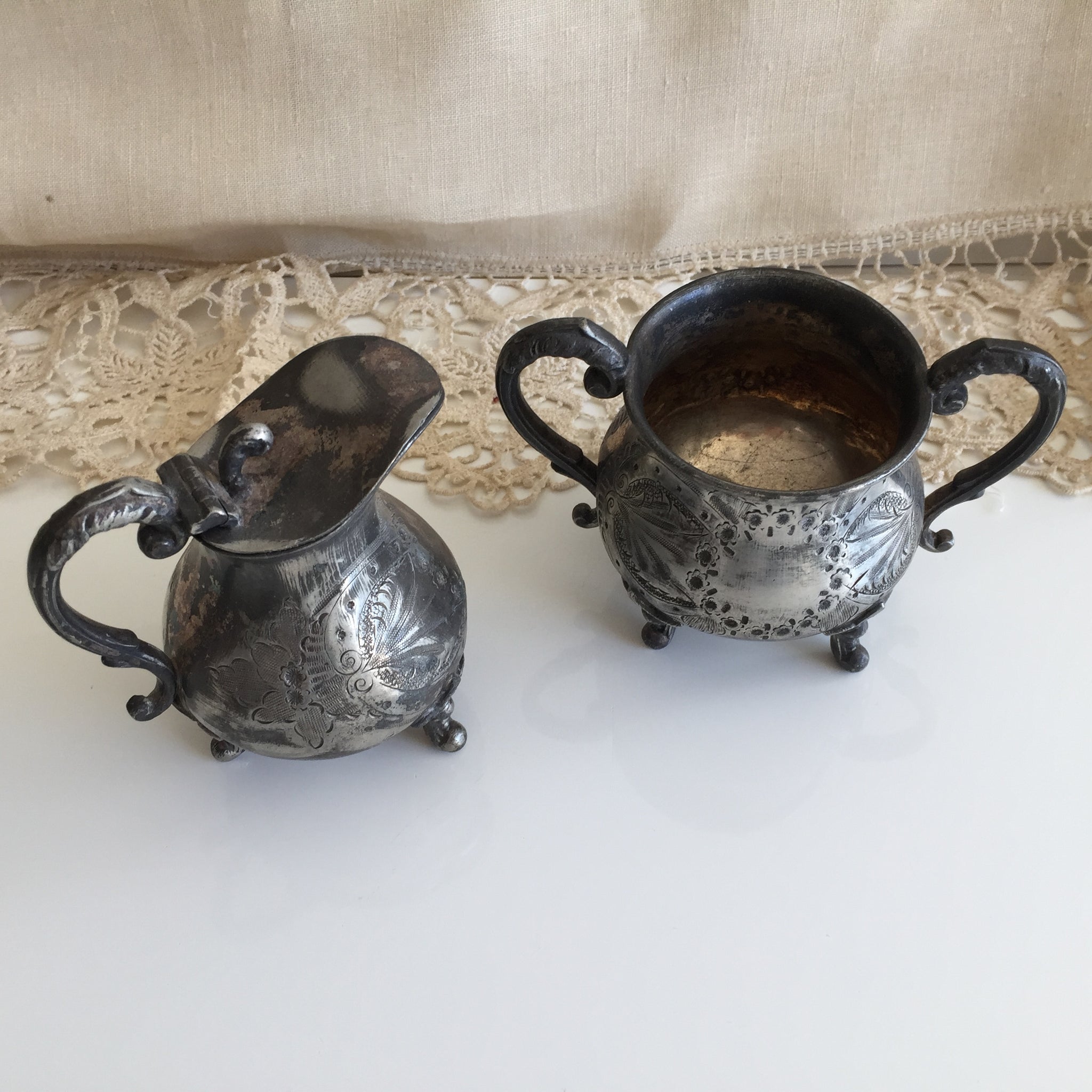Adorned with elaborate repoussé flourishes—delicate florals and scrollwork rendered in relief—each vessel commands attention as both functional tableware and decorative art. Supported by ornamental feet, they present an air of refined elegance befitting any period interior.