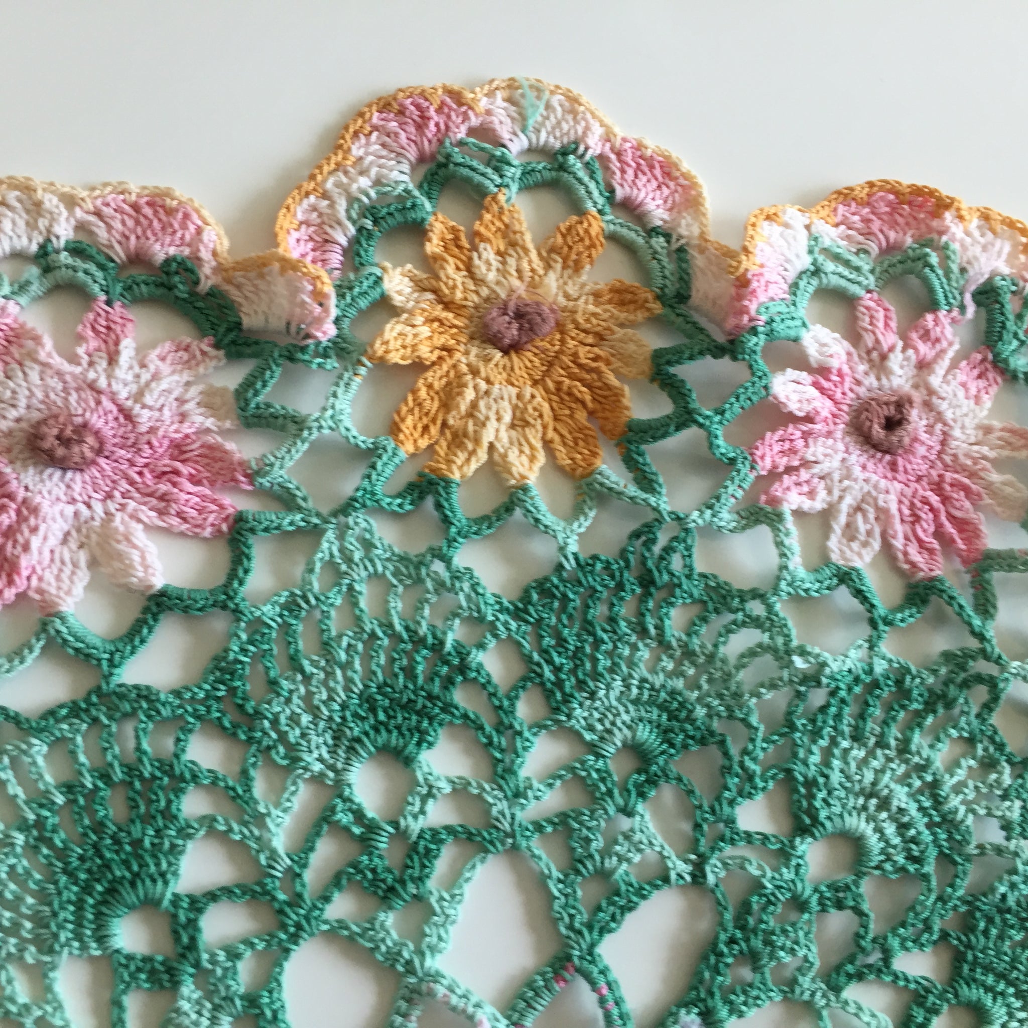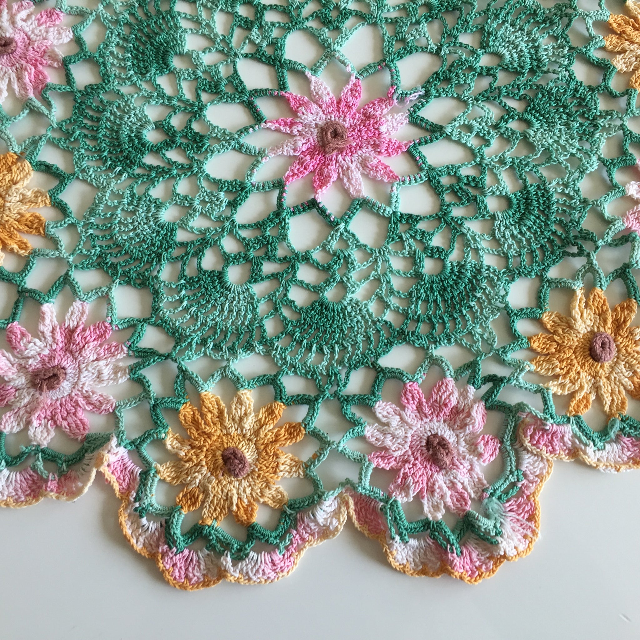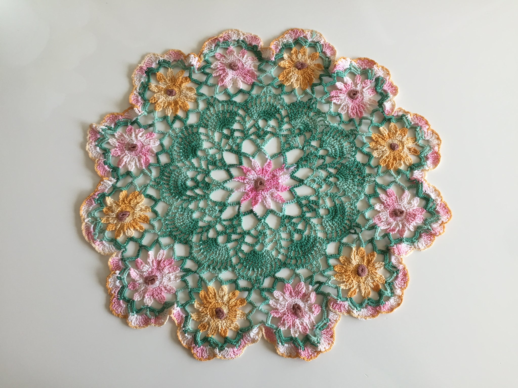 This lovely vintage doily with a stunning and rarely seen pattern was made of multicoloured cotton crochet thread featuring pink and orange flowers on a green backdrop. It is about 34 cm across (13.5 inches) at its widest points.