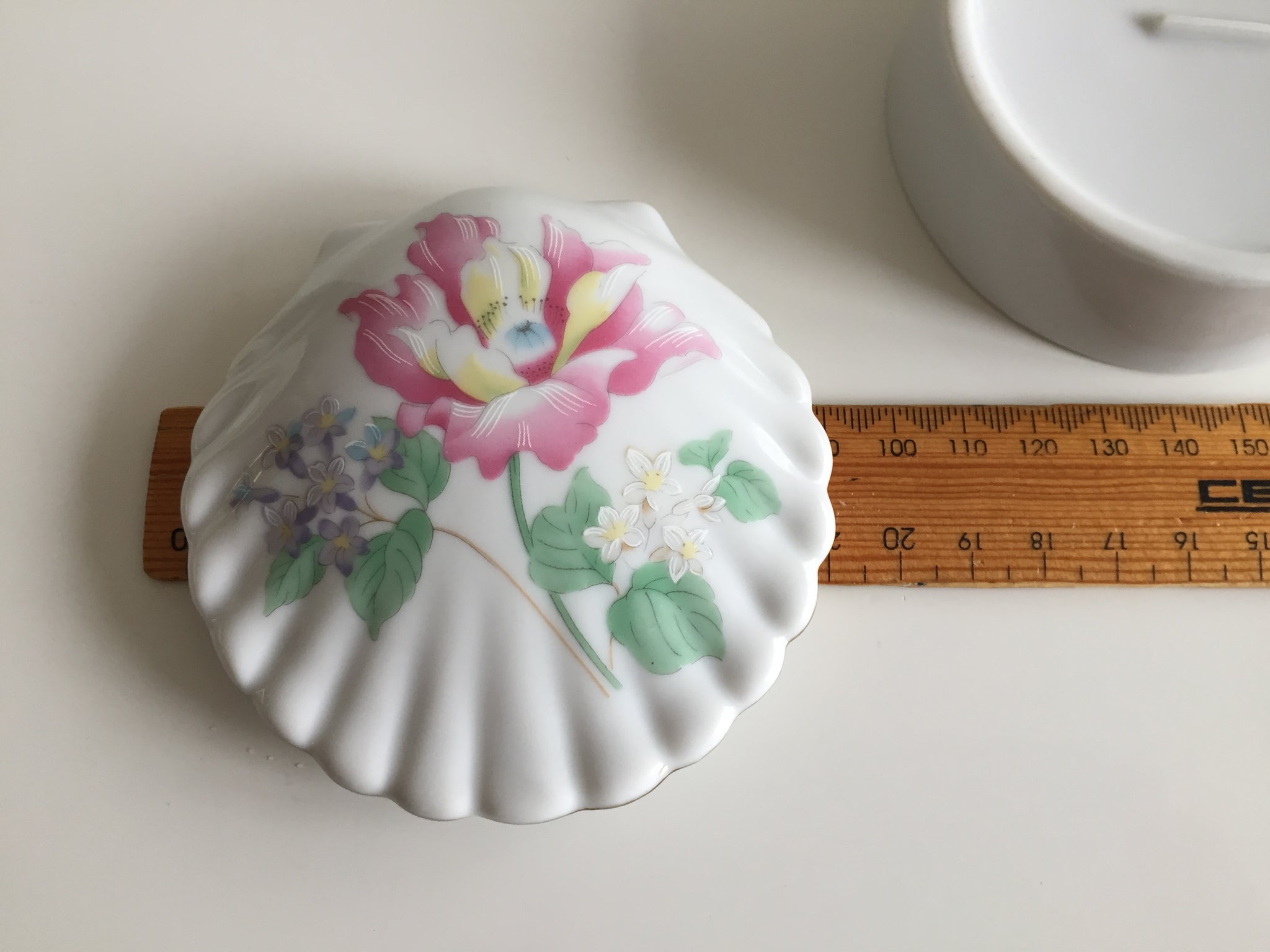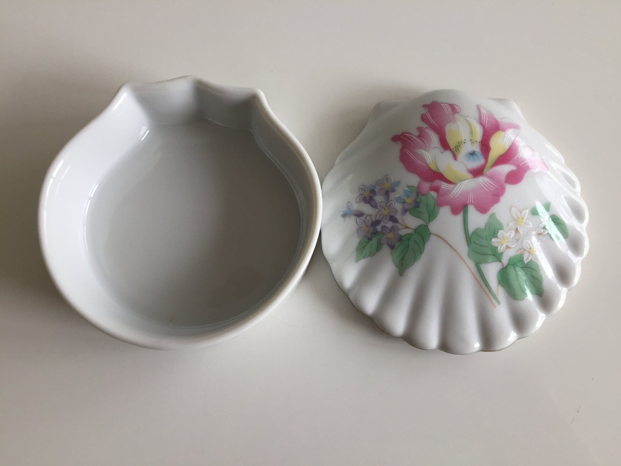This charming Japanese vintage bone china ring box captures the elegance of mid-20th century craftsmanship. Shaped like a delicate clam shell with hand-painted florals, it's a timeless treasure in excellent condition—perfect for storing precious rings or as a thoughtful gift. Measuring 9 x 4 cm, this piece exemplifies the quality and durability that defined vintage porcelain production.