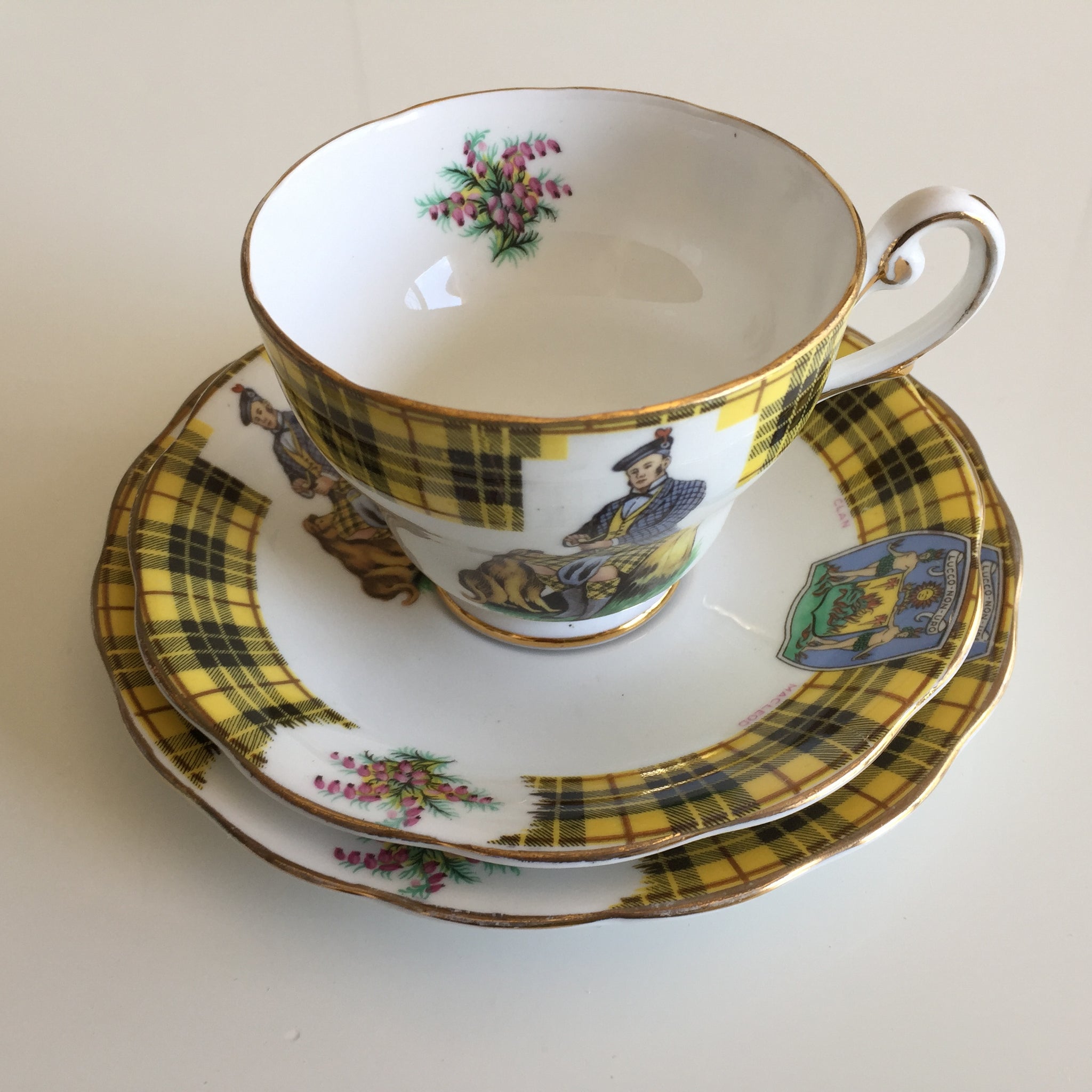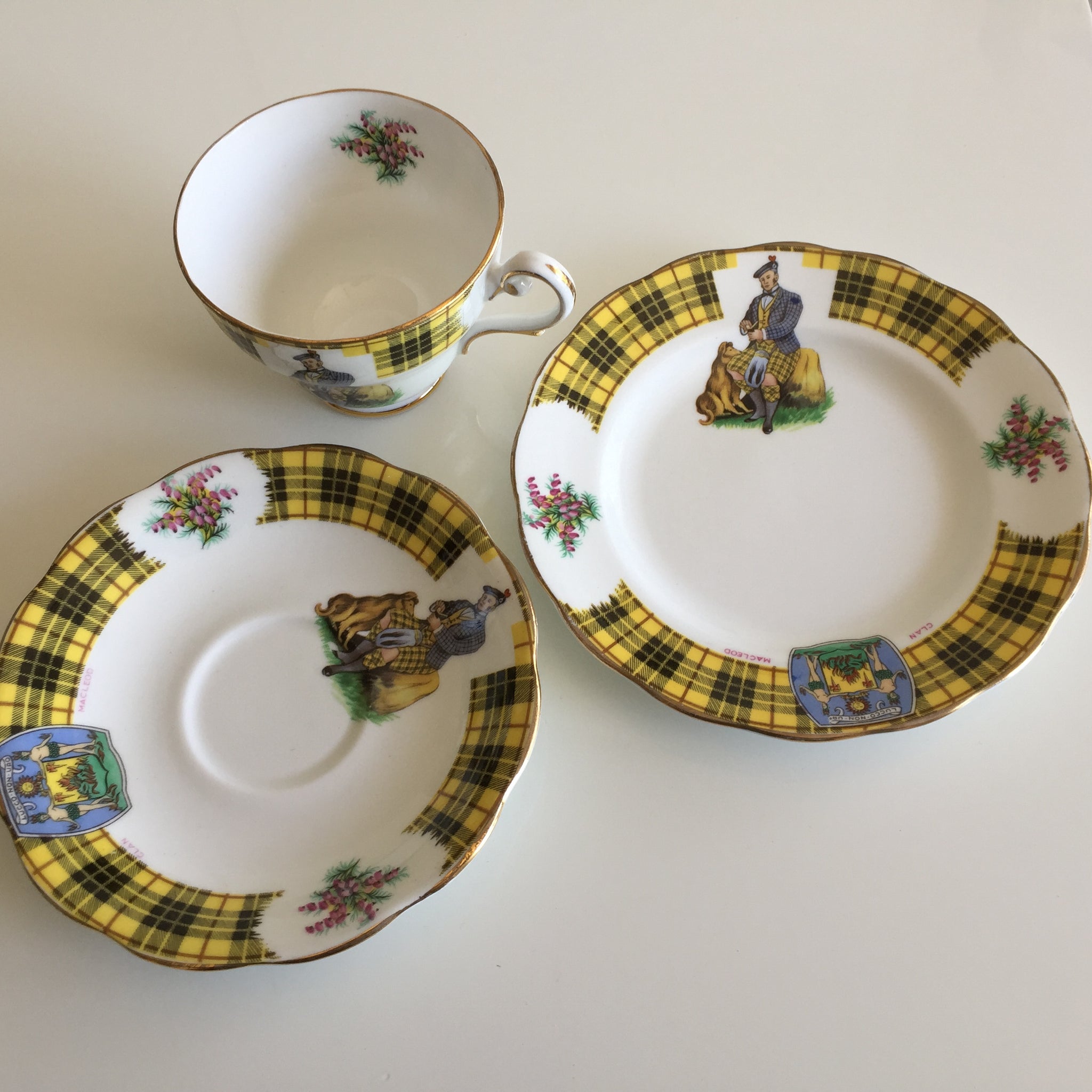 Gold-trimmed edges and the distinctive tartan stripe in yellow, black, and red add timeless elegance. Each piece—cup, saucer, and side plate—bears the Clan MacLeod insignia and depicts a kilted highlander in formal dress accompanied by a seated dog, evoking the romance of the Scottish Highlands.
