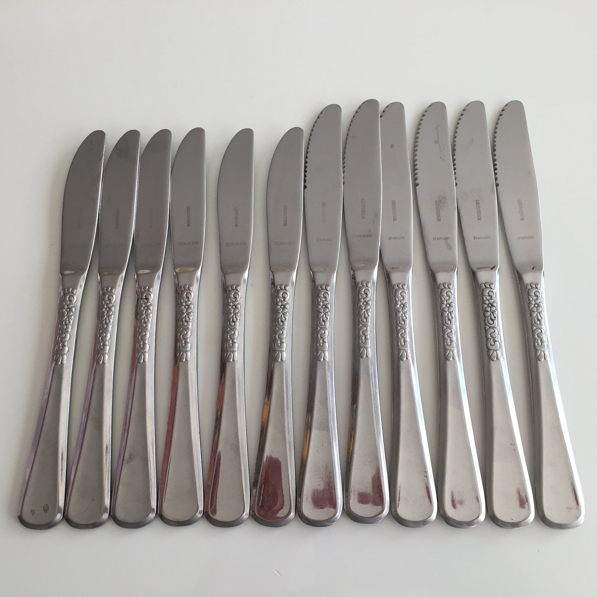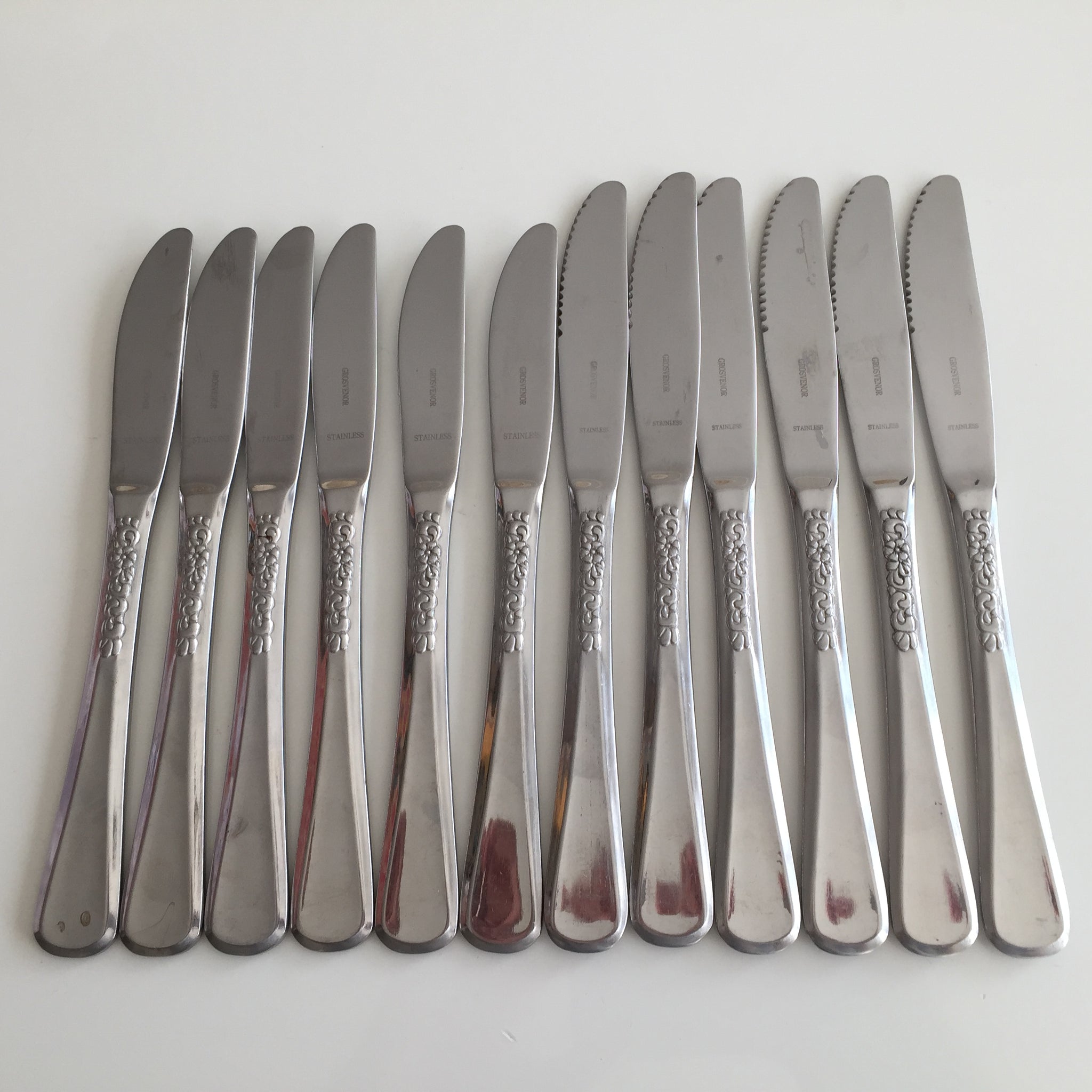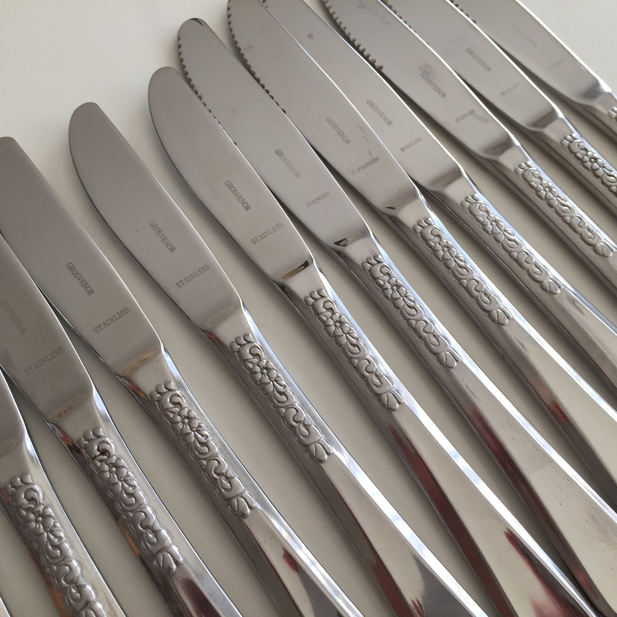 Great quality very popular stainless steel cutlery with the same classic vintage style floral pattern. 12 pieces in total, as shown in the photos (video is showing a range of other sets too). Come in two different sizes: Dinner and Luncheon.