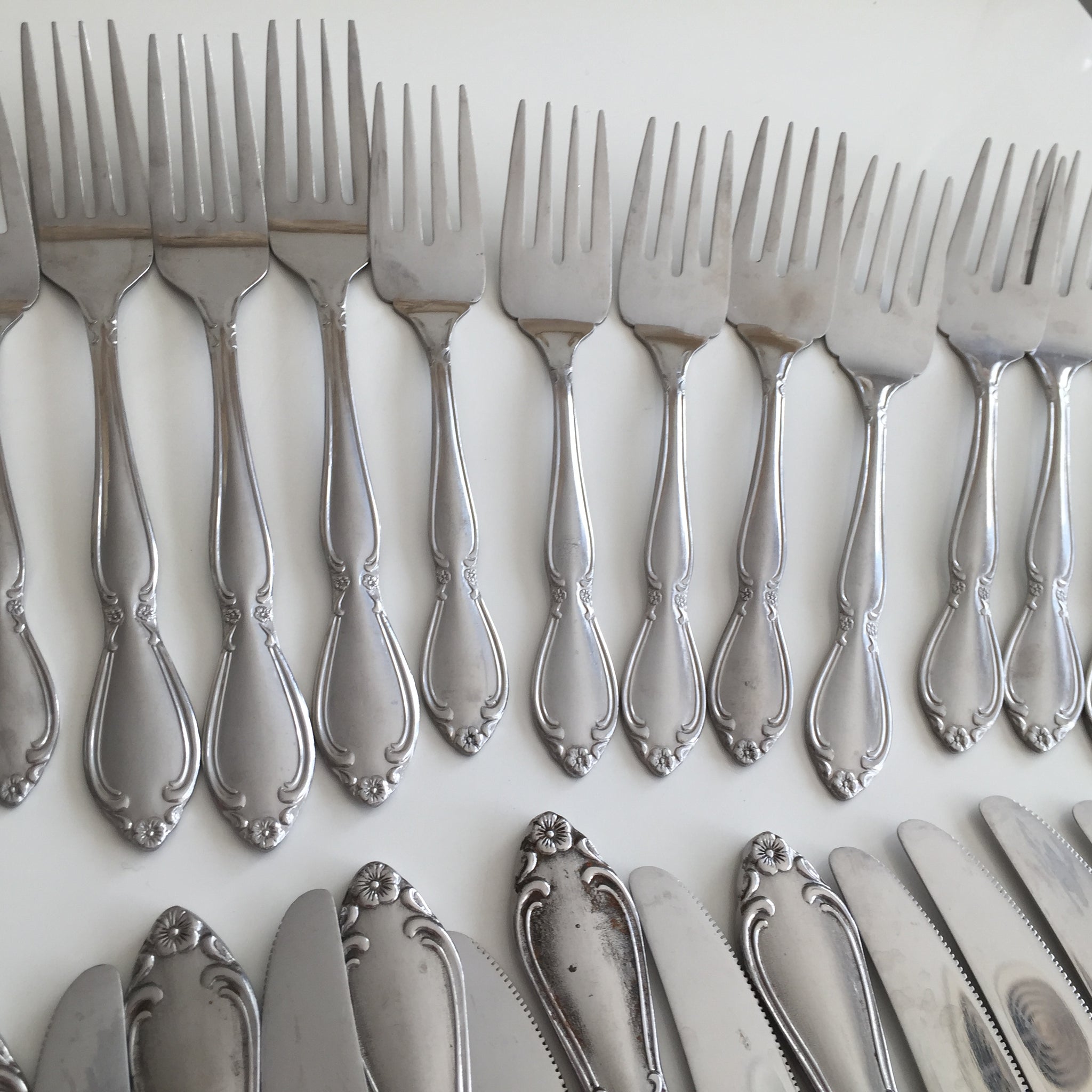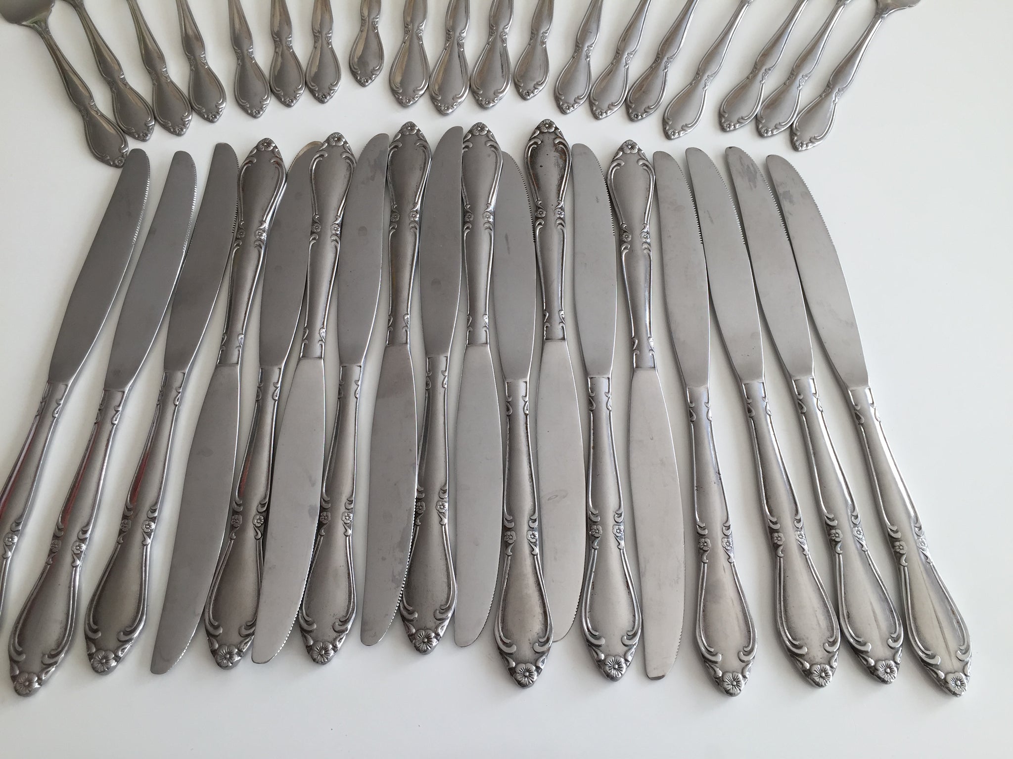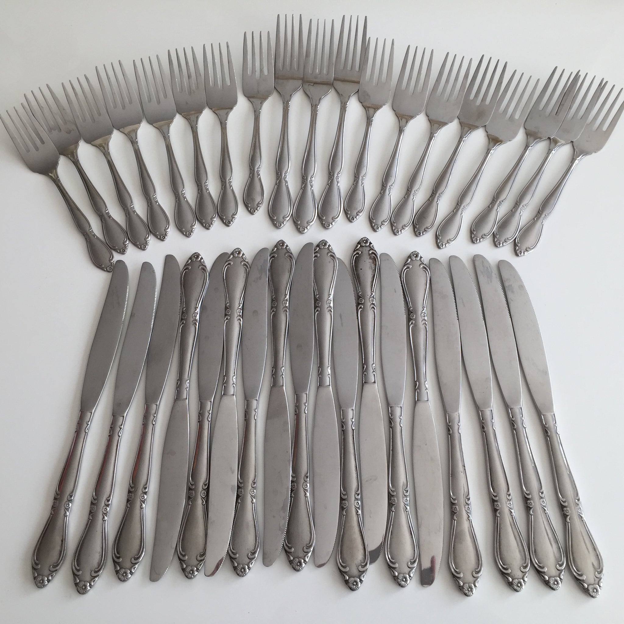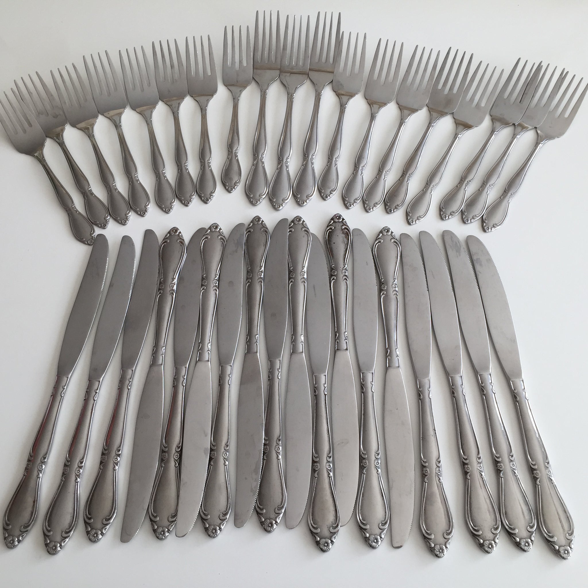 Are you planning a large gathering? Unbranded great quality stainless steel cutlery with the same classic vintage style floral pattern. 34 pieces in total, as shown in the images. Forks come in two different sizes, most are dessert/salad forks (shorter), 3 of them are full size. Will be great at a birthday party to serve cake.