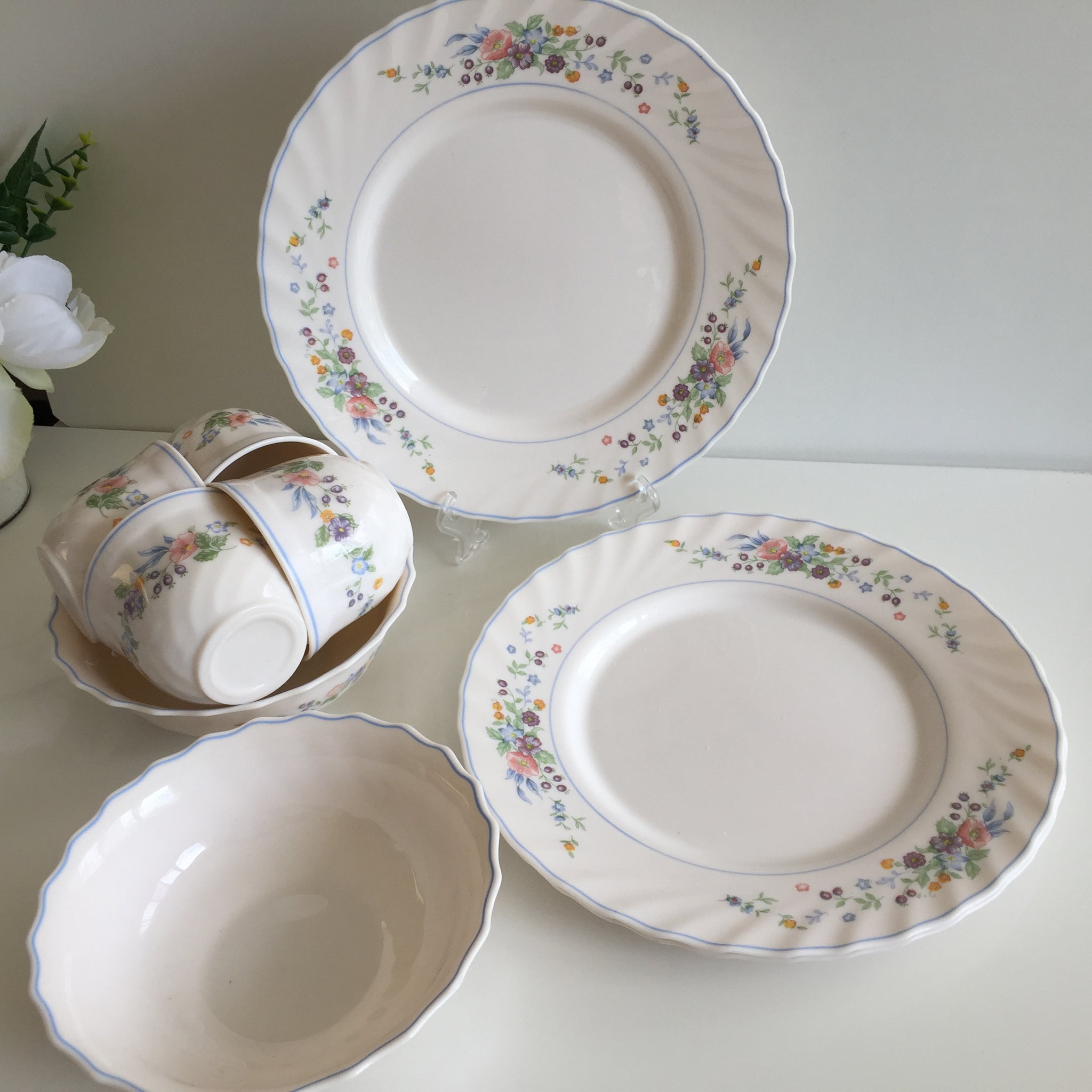 The comprehensive collection includes dinner plates (24.5 cm), versatile bowls (16 cm), charming teacups (8.5 x 6.5 cm), plus coordinating sugar bowl and creamer—everything needed to create a cohesive, sophisticated dining experience. All in excellent, gently used vintage condition.