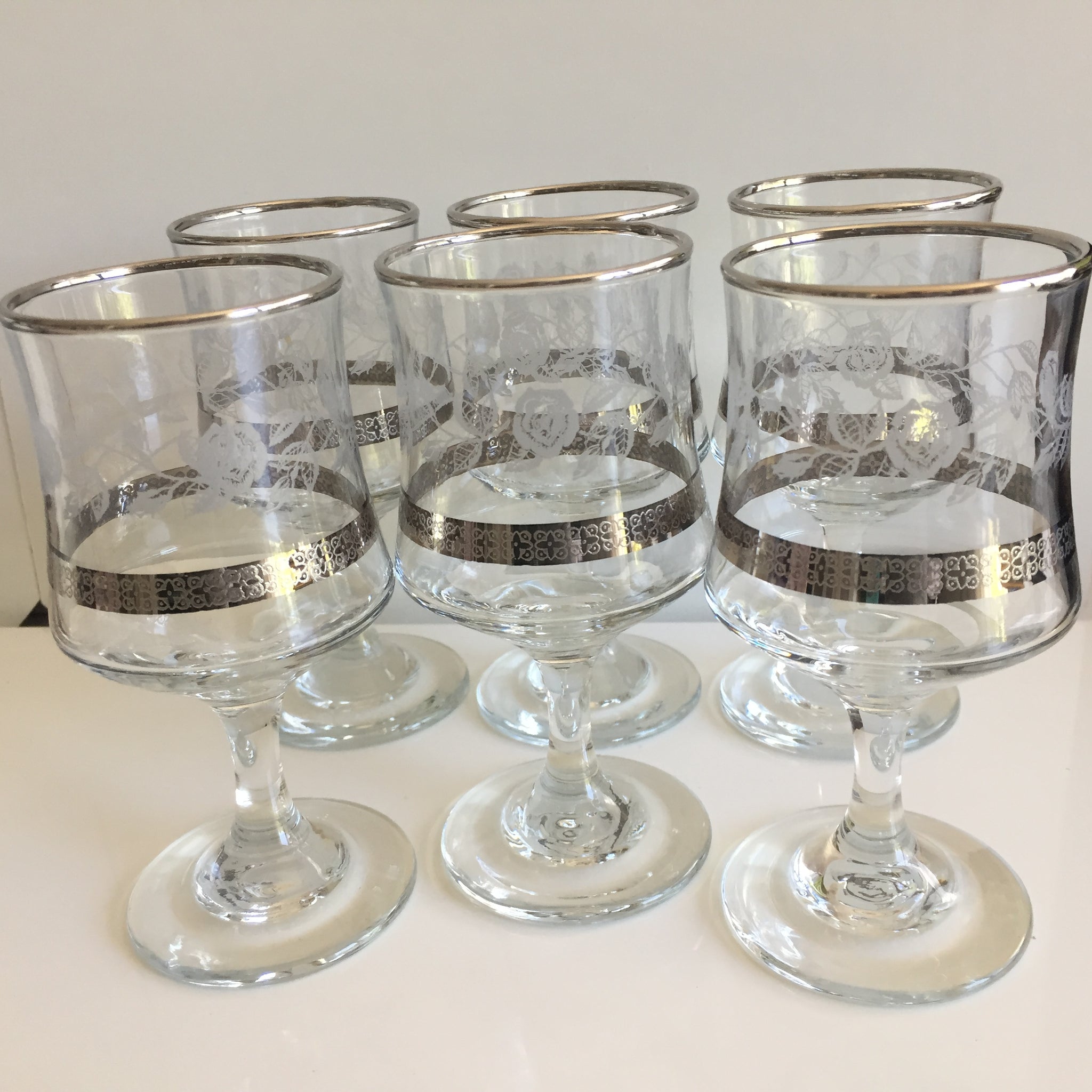 This exquisite set of six Dema Silver Rose glasses transports your table to 1970s British elegance. Each piece showcases a delicate etched white-rose design crowned with a lustrous polished silver rim that catches the light with every sip.