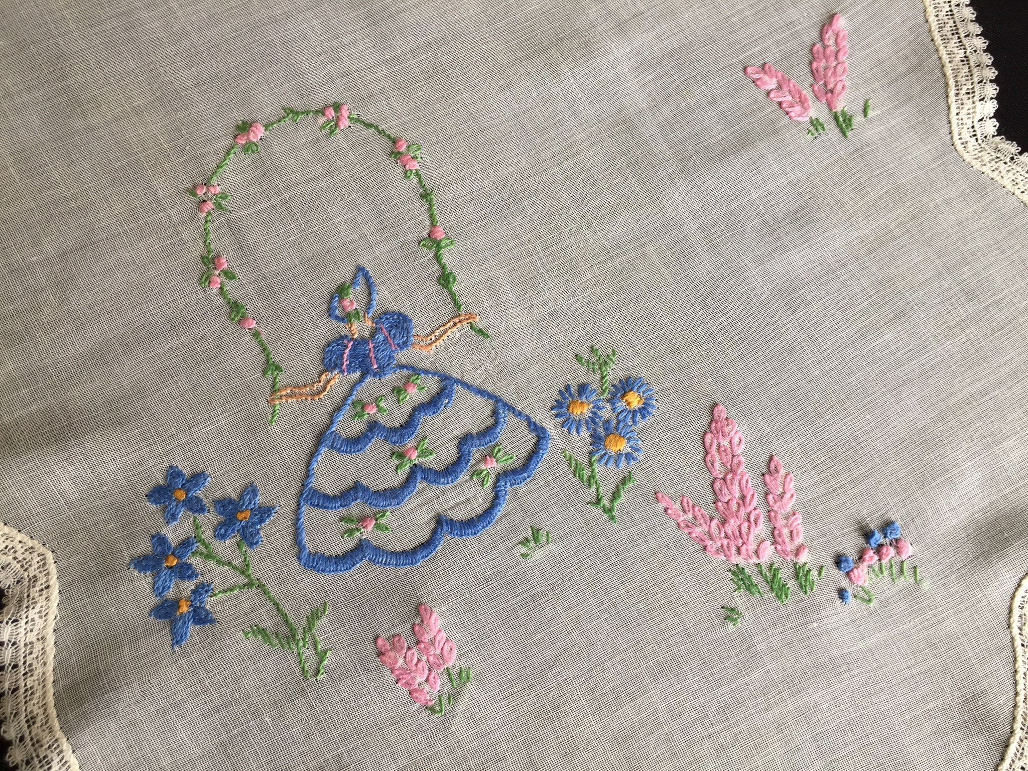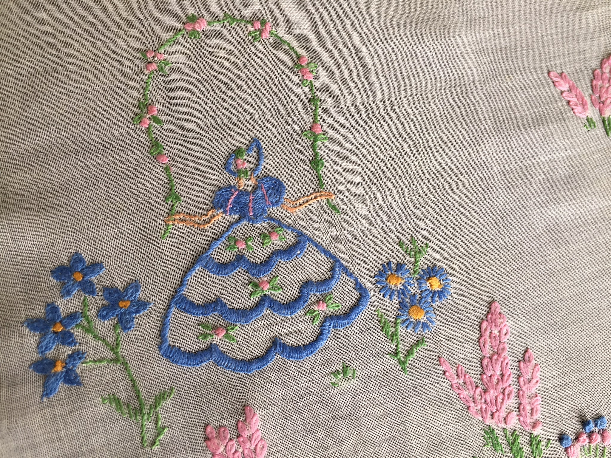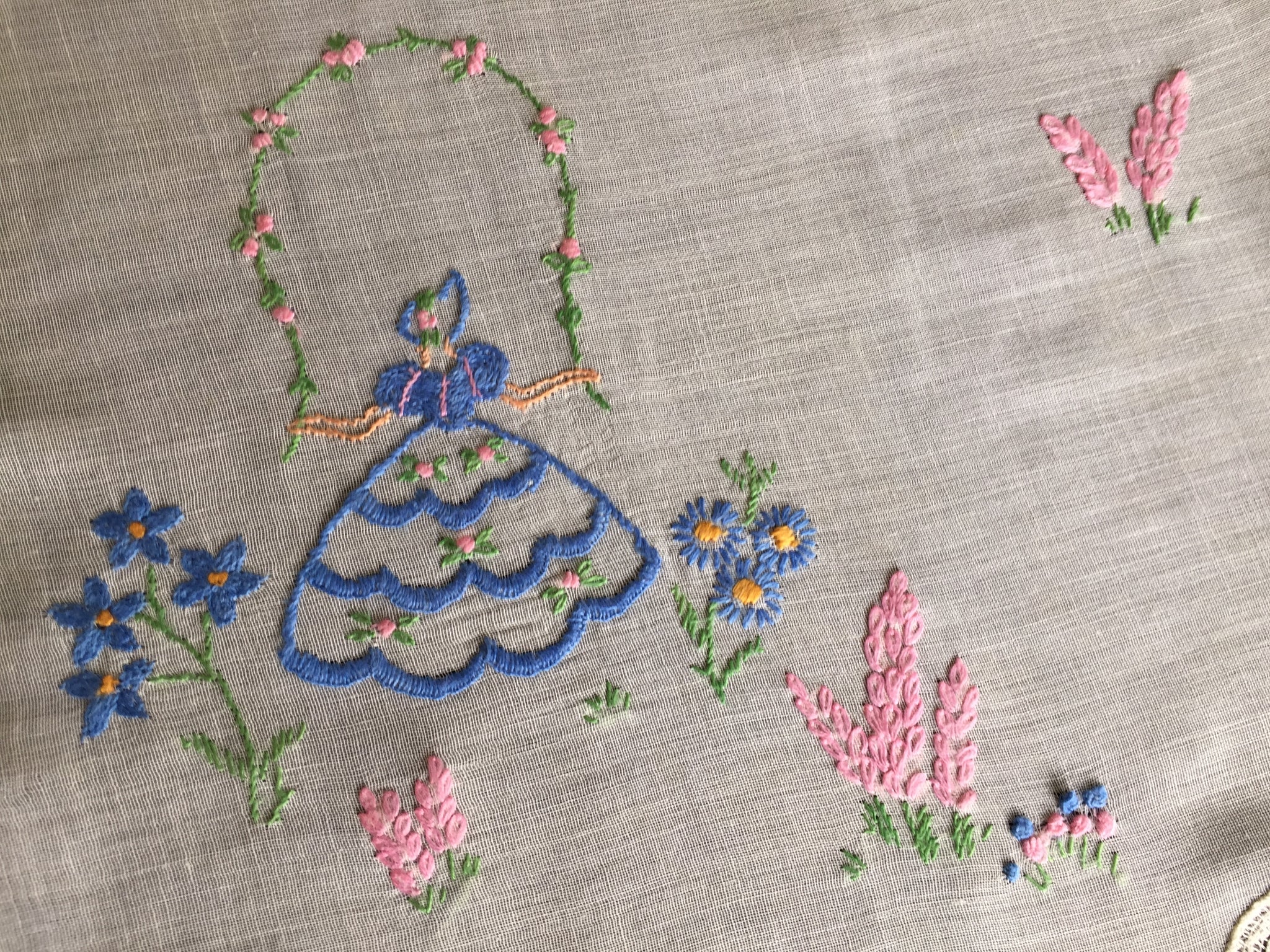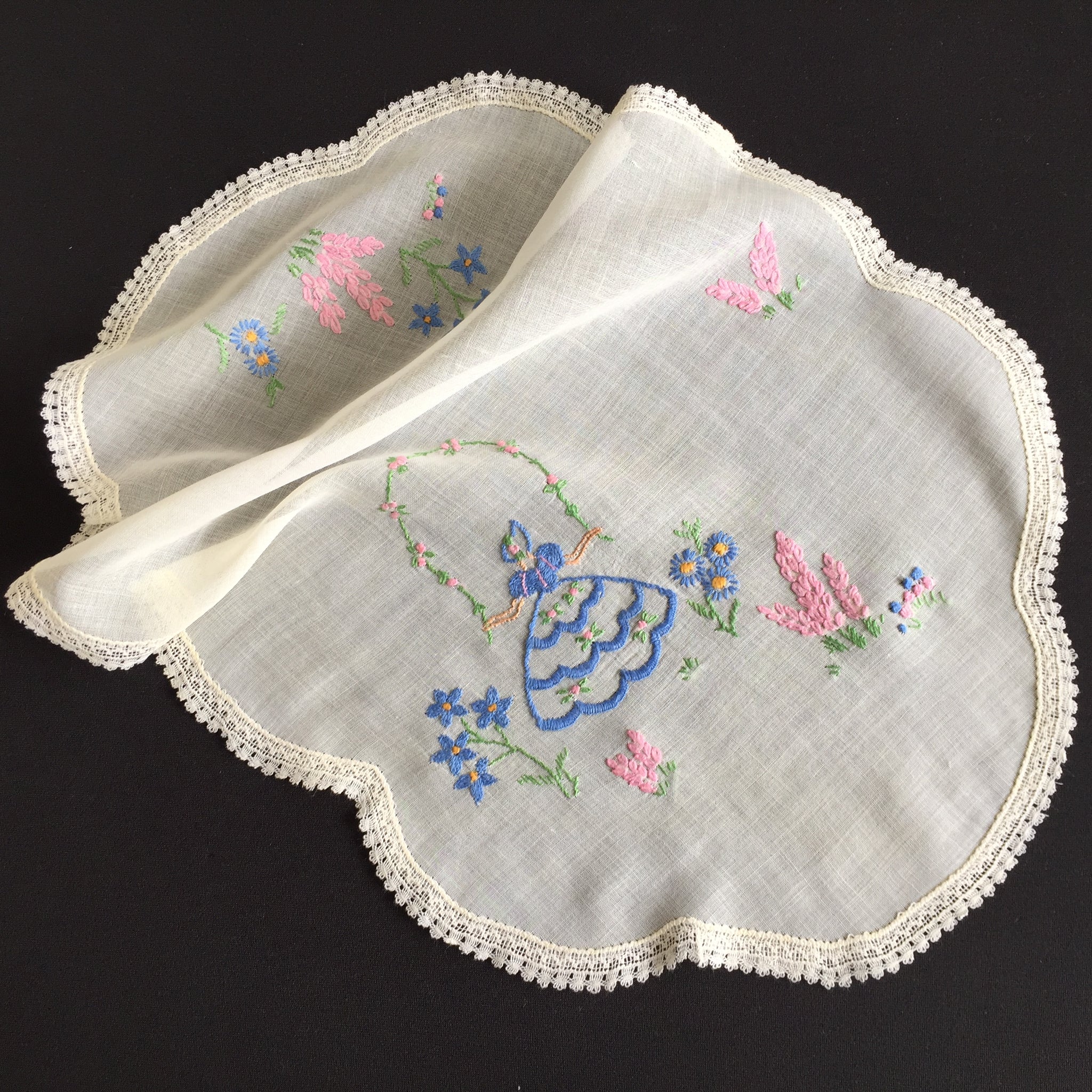 This exquisite hand-embroidered doily captures a romantic garden scene with a crinoline lady, crafted on soft off-white muslin and trimmed with delicate cotton lace. Measuring 42 x 29 cm (16.5 x 11.5 inches), it's a versatile piece perfect as a table centre, placemat, or tray cloth. AN additional two small doilies are also available featuring some of the floral motifs that also appear on the placemat.