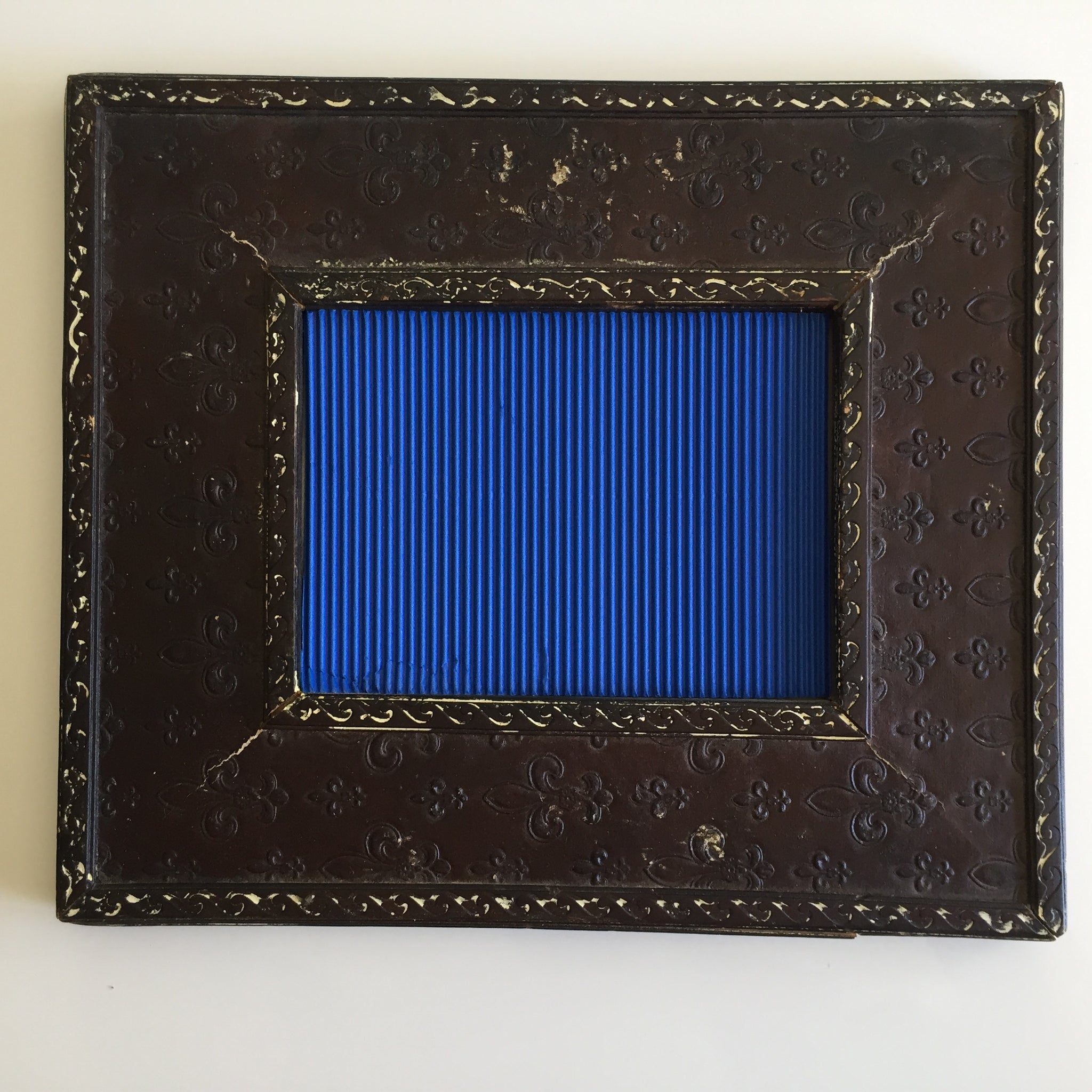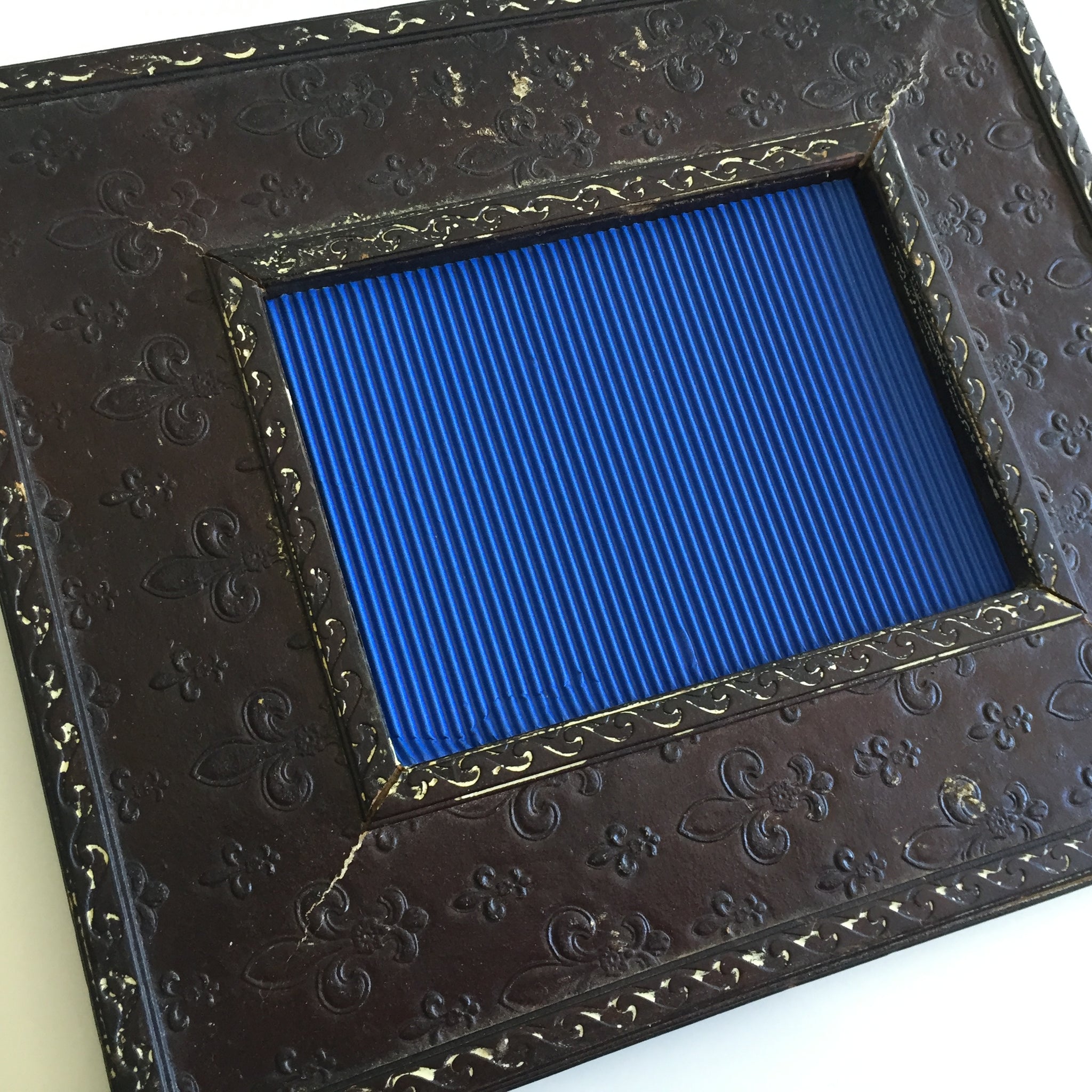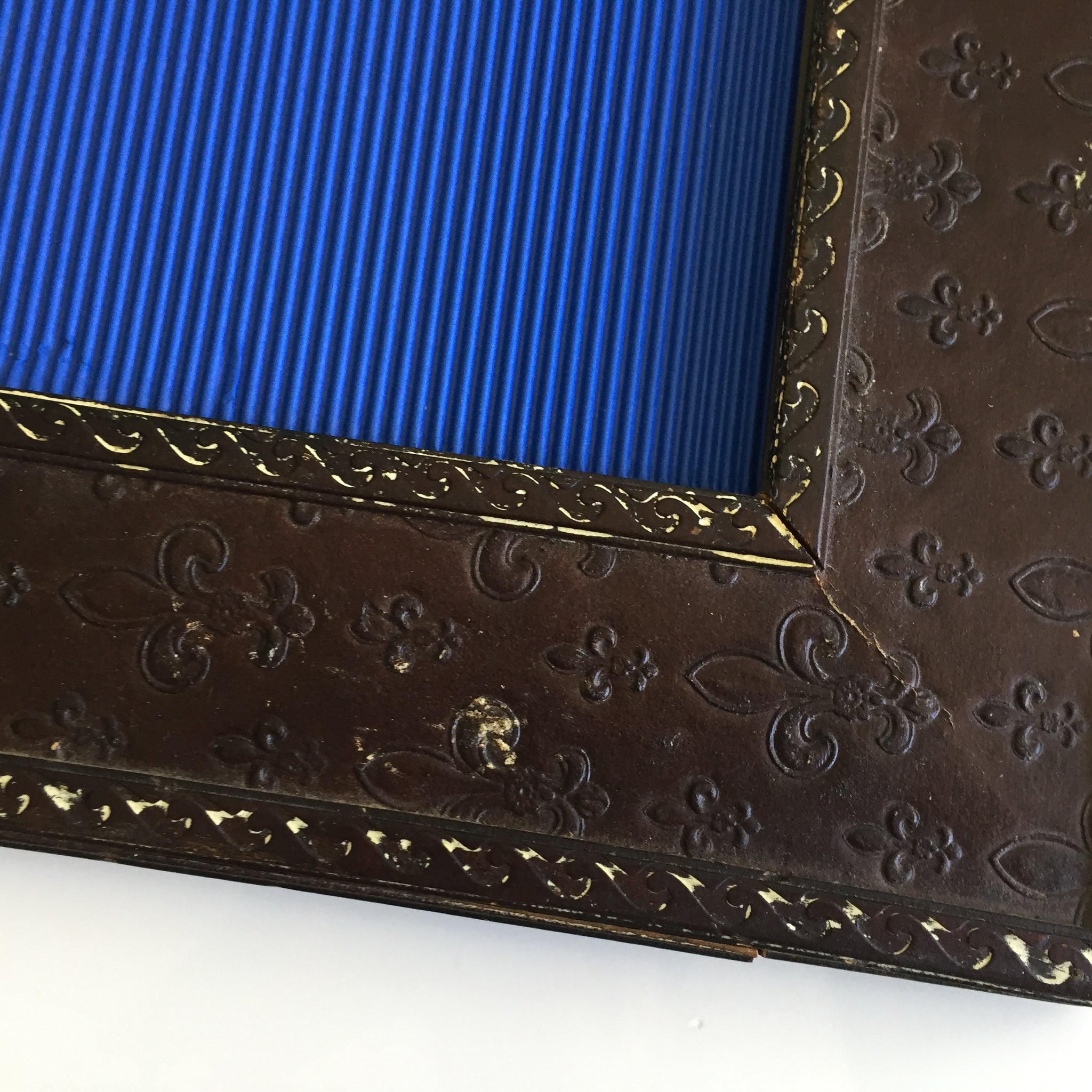 Late 19th or early 20th century antique imitation leather (wax paper on wood) photo frame for displaying photos up to 17 x 13 cm, while the outer measurements ar 31 x 26 cm approximately. The glass behind the corrugated cardboard insert is intact and will protect your precious photos, it has original hardware on the back to hang on the wall, but the back foot to prop it up on the shelf is missing..