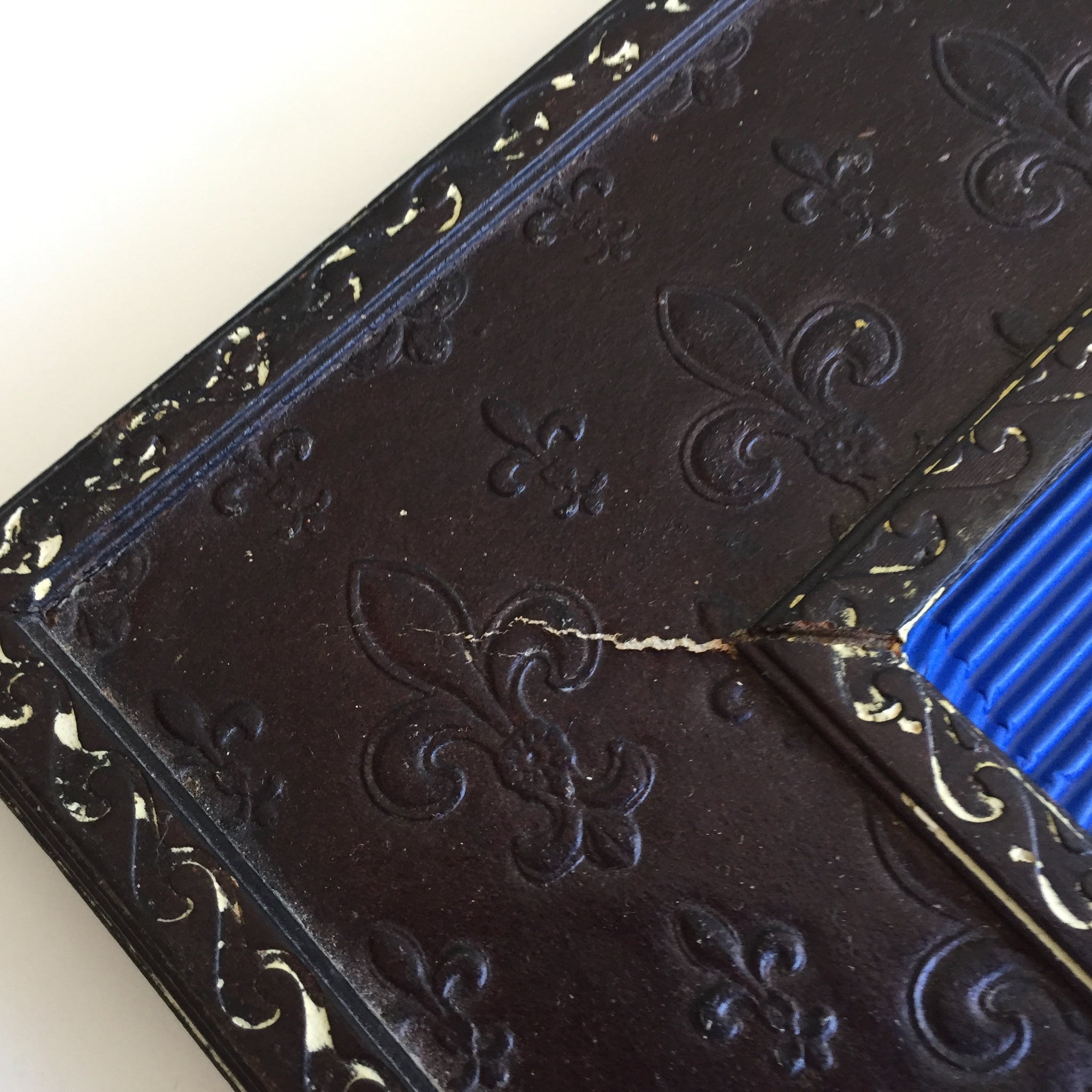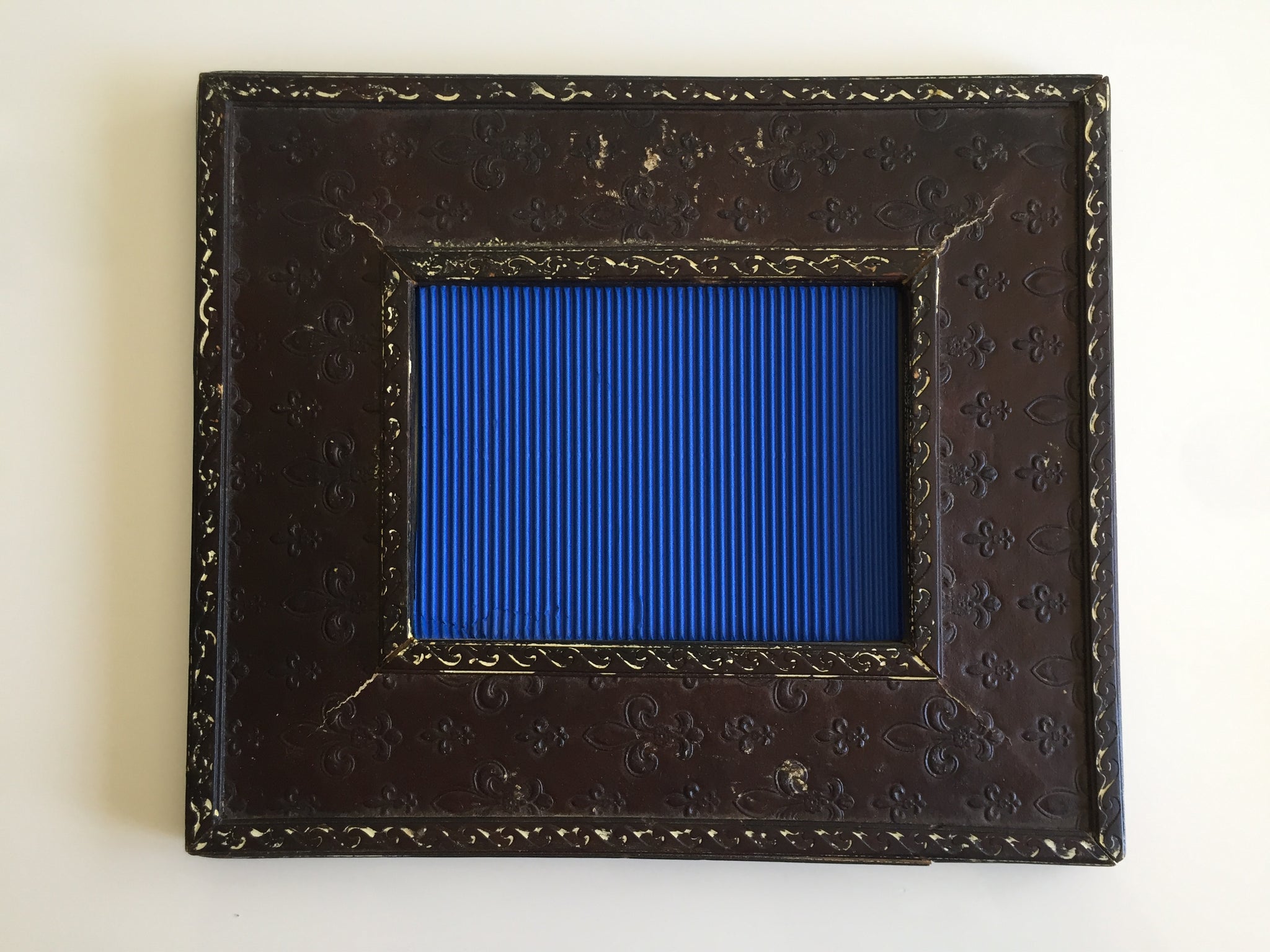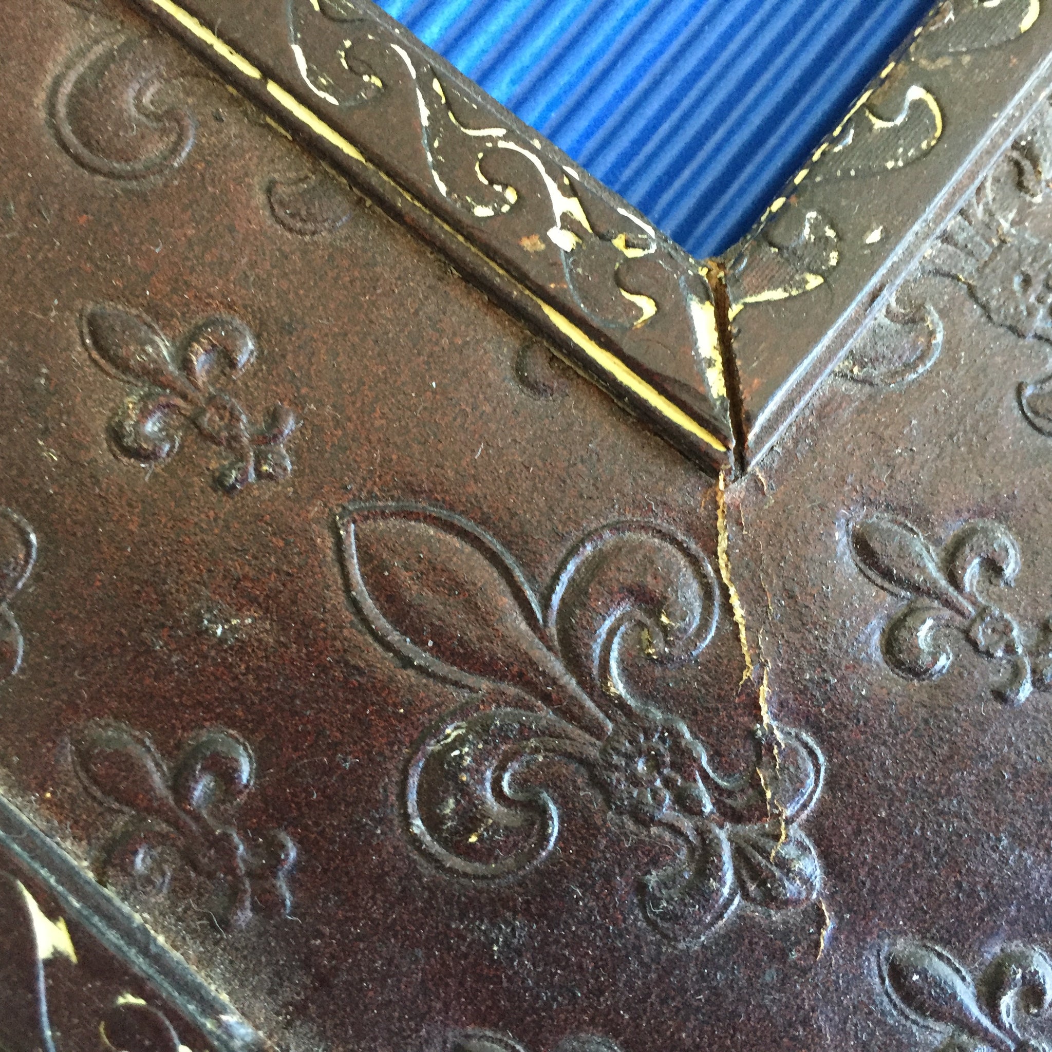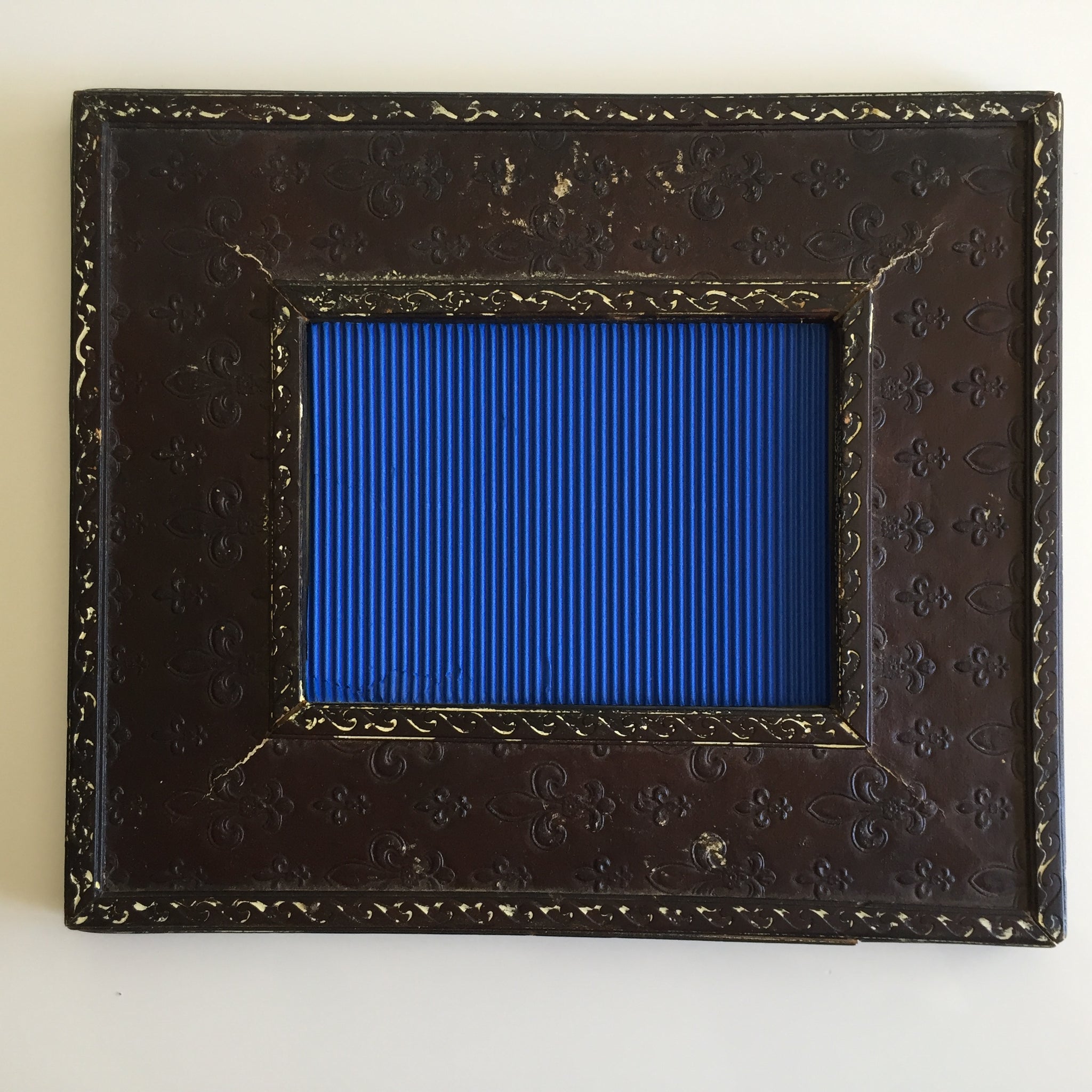 Late 19th or early 20th century antique imitation leather (wax paper on wood) photo frame for displaying photos up to 17 x 13 cm, while the outer measurements ar 31 x 26 cm approximately. The glass behind the corrugated cardboard insert is intact and will protect your precious photos, it has original hardware on the back to hang on the wall, but the back foot to prop it up on the shelf is missing..