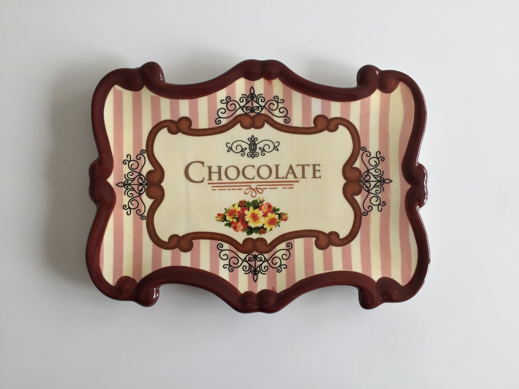 Elevate your table setting with this vintage-inspired design, this decorative piece crafted from porcelain ceramic showcasing a pink and cream striped background accented by floral details and elegant scrollwork. The central label, which features the word "CHOCOLATE," is part of a larger collection of themed tableware that often includes matching mugs, plates, and bowls with similar brown, pink, and polka-dot motifs.