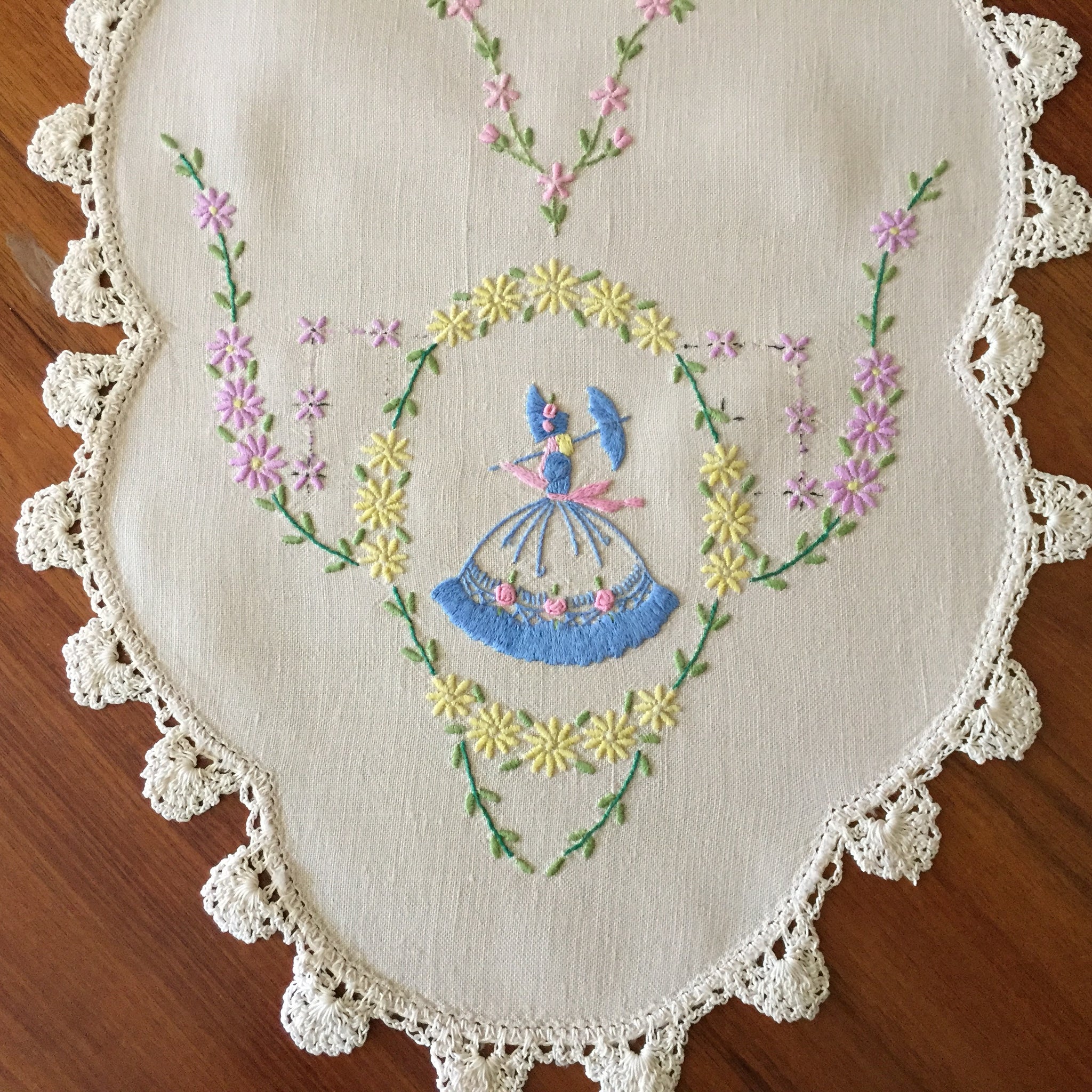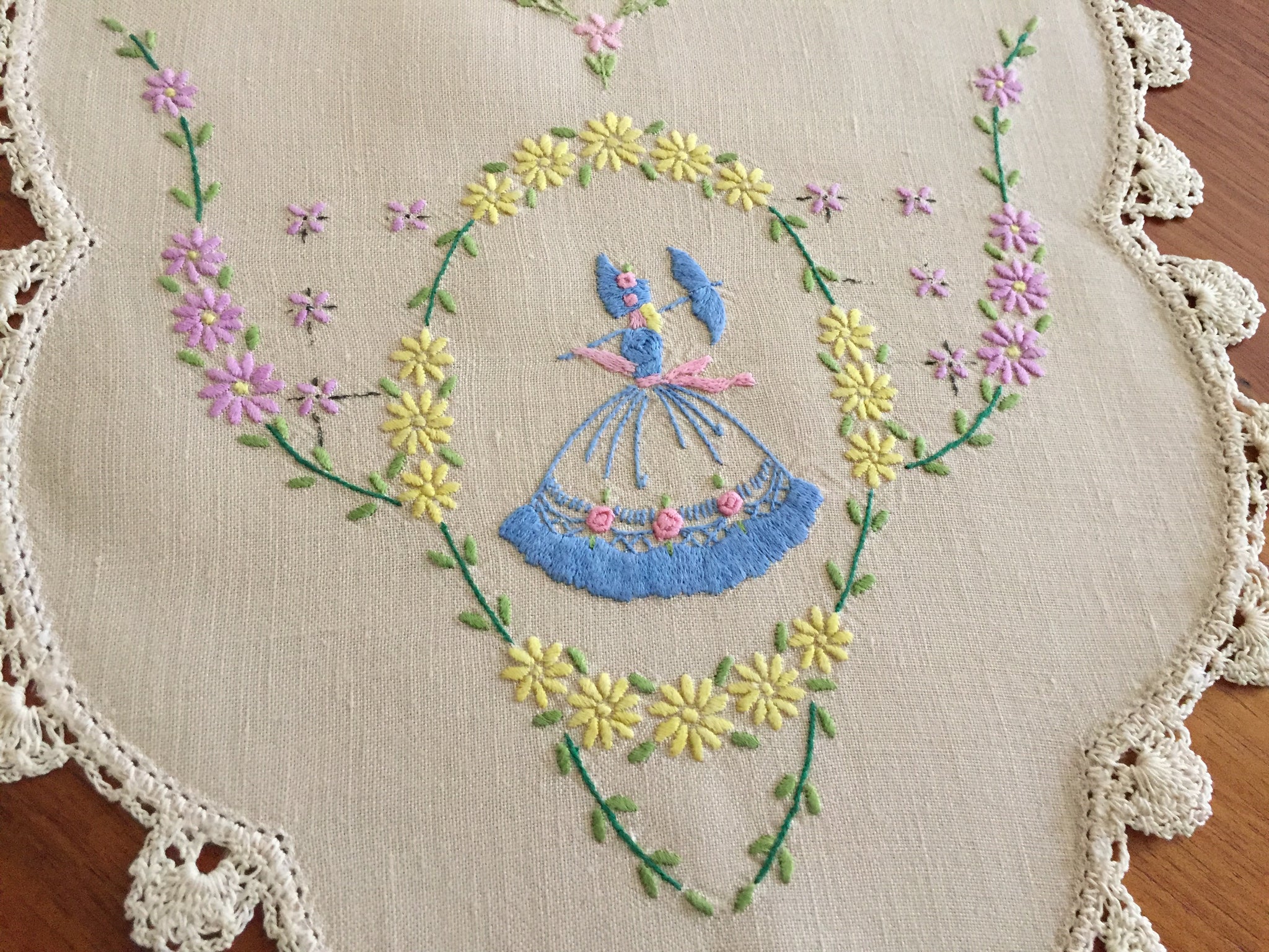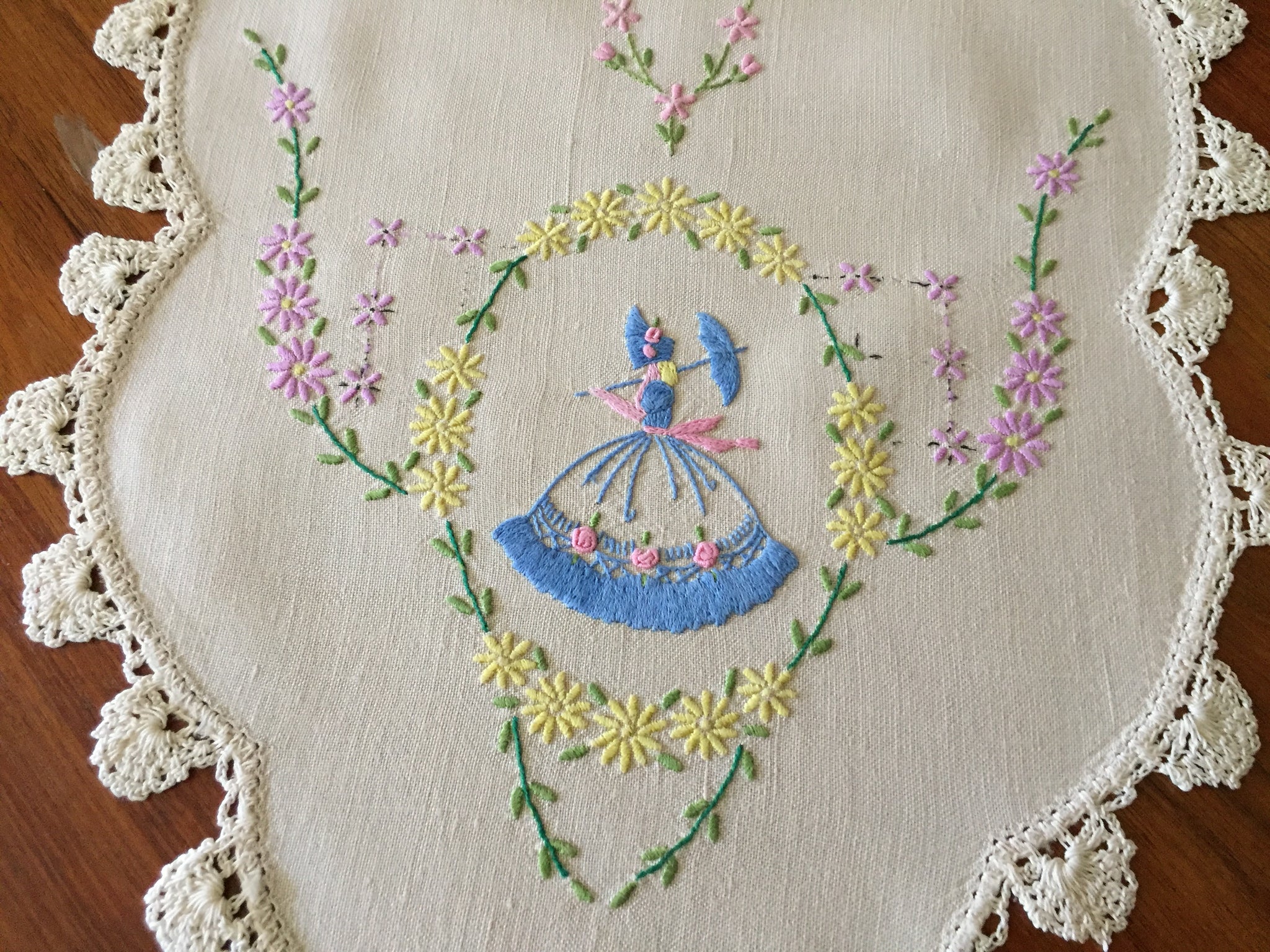 Discover the timeless elegance of this vintage embroidered linen table runner, featuring an exquisite crinoline lady design on premium beige linen. Measuring 86 x 30 cm (34 x 12 inches) with gracefully rounded corners, it's finished with delicate crocheted cotton edging. In good vintage condition with minor embroidery thread loss that adds authentic character, this handcrafted piece represents quality craftsmanship from a bygone era.